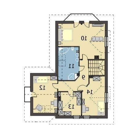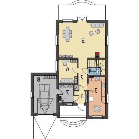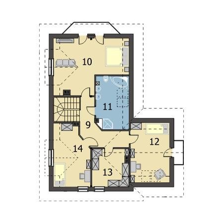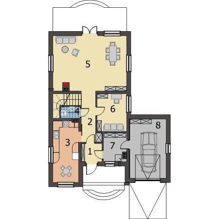 Niedźwiedź jest domem jednorodzinnym bez podpiwniczenia, z wysokim użytkowym poddaszem, przeznaczonym dla 4-6 osobowej rodziny. Dom ma zwartą bryłę opartą na planie litery L z garażem jednostanowiskowym, w bryle budynku. Projekt Niedźwiedź to wygodny dom, pokryty dachem wielospadowym o kącie nachylenia 45⁰. Na parterze usytuowany jest przestronny salon z kominkiem i jadalnią, duża wygodna kuchnia, gabinet, WC oraz kotłownia łącząca część mieszkalną z garażem. Na poddaszu znajduje się przytulna sypialnia, dwa mniejsze pokoje, pojemna garderoba oraz okazała łazienka z wanną i prysznicem. W projekcie Niedźwiedź przewidziano ogrzewanie gazowe. Istnieje możliwość modyfikacji systemu ogrzewania na etapie adaptacji.
