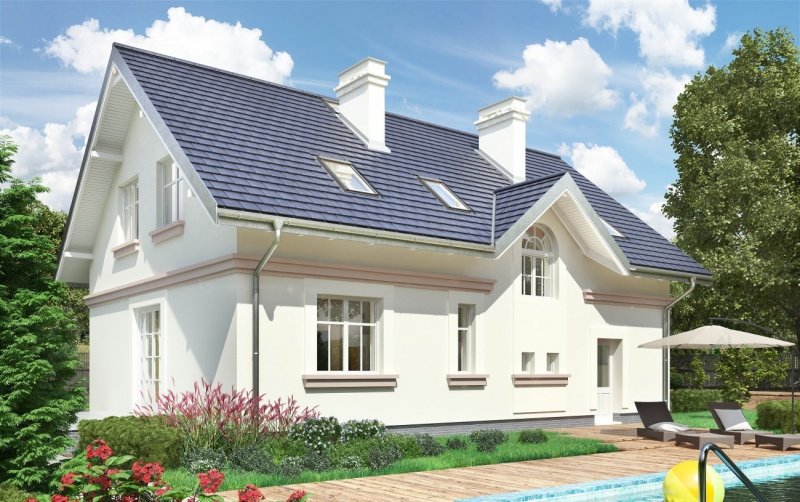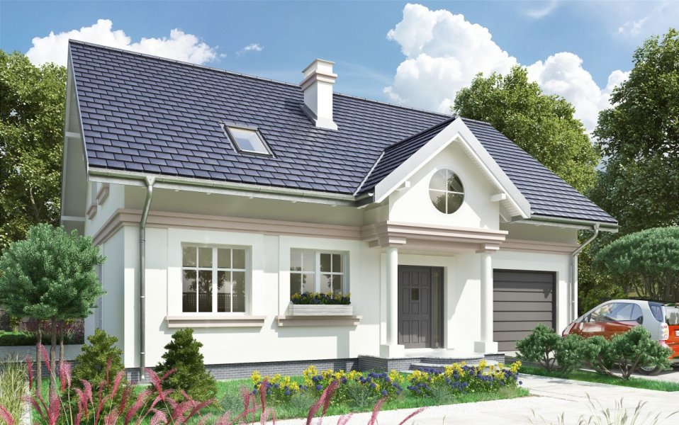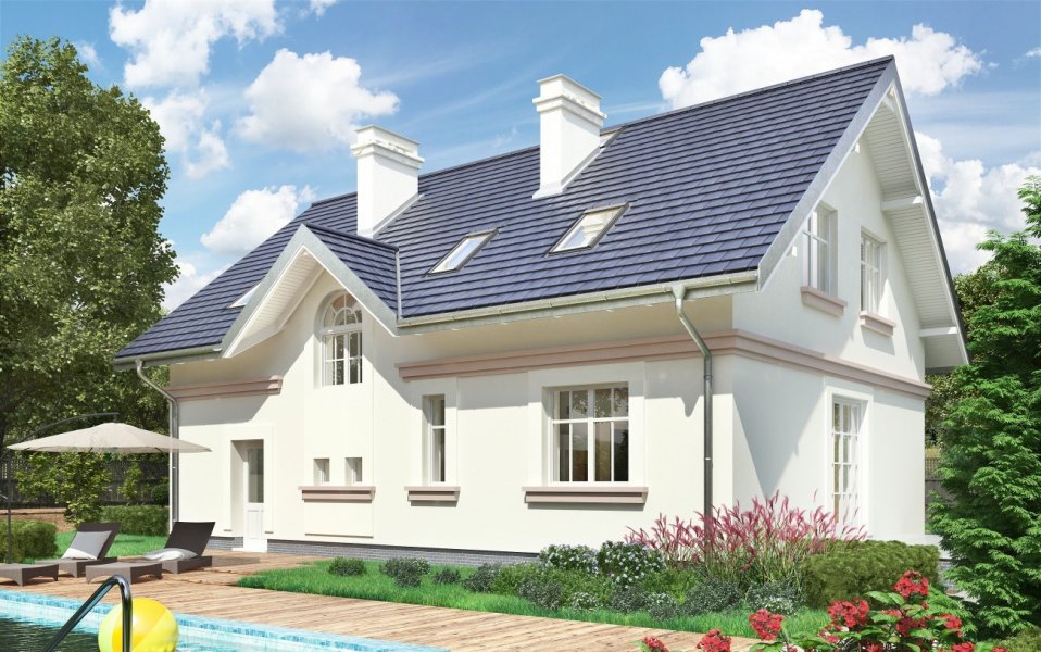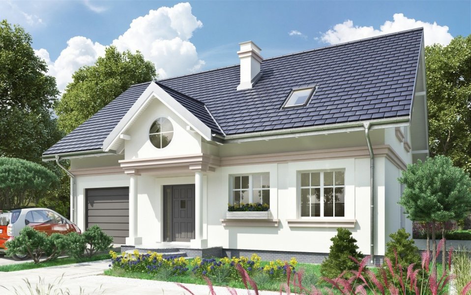 Dla zwolenników oszczędnych, ale przy tym tradycyjnych i eleganckich rozwiązań dobrą propozycją jest projekt domu Nowy Dworek. Prosta zwarta bryła na energooszczędnym, prostokątnym planie o ładnych proporcjach, bez balkonów, przekryta została dachem dwuspadowym z kalenicą równoległą do drogi dojazdowej. Mieści mieszkanie dla pięciu osób i część gospodarczą, rozdzielone od frontu wejściowym portykiem kolumnowym. Dom wyróżnia się dużą, oddzielną kuchnią z miejscem na stół jadalniany i salonem odseparowanym od wygodnego holu z małą łazienką, ze schodami i przejściem do sporej kotłowni. Znajduje się ona na tyłach wyjątkowo szerokiego garażu łączącego się z mieszkaniem przez sień. Na poddaszu projekt domu Nowy Dworek oferuje miejsce na cztery sypialnie doświetlone tradycyjnymi oknami w ścianach szczytowych, pralnię i drugą łazienkę. Mała lukarna od ogrodu, przez duże okno wpuszcza sporo światła do strefy komunikacji zarówno na parterze jak i na poddaszu. Historyzujący charakter architektury podkreślono w wizualizacji gzymsem na wysokości stropu, podokiennikami i dekoracyjnymi opaskami wokół otworów dzielonych w przeszkleniu na małe kwatery.