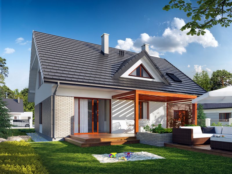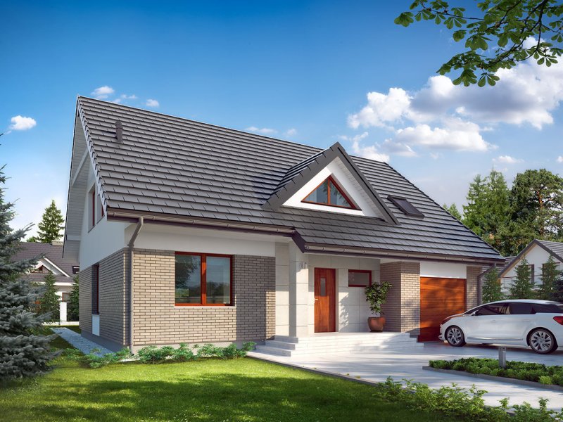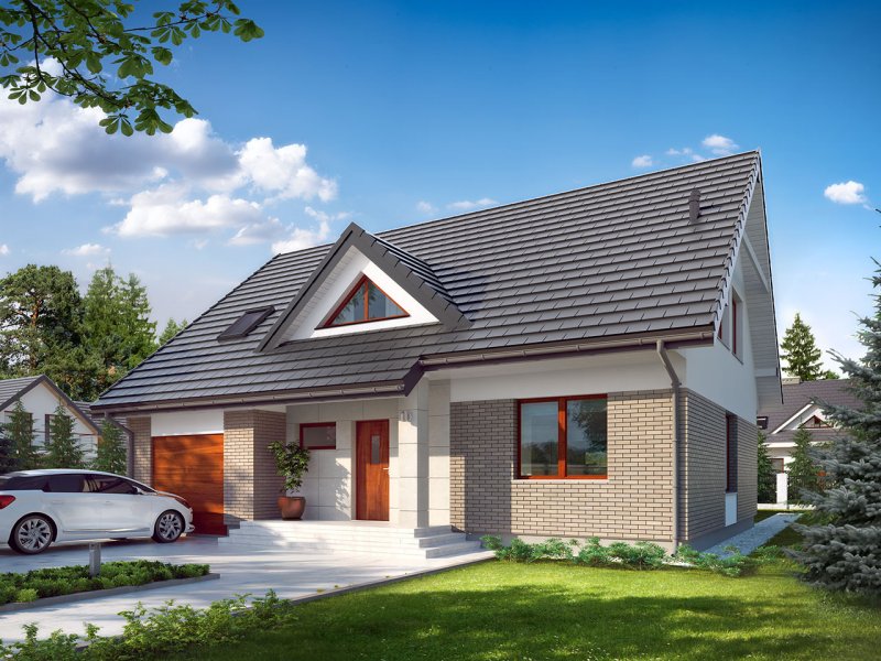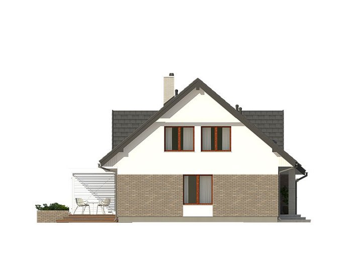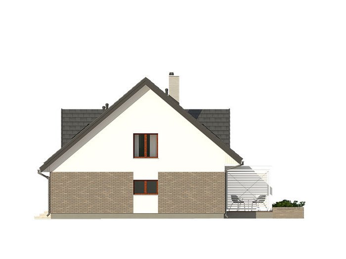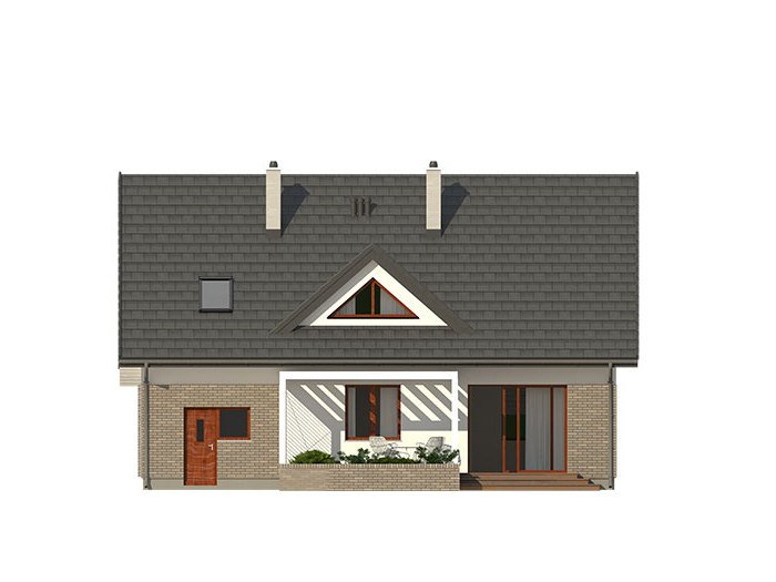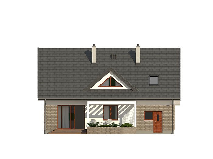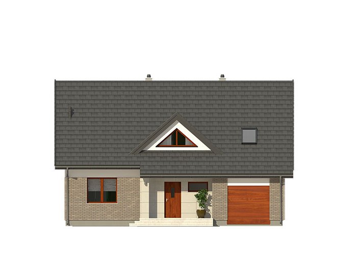 Dom jednorodzinny, parterowy z użytkowym poddaszem, z jednostanowiskowym garażem. W prostej bryle przykrytej dwuspadowym dachem zamknięto przestronne i funkcjonalne wnętrze. Obniżony strop nad garażem wydatnie powiększa przestrzeń w sypialni rodziców, która jest funkcjonalnie odizolowana od pokoi dzieci. Daje to poczucie spokoju oraz intymności. Garderobę, dostępną z korytarza, można zaadaptować na pralnię