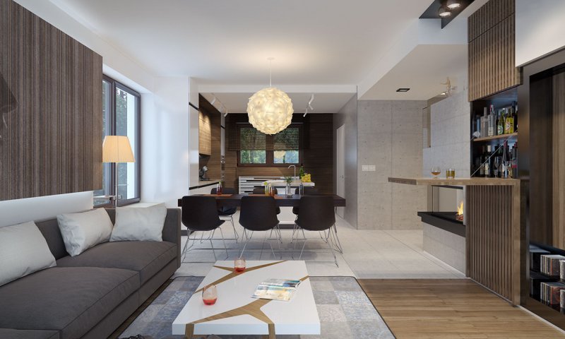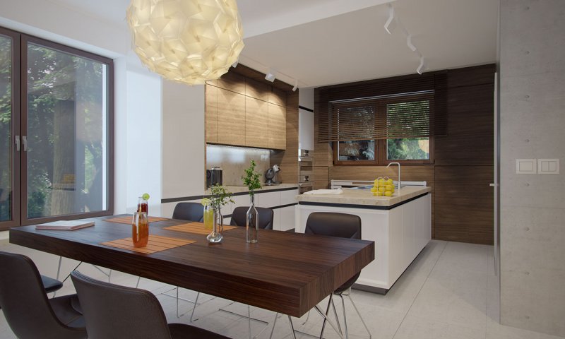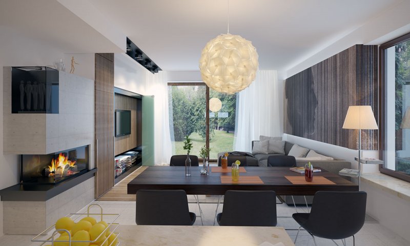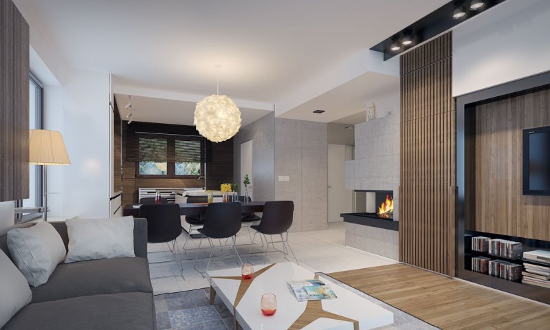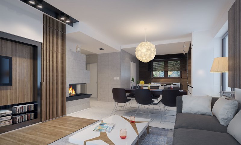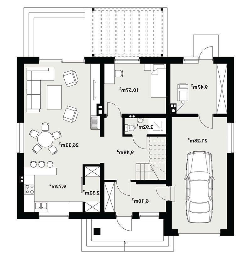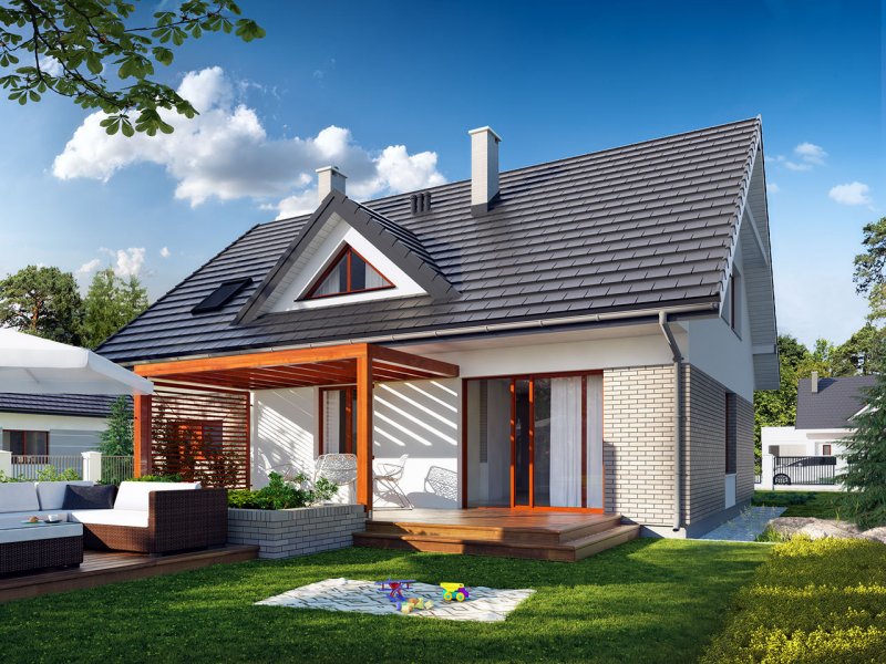 Dom jednorodzinny, parterowy z użytkowym poddaszem, z jednostanowiskowym garażem. W prostej bryle przykrytej dwuspadowym dachem zamknięto przestronne i funkcjonalne wnętrze. Obniżony strop nad garażem wydatnie powiększa przestrzeń w sypialni rodziców, która jest funkcjonalnie odizolowana od pokoi dzieci. Daje to poczucie spokoju oraz intymności. Garderobę, dostępną z korytarza, można zaadaptować na pralnię