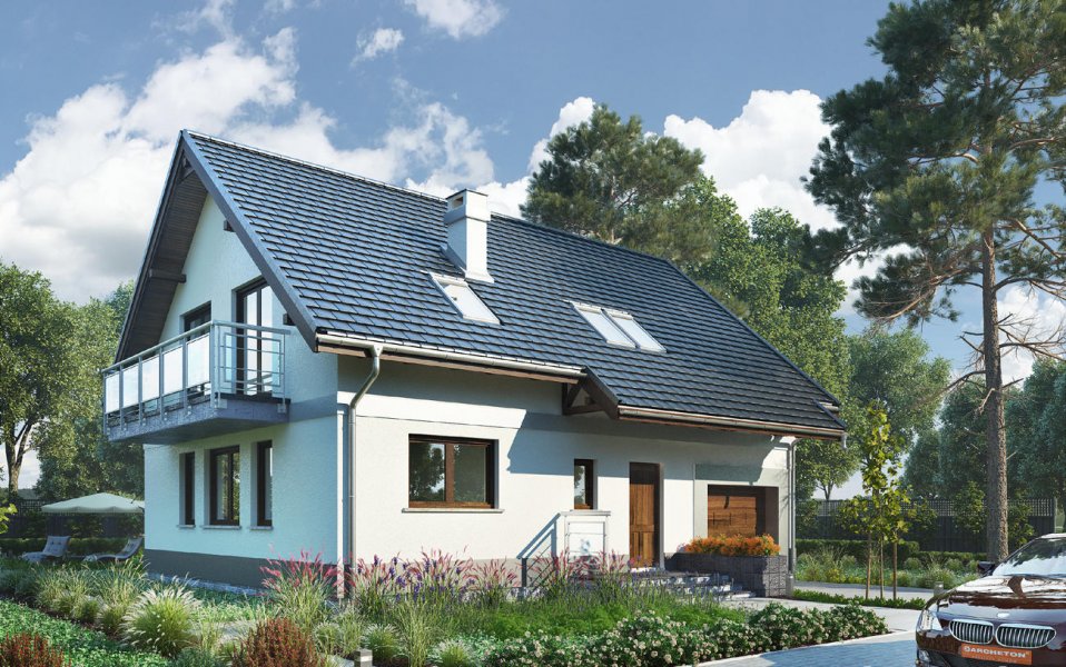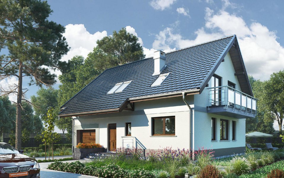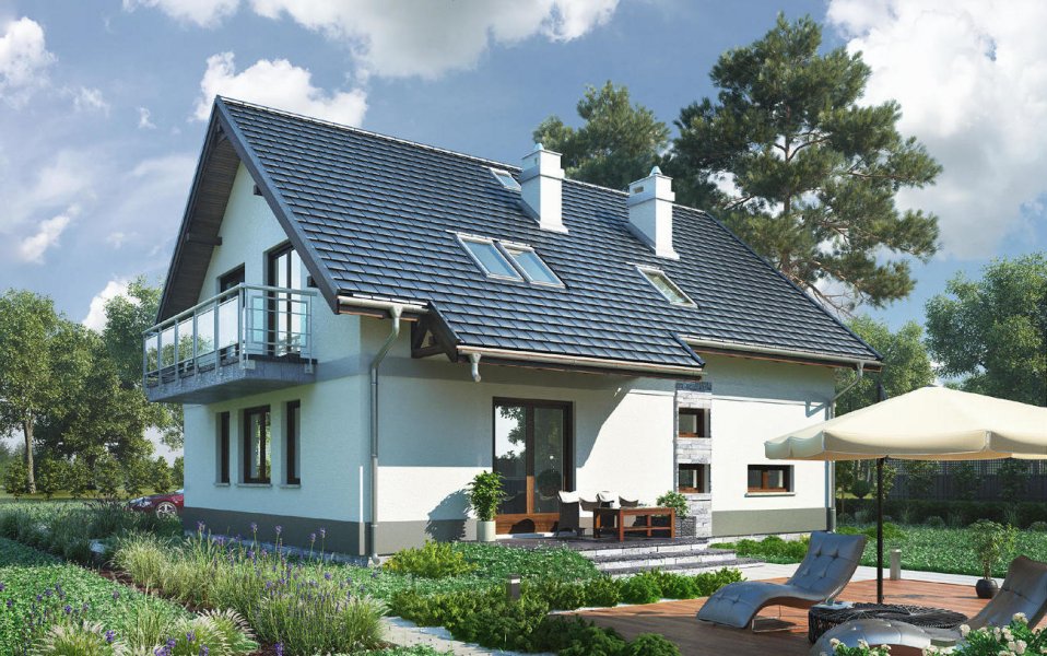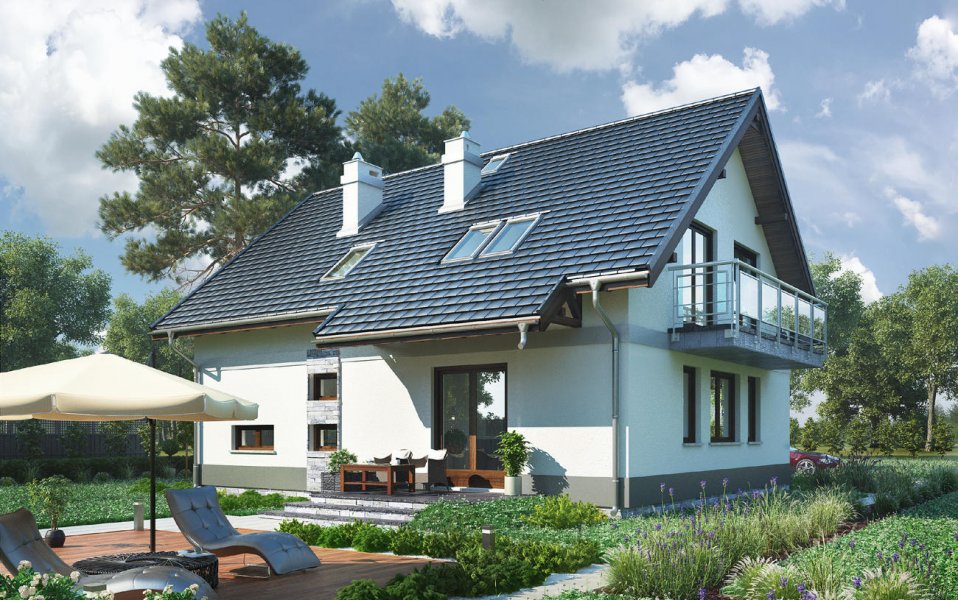 Jedną z bardziej ekonomicznych inwestycji w zakresie budowy domów jednorodzinnych z użytkowym poddaszem, o powierzchni 115-120m2 zrealizować można w oparciu o projekt domu Oberek Polo. Jest to średnia wersja w Rodzinie Oberka, która proponuje mieszkanie z częścią gospodarczą i z kotłownią pod jednym, tanim dwuspadowym dachem bez lukarn, na planie zdyscyplinowanego prostokąta o zgrabnych wymiarach. Wszystko to decyduje o niskich kosztach eksploatacji (ogrzewania) domu i zręcznych proporcjach jego sylwetki. Parter w Oberku to otwarta strefa salonu i kuchni oraz niewielka łazienka i wygodny hol ze schodami na poddasze, kryjące pod podestem schowek z przejściem do kotłowni ulokowanej na tyłach garażu. Taki program funkcjonalny oferują również Skarbek As czy Omega ale w innym układzie przestrzennym poszczególnych pomieszczeń. Poddasze w projekcie domu Oberek Polo, z czterema ustawnymi sypialniami dla 5 osób oraz z dużą łazienką, doświetlono głównie tradycyjnymi oknami w ścianach szczytowych. Prostą stylistykę urozmaicają balkony w ścianach szczytowych oraz przedłużone okapy nad drzwiami frontowymi i brama garażową oraz nad tarasem ogrodowym.