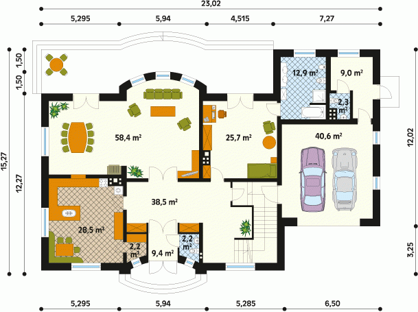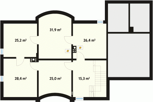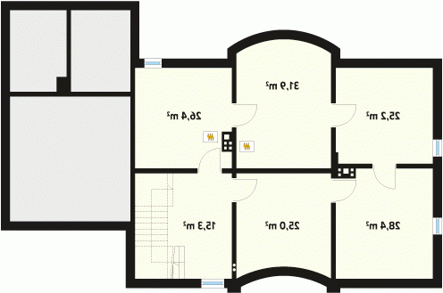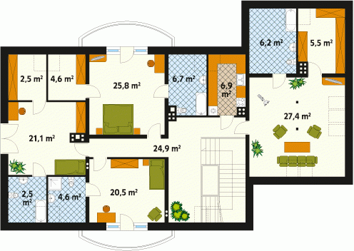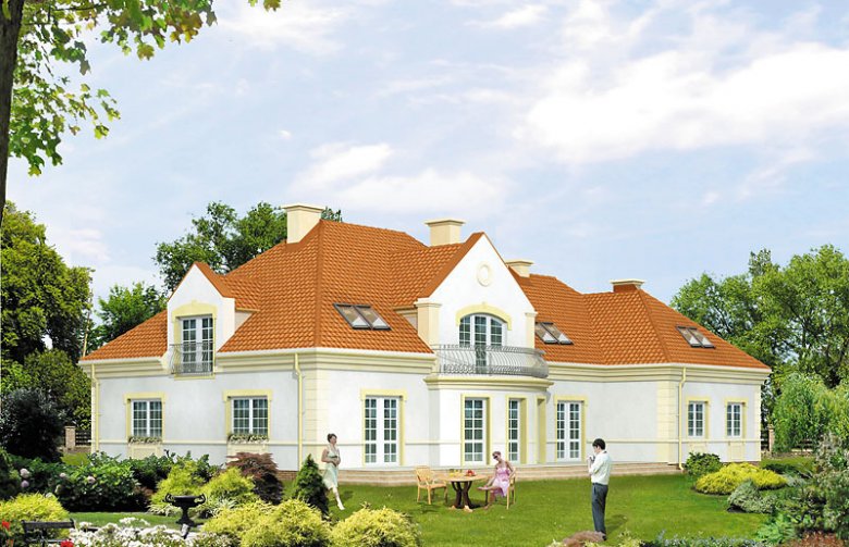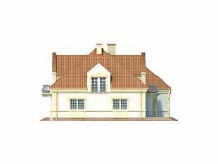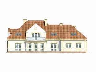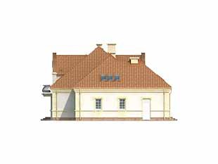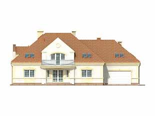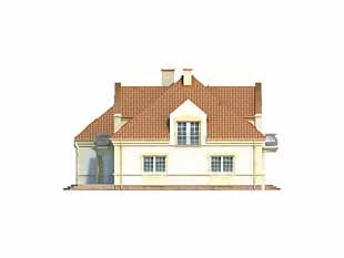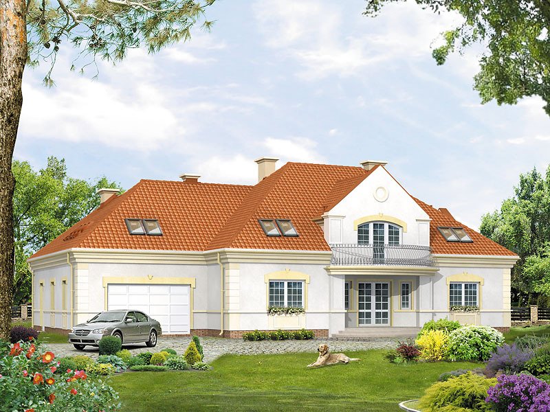 Duży dom jednorodzinny z użytkowym poddaszem, podpiwniczony, z dwustanowiskowym garażem. Na parterze dodatkowa sypialnia z łazienką, na poddaszu cztery sypialnie – każda z łazienką i garderobą. Na poddaszu możliwość wprowadzenia dodatkowej kuchni, Dom dla dużej, 6 – 7-osobowej rodziny.
