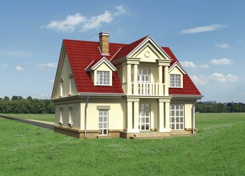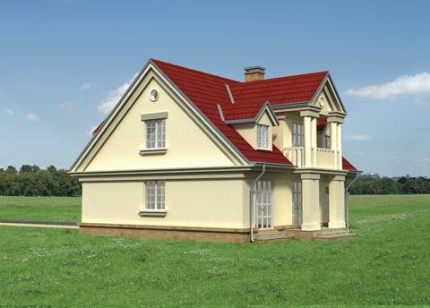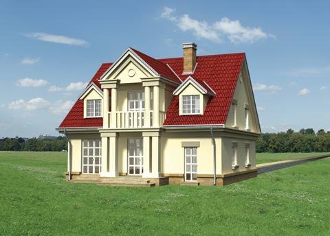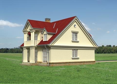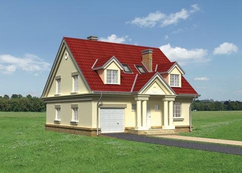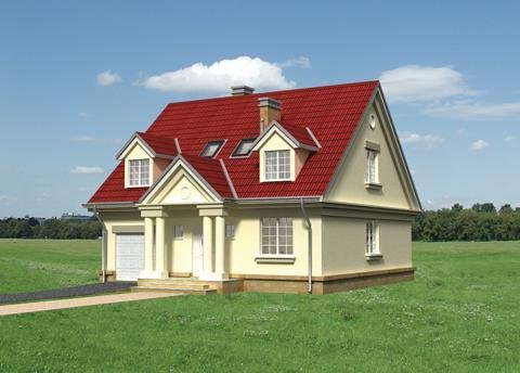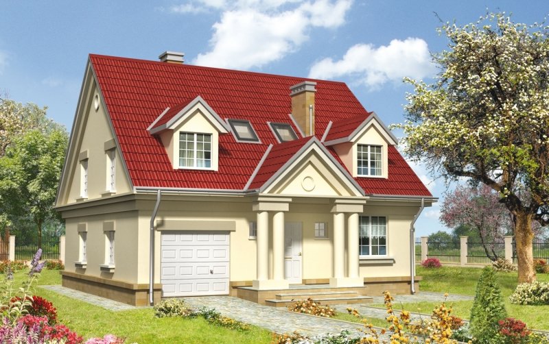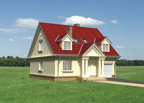 Symetrię domu podkreślają portyki: wejściowy i ogrodowy oraz rozmieszczenie okien i lukarn.