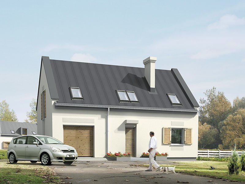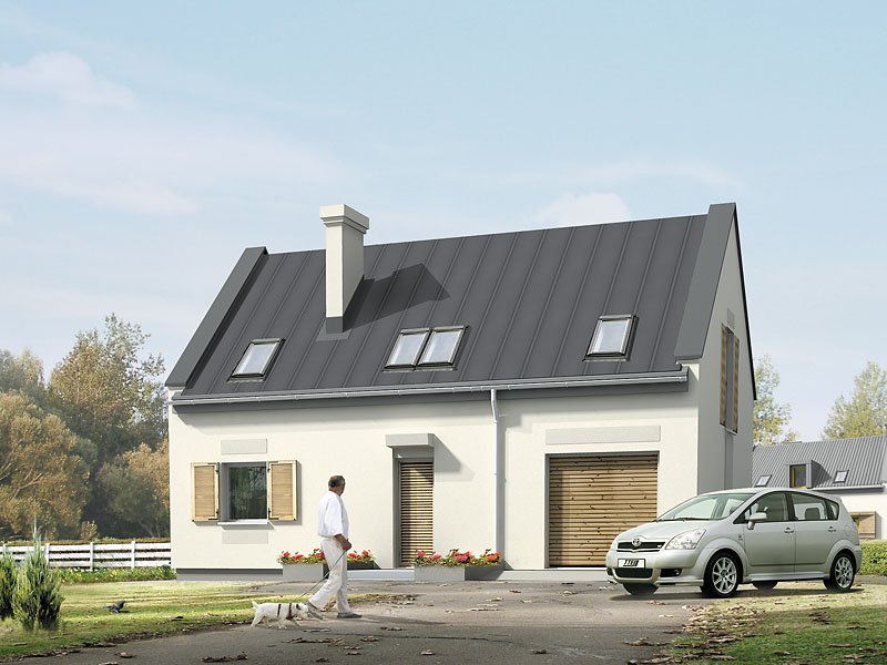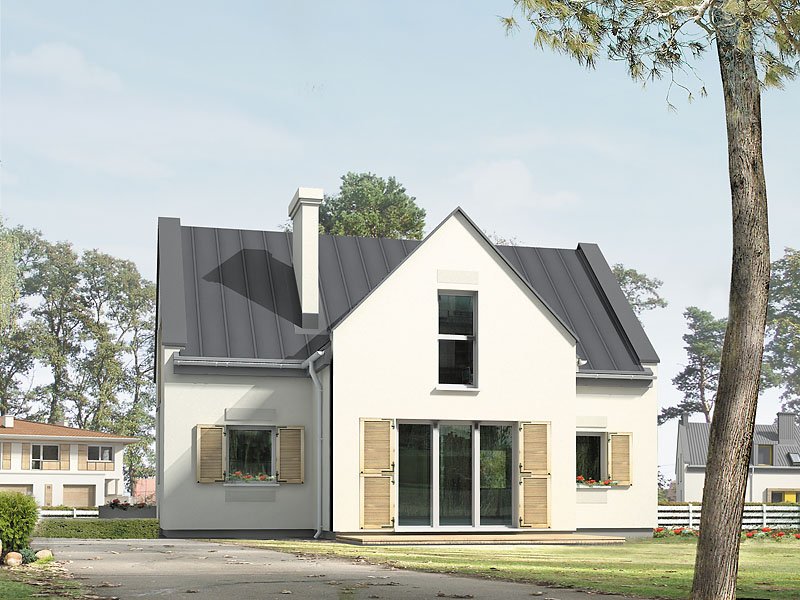 Ściany: 2-warstwowe - pustak ceramiczny + styropian, Stropy: żelbetowe, wylewane, Dach: blacha na rąbek stojący Classic Ruukki, kąt nachylenia 45°