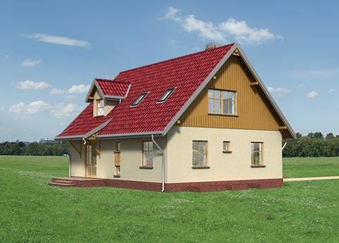 Elewacje: tynk cienkowarstwowy + deskowanie ścian szczytowych;
