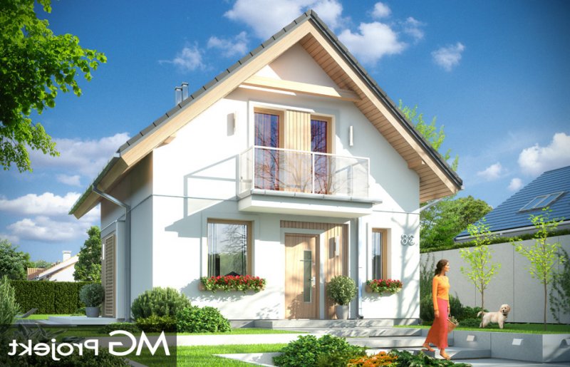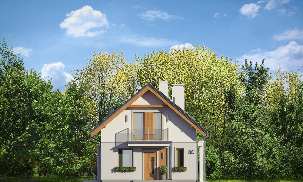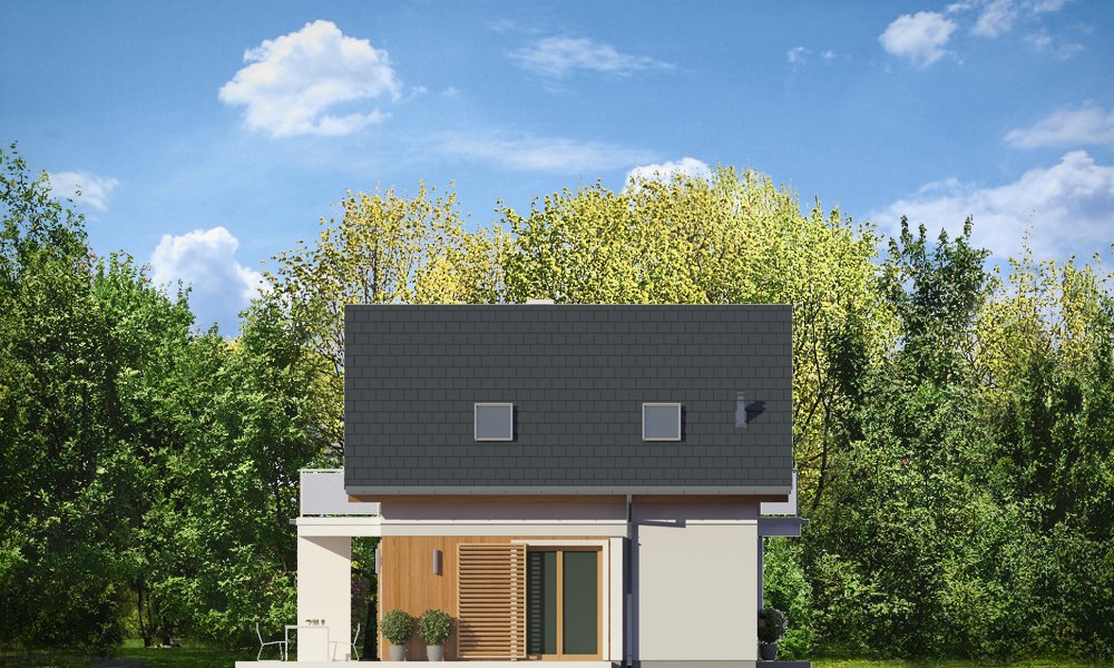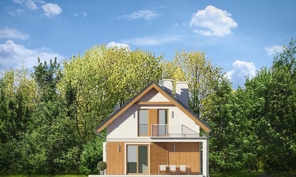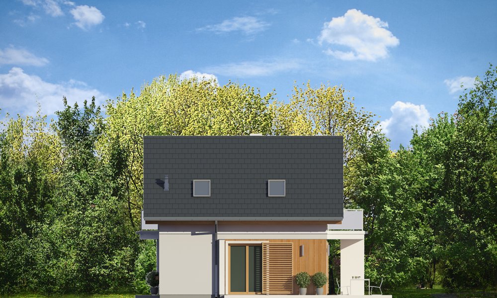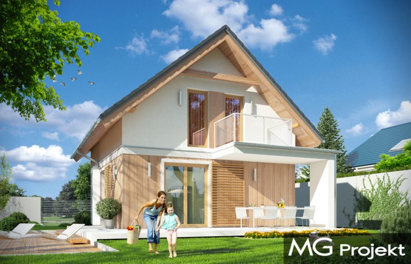 Oleńka to urocza propozycja dla trzy-czteroosobowej rodziny. Dom zaprojektowaliśmy na planie zbliżonym do kwadratu, ma poddasze użytkowe przykryte dwuspadowym dachem. Projekt posiada wszystkie atuty, aby stać się ulubieńcem swoich przyszłych właścicieli. Architektura zewnętrzna domu to połączenie nowoczesnych detali i materiałów z tradycyjną formą „dachowca”. Projekt z jednej strony jest skromny i powściągliwy w wyrazie, z drugiej strony ma w sobie nowoczesność, atrakcyjność i świeżość. Front domu ozdobiony jest okładzinami ścian z drewna, oraz balkonem będącym jednocześnie zadaszeniem nad wejściem. Elewację ogrodową urozmaica balkon – podcień wsparty na ścianie – słupie, oraz drewniana okładzina ścian. Wnętrze domu podzielono tradycyjnie na parter z częścią dzienną, oraz poddasze – z sypialniami i łazienką. Na parterze salon połączono z holem i kuchnią tworząc jednoprzestrzenne wnętrze, z kątem jadalnym, ścianę telewizyjną i kominkiem, a także szerokimi przeszklonymi drzwiami na taras i ogród. Znajdująca się przy przedsionku kotłownia gazowa może być bardzo łatwo zamieniona na kotłownię na paliwo stałe. Na poddaszu znajdują się sypialnie z szafami wbudowanymi i łazienka. Dom posiada świetną izolację termiczną, wykorzystuje nowoczesne instalacje i technologie, dzięki czemu jest energooszczędny. Właściwa proporcja kubatury do ilości przegród zewnętrznych - ścian i sufitów, pozwoli na niskie koszty utrzymania budynku. Dzięki prostej konstrukcji dom jest niedroga w budowie. Projekt występuje w wersji bez garażu, ale łatwo można doprojektować garaż z boku domu. Pracownia posiada też wersję odbicia lustrzanego projektu.