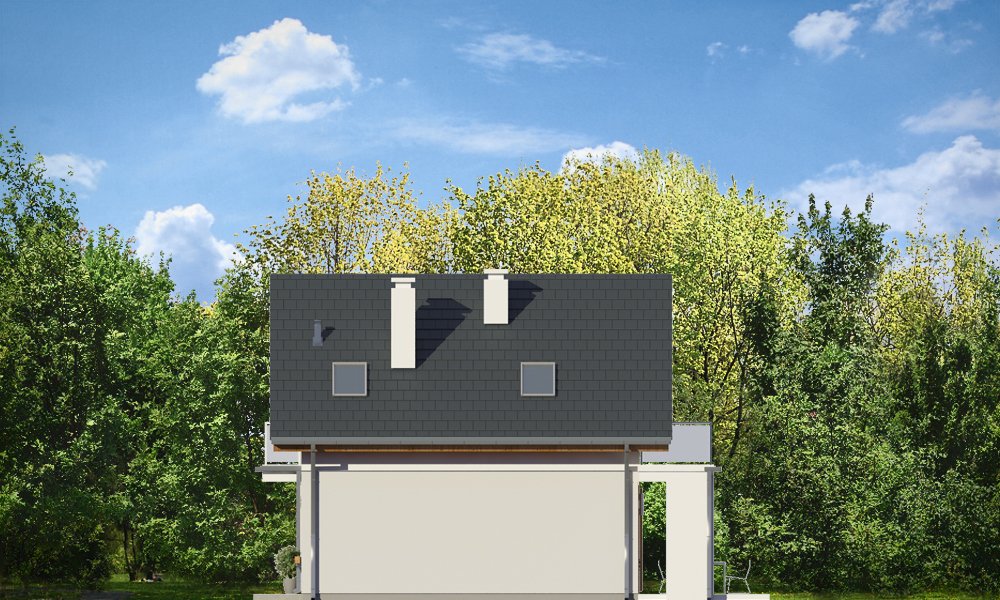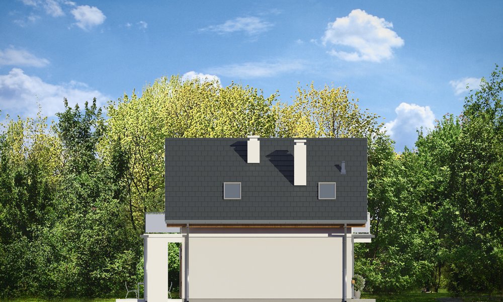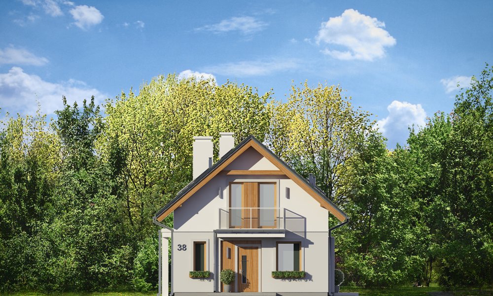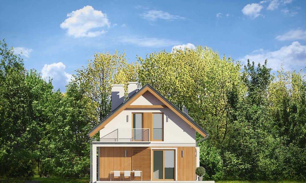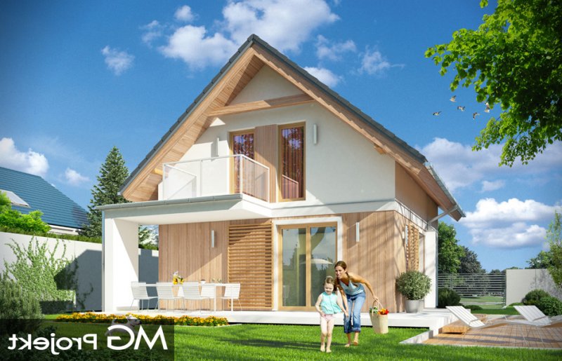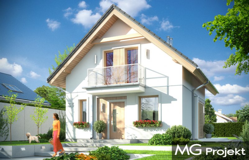 Oleńka to urocza propozycja dla trzy-czteroosobowej rodziny. Dom zaprojektowaliśmy na planie zbliżonym do kwadratu, ma poddasze użytkowe przykryte dwuspadowym dachem. Projekt posiada wszystkie atuty, aby stać się ulubieńcem swoich przyszłych właścicieli. Architektura zewnętrzna domu to połączenie nowoczesnych detali i materiałów z tradycyjną formą „dachowca”. Projekt z jednej strony jest skromny i powściągliwy w wyrazie, z drugiej strony ma w sobie nowoczesność, atrakcyjność i świeżość. Front domu ozdobiony jest okładzinami ścian z drewna, oraz balkonem będącym jednocześnie zadaszeniem nad wejściem. Elewację ogrodową urozmaica balkon – podcień wsparty na ścianie – słupie, oraz drewniana okładzina ścian. Wnętrze domu podzielono tradycyjnie na parter z częścią dzienną, oraz poddasze – z sypialniami i łazienką. Na parterze salon połączono z holem i kuchnią tworząc jednoprzestrzenne wnętrze, z kątem jadalnym, ścianę telewizyjną i kominkiem, a także szerokimi przeszklonymi drzwiami na taras i ogród. Znajdująca się przy przedsionku kotłownia gazowa może być bardzo łatwo zamieniona na kotłownię na paliwo stałe. Na poddaszu znajdują się sypialnie z szafami wbudowanymi i łazienka. Dom posiada świetną izolację termiczną, wykorzystuje nowoczesne instalacje i technologie, dzięki czemu jest energooszczędny. Właściwa proporcja kubatury do ilości przegród zewnętrznych - ścian i sufitów, pozwoli na niskie koszty utrzymania budynku. Dzięki prostej konstrukcji dom jest niedroga w budowie. Projekt występuje w wersji bez garażu, ale łatwo można doprojektować garaż z boku domu. Pracownia posiada też wersję odbicia lustrzanego projektu.