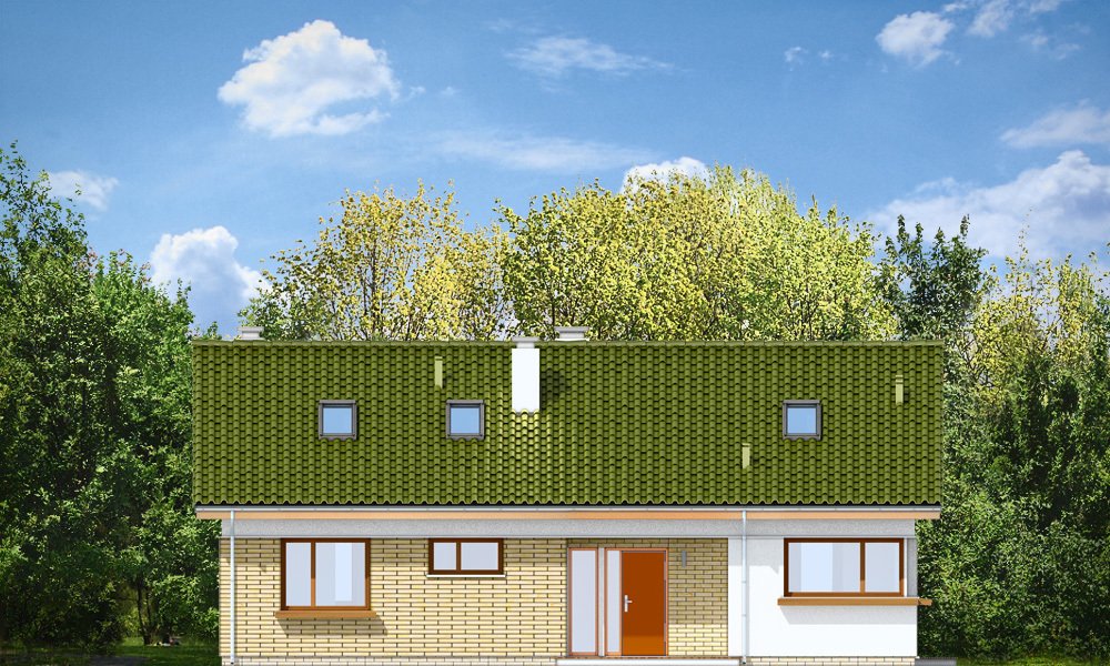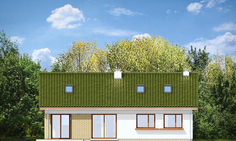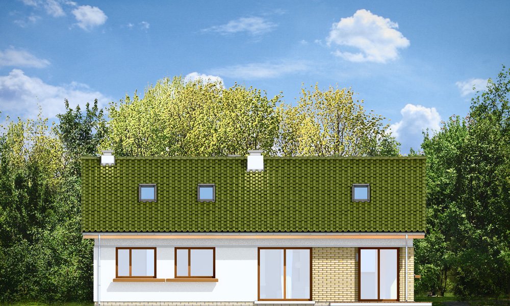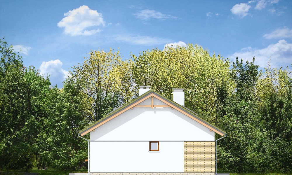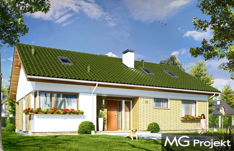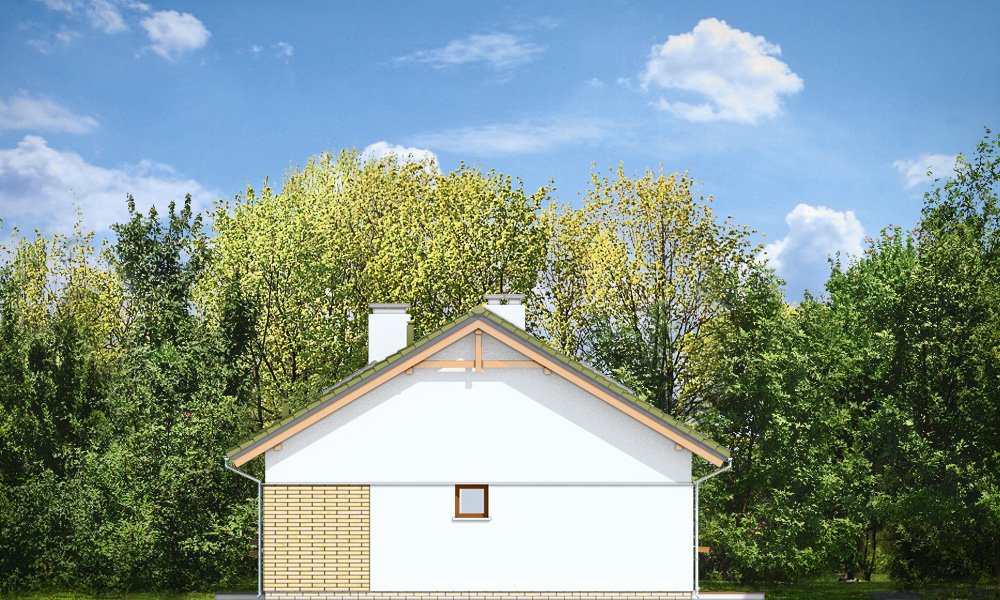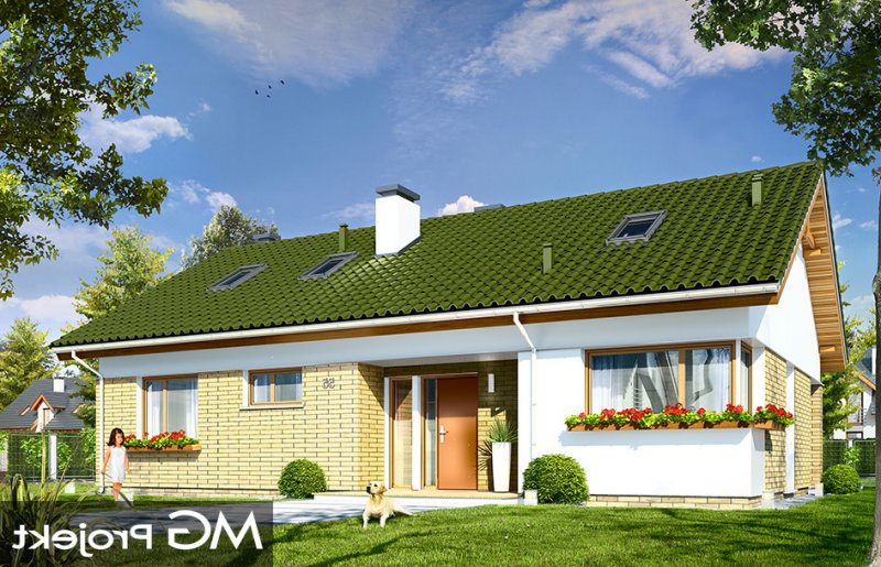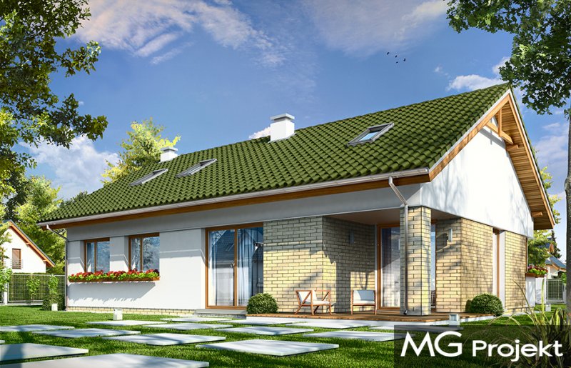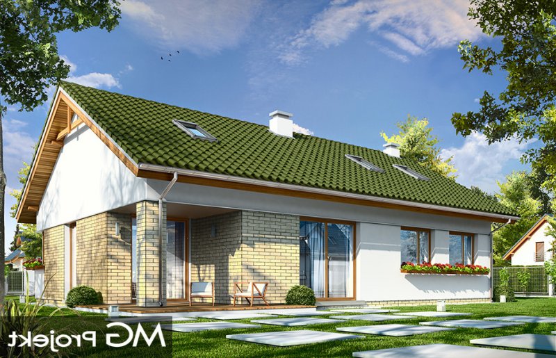 Oliwka 2 to kolejna odsłona projektu Oliwka – tym razem z betonowym stropem nad parterem i ze strychem do adaptacji na poddasze użytkowe. Domek w bardzo łatwy sposób z niecałych stu metrów powierzchni można zwiększyć o niemal 40 procent. Na poddaszu można z powodzeniem zmieścić dwa dodatkowe pokoje oraz łazienkę. Projekt ma wariantowo rozwiązany strych / poddasze : wariant podstawowy Oliwki 2 „A” ma jednoprzestrzenny strych do dowolnego zagospodarowania, a wariant „B” ma poddasze użytkowe składające się z dodatkowych dwóch pokoi z łazienką (dodatkowa powierzchnia poddasza wynosi 34,77 m2). Dom ma bardzo prostą bryłę, zbudowaną na planie prostokąta, przekrytą dwuspadowym dachem. Ciekawie rozmieszone okna, okładziny ścian, podcienie i nisze nadają budynkowi nowoczesnego dynamicznego wyglądu, udowadniając, że parterowy dom może być także ciekawy. Wszystkie potrzebne pomieszczenia znajdują się na parterze : obszerna cześć dzienna, z salonem, holem, aneksem jadalnym i kuchnią, a także trzy sypialnie z łazienkami. Dobre izolacje przegród zwiększają energooszczędność budynku. W połączeniu z wentylacją z rekuperacją dom będzie bardzo oszczędny w przyszłej eksploatacji. W domu można zamienić kocioł gazowy na kotłownię na paliwo stałe. Oliwka 2 to projektu przeznaczony dla rozwojowej rodziny, która będzie być może potrzebowała w przyszłości dodatkowej przestrzeni (poddasza). Ewentualnie jest to propozycja dla inwestorów chcących mieć dodatkową buforową przestrzeń gospodarczą lub magazynową poza pomieszczeniami mieszkalnymi. Oliwka 2 doskonale wpasuje się w każde otoczenie. Projekt nie wymaga dużej działki. Budynek jest bezpretensjonalny, ma logicznie zaprojektowane wnętrze. Zapraszamy.