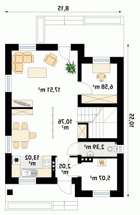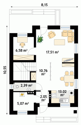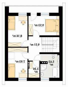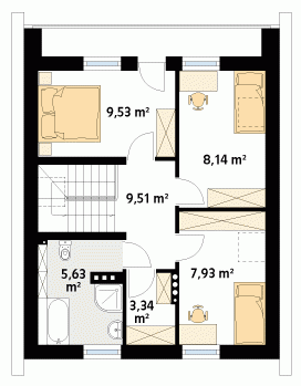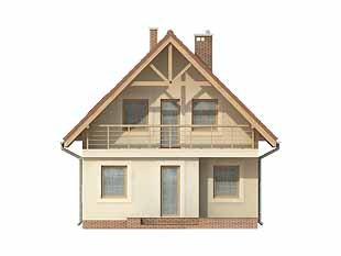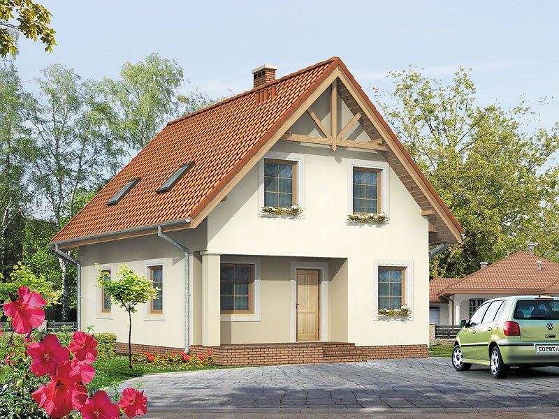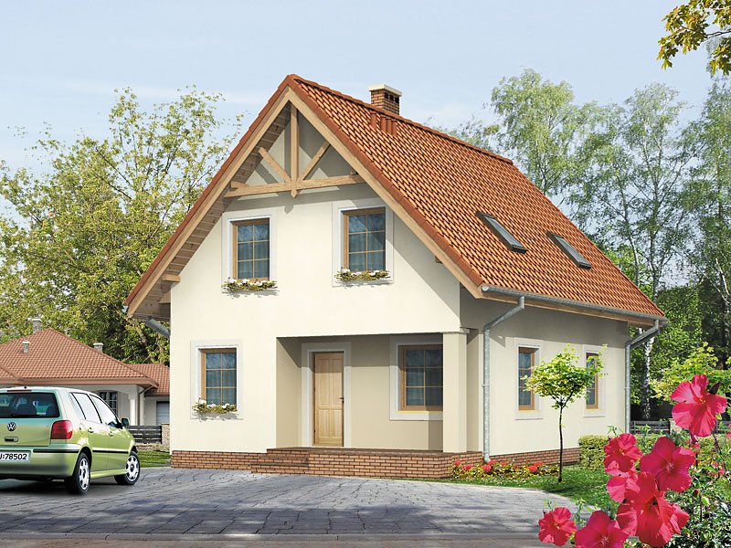 Mały dom jednorodzinny z poddaszem użytkowym dla 3 – 4-osobowej rodziny. Na parterze dodatkowy pokój z możliwością wykorzystania na gabinet. Na poddaszu trzy sypialnie, łazienka oraz mała garderoba.