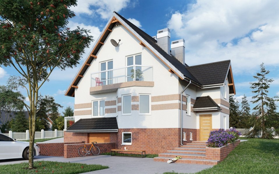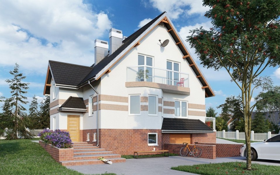 Na parterze znajduje się sień (na niższym poziomie) oraz hol, pokój dzienny, kuchnia z jadalnią, łazienka i pokój. Na poddaszu zlokalizowano 3 pokoje sypialne, łazienkę i przedpokój oraz garderobę dostępną ze spocznika schodów. Znajdujący się w piwnicy garaż dostępny jest z poziomu terenu. Oprócz niego są tam również: pomieszczenie gospodarcze i kotłownia. Bryłę budynku stanowi prostopadłościan nakryty dachem dwuspadowym symetrycznym o kącie nachylenia połaci 45°. Urozmaicają ją ryzalit wejściowy oraz jadalni, którą nakrywa balkon. Obiekt nadaje się na duży spadek terenu.