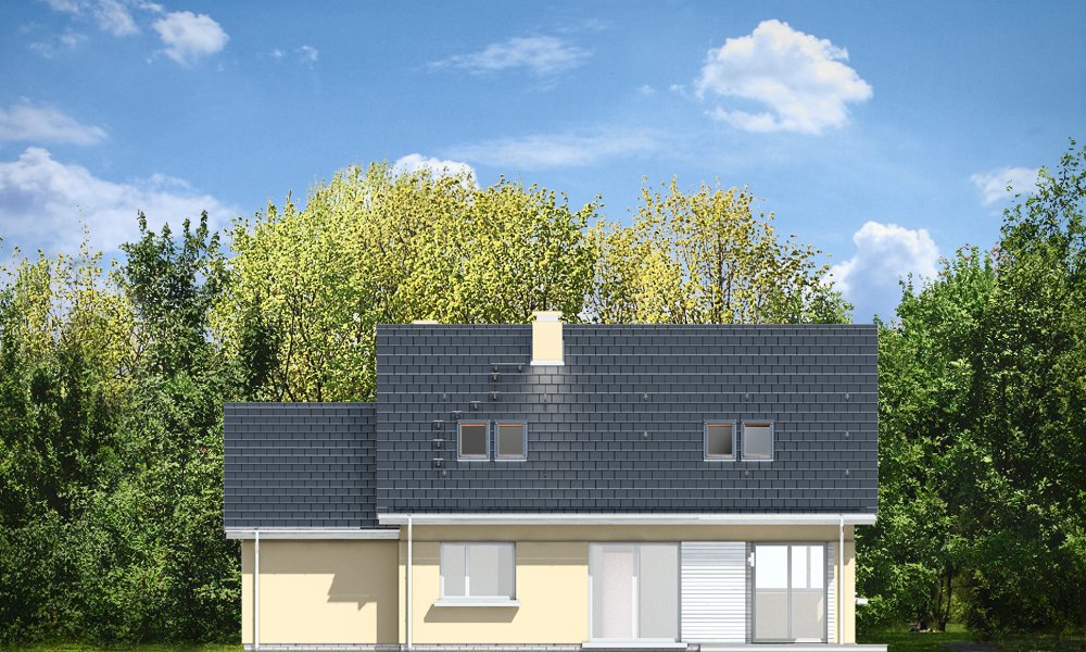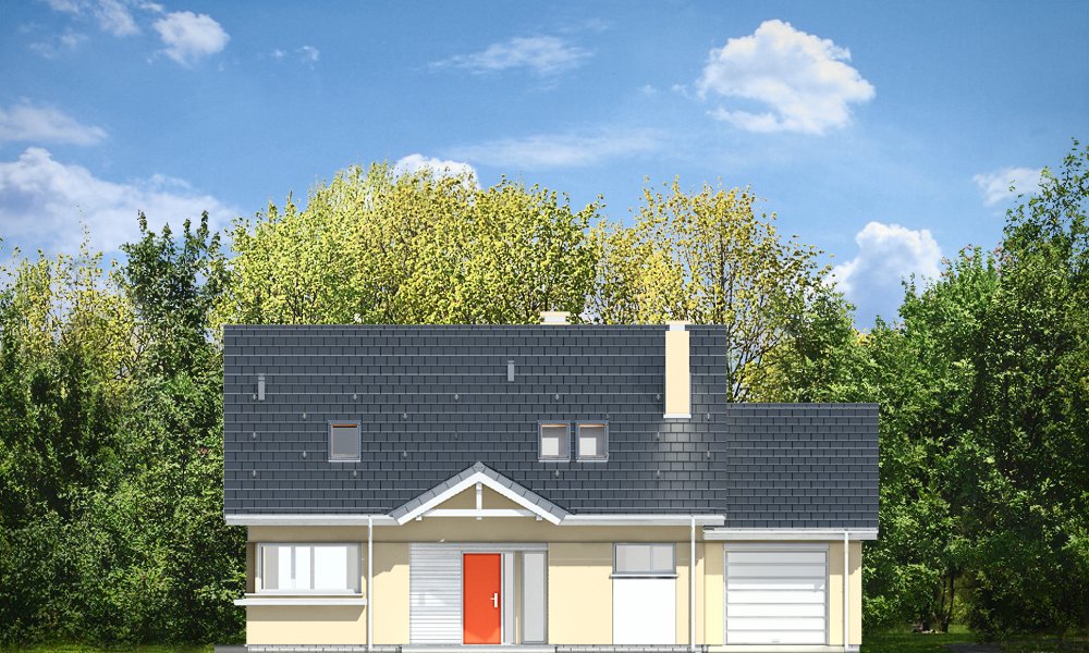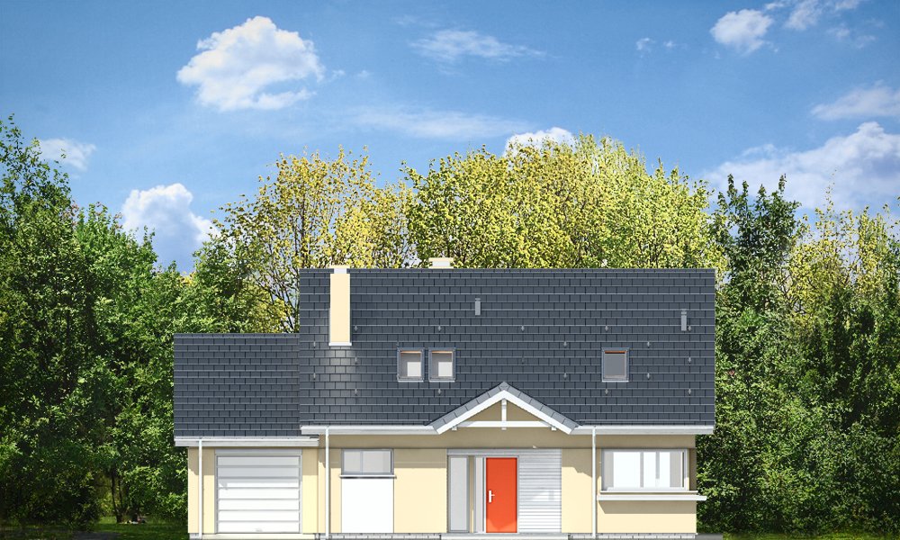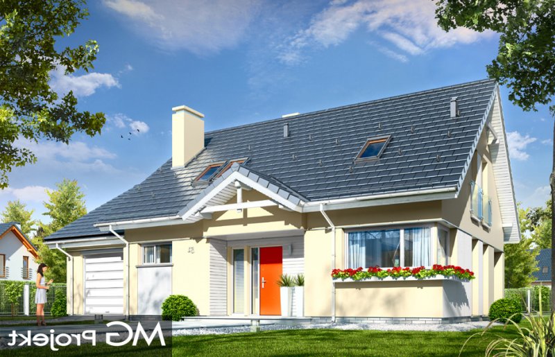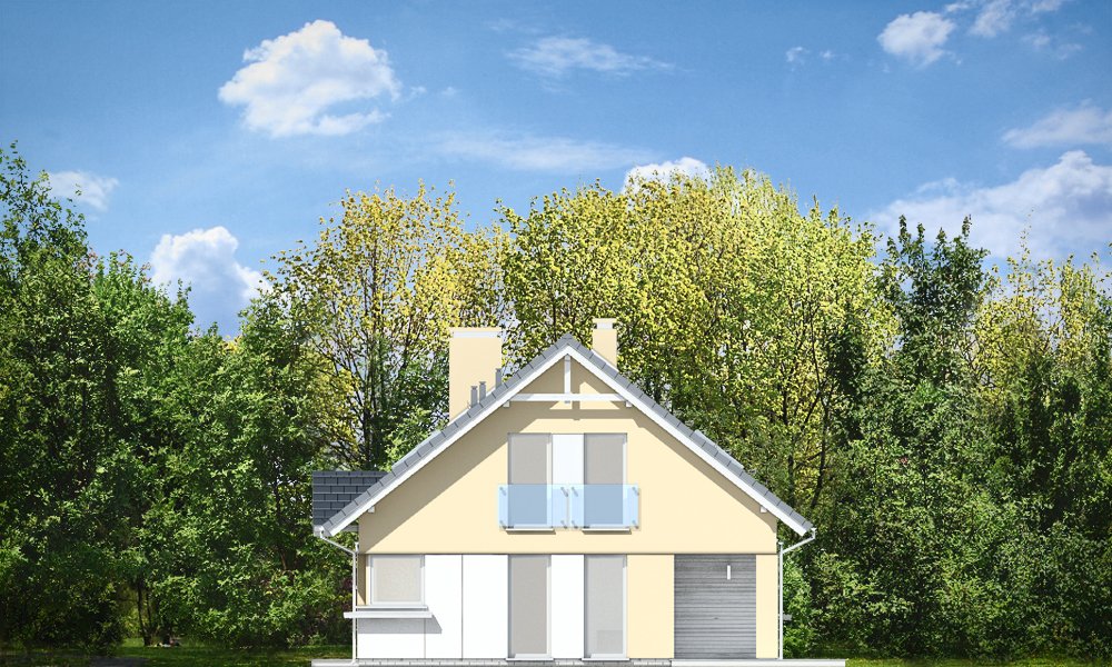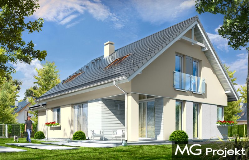 Optymalny 2 jest wersją wariantową Optymalnego, z dobudowanym do elewacji bocznej garażem jednostanowiskowym. Budynek jest parterowy z poddaszem użytkowym, zaprojektowany na planie prostokąta, przekryty dwuspadowym dachem. Prosta minimalistyczna bryła tworzy spokojną estetyczną architekturę, z nowoczesnymi detalami i materiałami. Elewacje zostały ciekawie urozmaicone: frontowa - podcieniem wejściowym zaakcentowanym dwuspadowym daszkiem, oraz narożnym oknem kuchni; ogrodowa - ładnymi przeszkleniami salonu, oraz narożnym podcieniem osłaniającym część tarasu. Domek, dzięki swojej bezpretensjonalności z powodzeniem wpasuje się w każde otoczenie. Wnętrze domu zaprojektowano z uwzględnieniem podziału na część dzienną na parterze i sypialnie na poddaszu. Na parterze salon, holl i kuchnia tworzą wspólną otwartą przestrzeń, w której znalazło się miejsce na aneks jadalny, kąt na meble wypoczynkowe, ścianę TV i kominek. Wygodne schody, nieco oddzielone od salonu są jednocześnie ozdobą wnętrza. Na parterze przewidzieliśmy miejsce na spiżarnię przy kuchni, dodatkowy pokój ( gabinet lub sypialnię gościnną ), łazienkę i kotłownię, która w funkcjonalny sposób łączy przedsionek z garażem. Kotłownia gazowa, może być łatwo przystosowana do pieca na paliwo stałe. Garaż ma dodatkowe pomieszczenie gospodarcze. Na poddaszu umieszczono trzy wygodne sypialnie z szafami wbudowanymi, garderobę i przestronną łazienkę z oknami połaciowymi nad wanną. Projekt jest energooszczędny - zastosowano w nim bardzo dobre izolacje termiczne, oraz nowoczesne instalacje i technologie. Sama budowa domu, dzięki nieskomplikowanej konstrukcji, będzie łatwa i niedroga. Późniejsza eksploatacja budynku również będzie tania. Optymalny 2 to dom optymalny :-), w sam raz dla Inwestorów myślących praktycznie, oszczędnie, oraz lubiących nowoczesność osadzoną w tradycyjnej formie. Pracownia posiada odbicie lustrzane projektu.