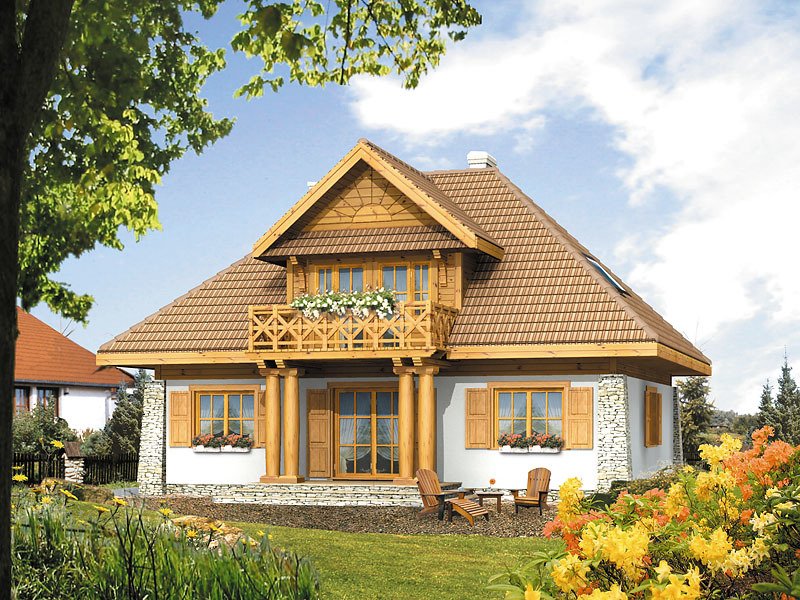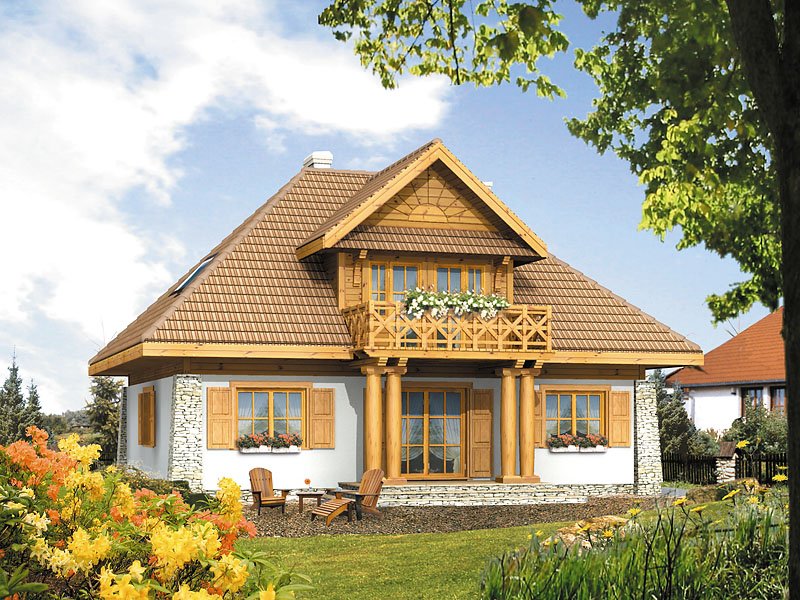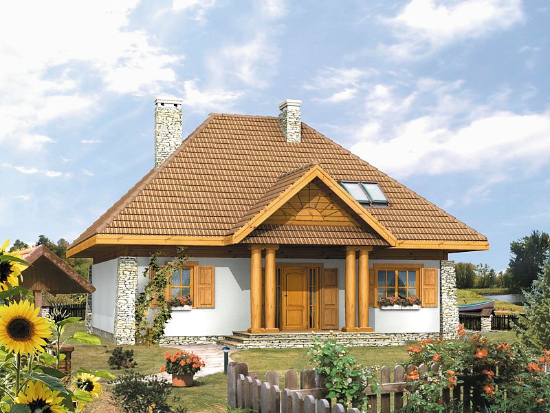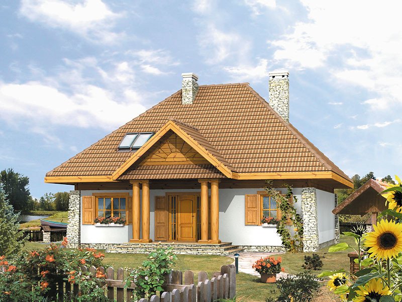 Ściany: 3-warstwowe - pustak ceramiczny, Stropy: żelbetowe, wylewane, Dach: dachówka, kąt nachylenia 40° i 45°