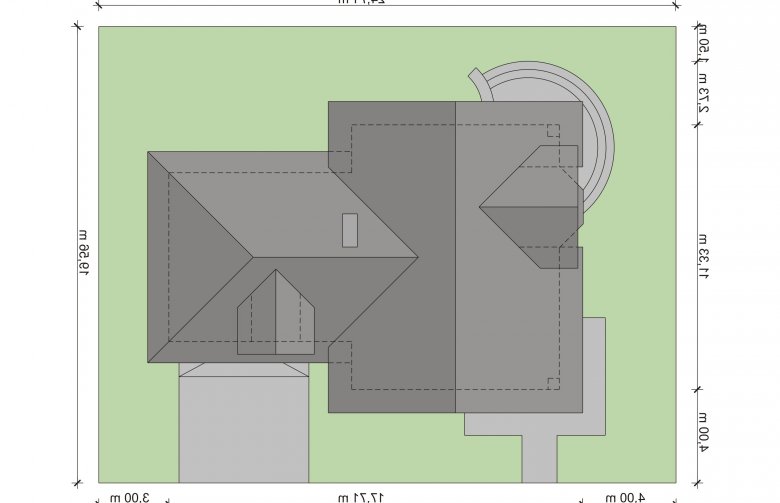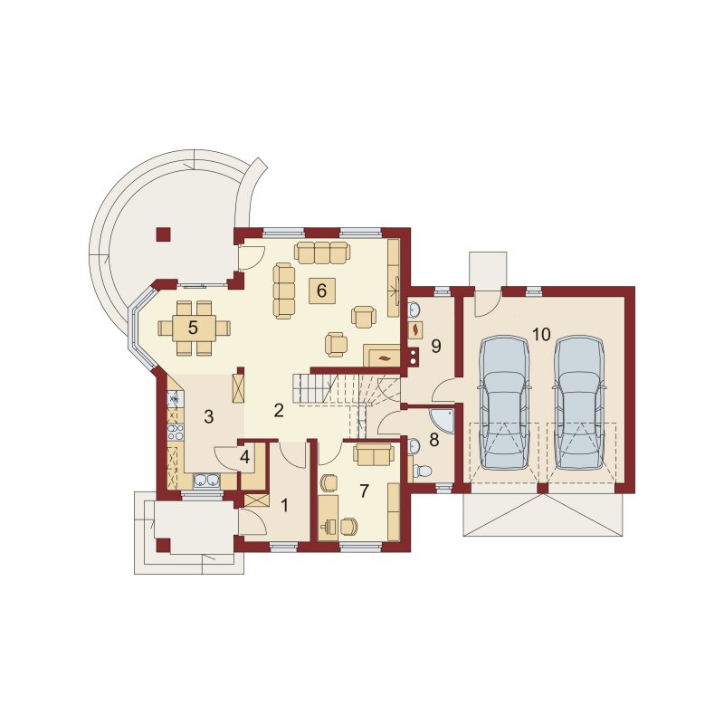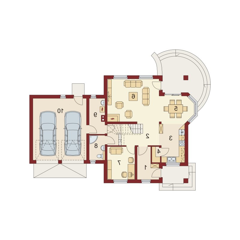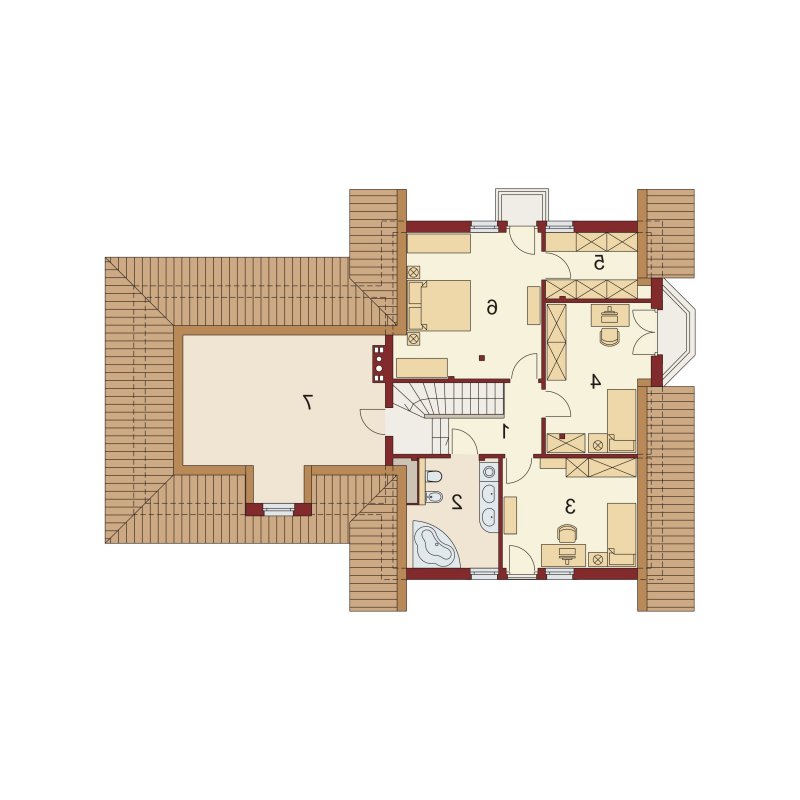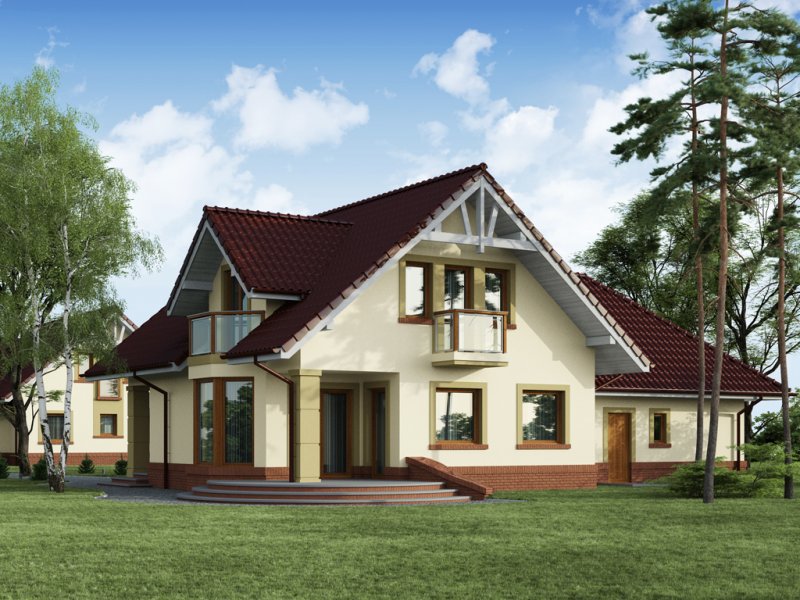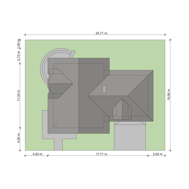 Gustowny dom parterowy z poddaszem użytkowym. Idealny dla 4-5 osobowej rodziny. Jego elegancka forma daje komfort domownikom oraz cieszy oko przechodniów. Klasyczny podział na strefę dzienną na parterze oraz nocną na poddaszu sprawia, że dom jest niezwykle funkcjonalny i praktyczny. Duży salon z ciekawie umiejscowionym kominkiem, jadalnia i przestronna kuchnia to miejsce na wspólne spotkania rodzinne. Na parterze zaprojektowano pokój, który może pełnić rolę gabinetu, jak również dodatkowej sypialni dla gości. Praktycznym rozwiązaniem jest dostęp do garażu od strony elewacji ogrodowej. Umożliwia łatwy dostęp do części gospodarczej domu. Poddasze to trzy sypialnie oraz obszerna łazienka. Sypialnia gospodarzy posiada prywatną garderobę, która zwiększa swobodę domowników. Obszerny strych możemy zaadaptować na dodatkowy pokój hobby oraz garderobę z praktycznym schowkiem.