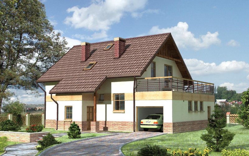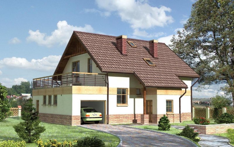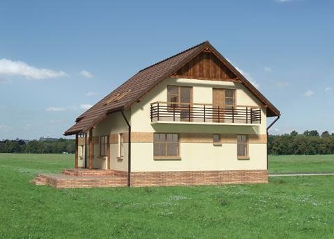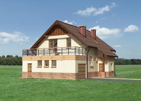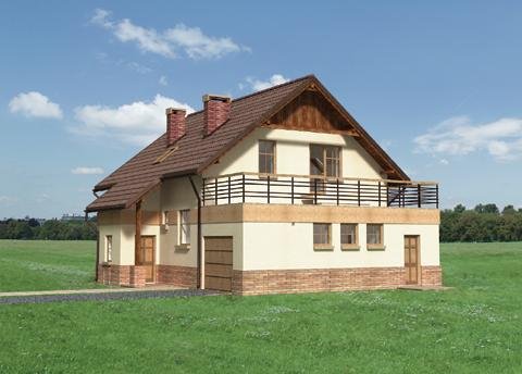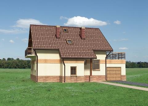 Na parterze znajduje się sień, hol, kotłownia, w.c., kuchnia ze spiżarnią, pokój dzienny, pokój oraz dobudowany garaż z pomieszczeniem gospodarczym. Na poddaszu mieszczą się dostępne z przedpokoju 3 pokoje sypialne, w.c. i łazienka. Bryłę budynku stanowi prostopadłościan nakryty dachem dwuspadowym o kącie nachylenia 38° z wysunięciem zadaszenia nad tarasem pokoju dziennego oraz od frontu nad sienią. Z boku dostawiono garaż, którego strop stanowi taras.