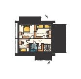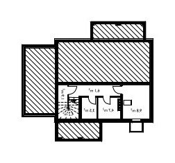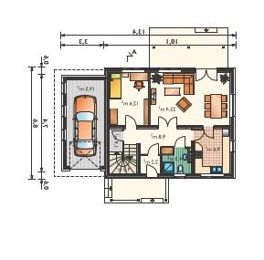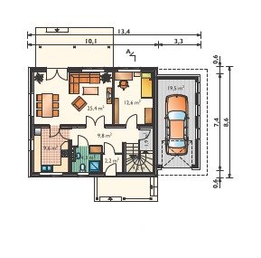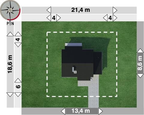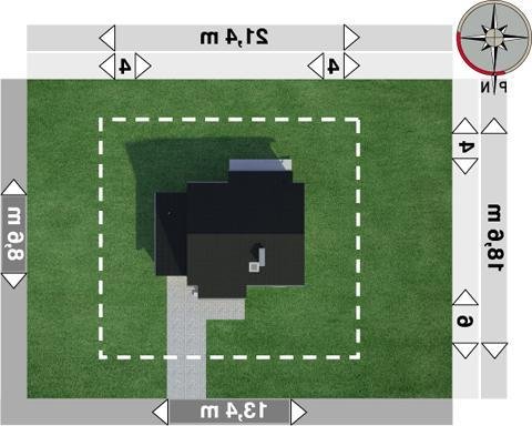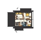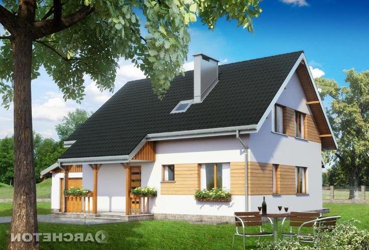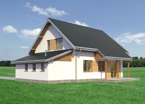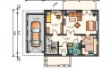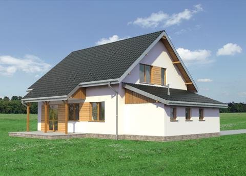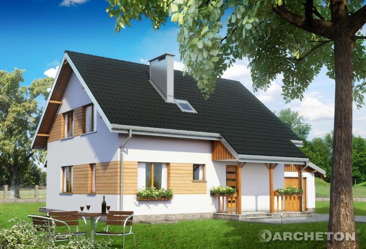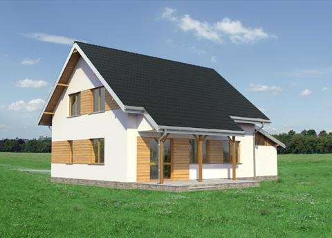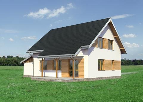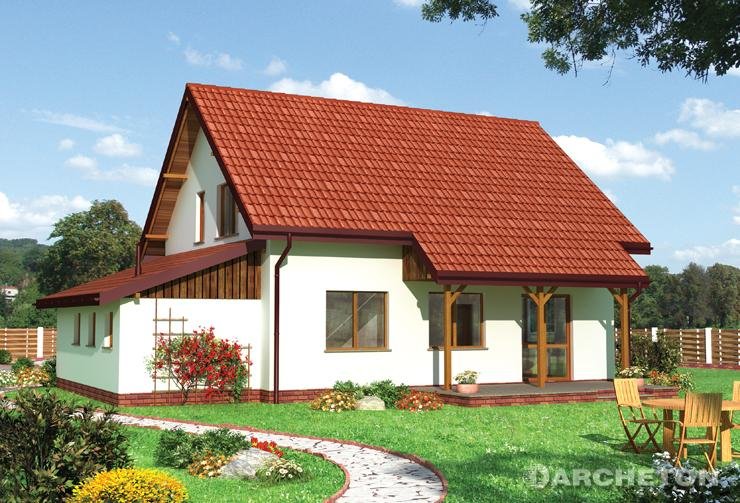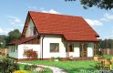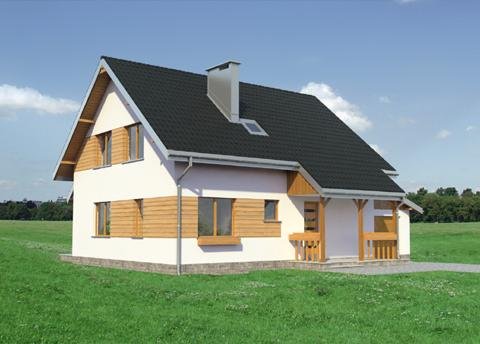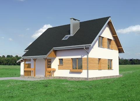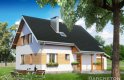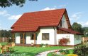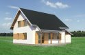 dom parterowy z użytkowym poddaszem, częściowo podpiwniczony, z garażem. Wejście przez sień z podcienia wejściowego do holu, z którego dostępne są: łazienka, kuchnia, pokój dzienny i pokój. Klatka schodowa łączy parter z piwnicą, gdzie są pomieszczenia gospodarcze i kotłownia oraz z poddaszem, gdzie zlokalizowano pokoje sypialne, łazienkę i garderobę. Zwarta bryła domu na rzucie prostokąta z dostawionym garażem. Od frontu podcień wejściowy, od tyłu - ogrodowy. Dom nakryty dachem dwuspadowym z przedłużeniem połaci nad podcieniami. Garaż nakryty dachem pulpitowym.