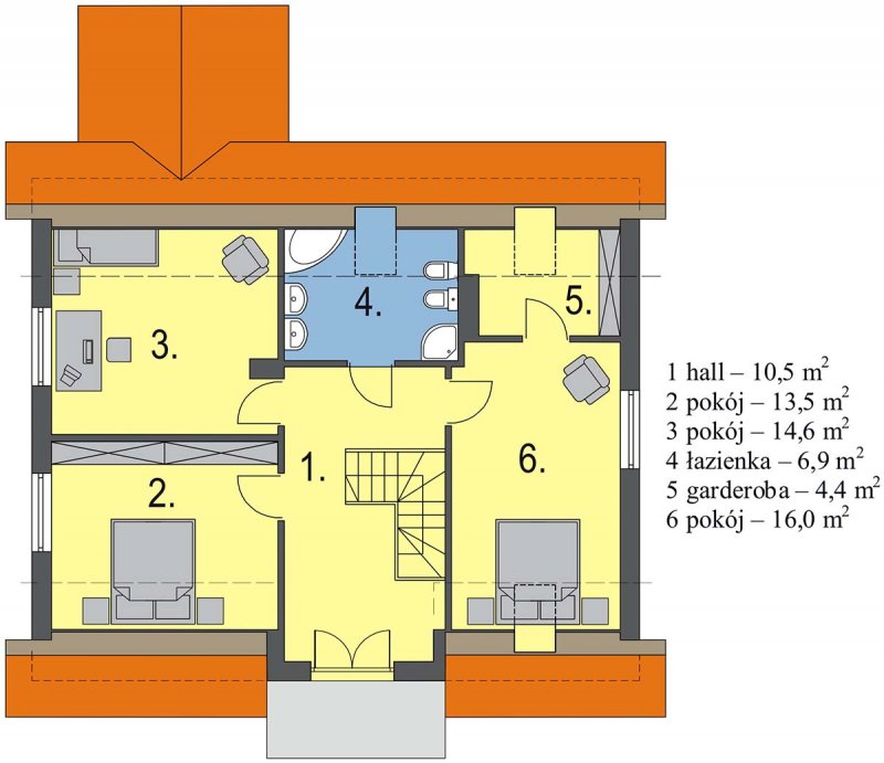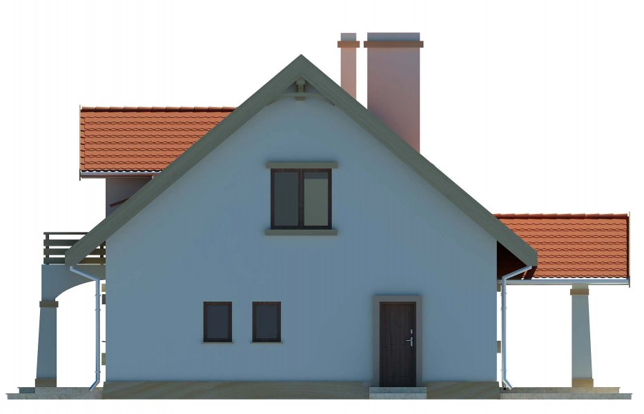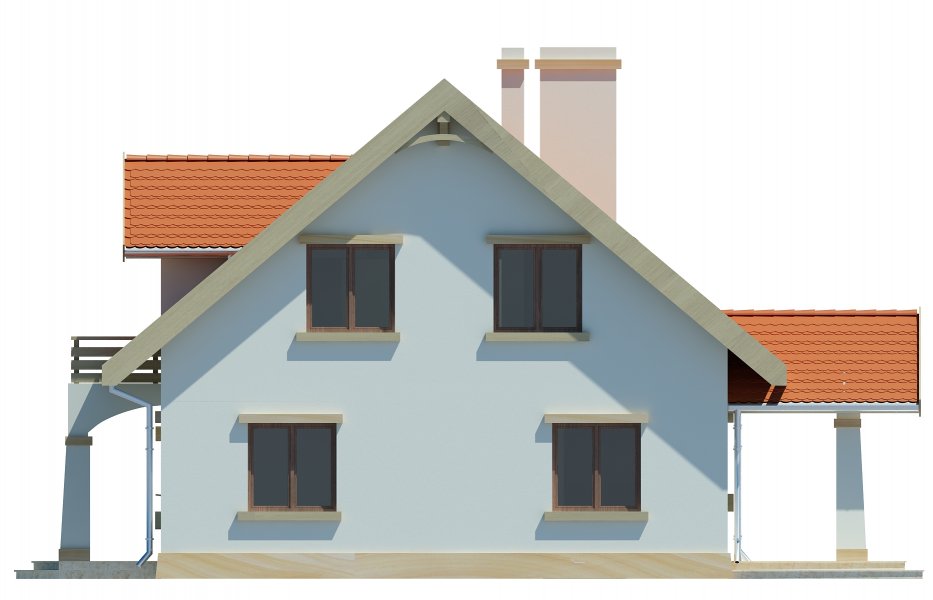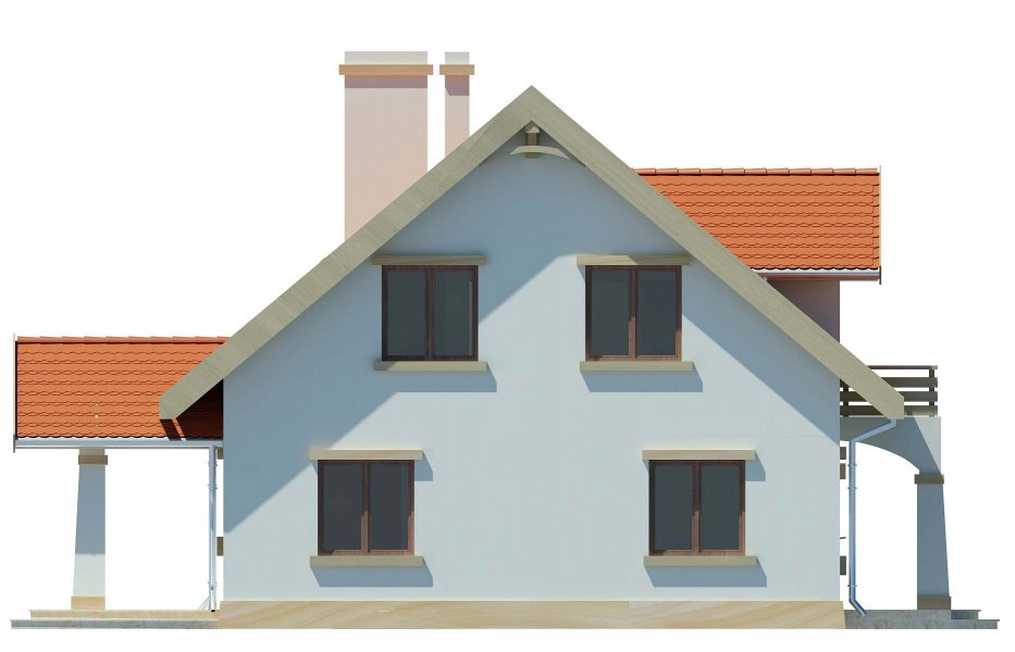 Południowa to domek, który nadaje się na działkę z wjazdem od południa. Dzięki klasycznej bryle będzie to dom niedrogi w budowie i w użytkowaniu. Podparcie zadaszenia nad wejściem i nad tarasem na kolumnach sprawia, że dom wygląda bardzo atrakcyjnie. Adresowany jest dla 4 osobowej rodziny. Na parterze znajduje się duży salon z przylegającą do niego kuchnią, a bezpośrednio z wiatrołapu można dostać się do garażu. Poddasze to miejsce z 3-ma sypialniami i wygodną łazienką. Dostępna jest również wersja w lustrzanym odbiciu.