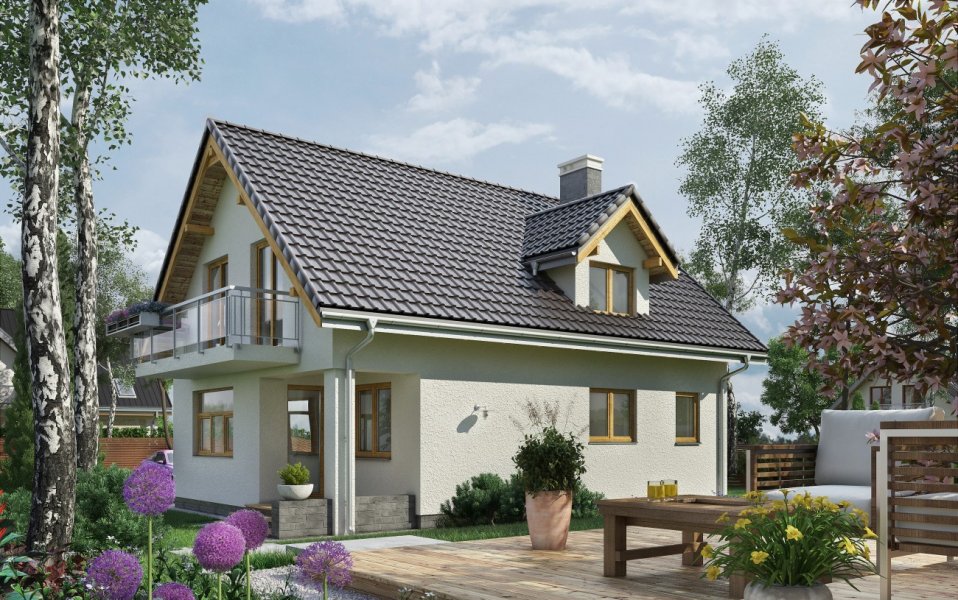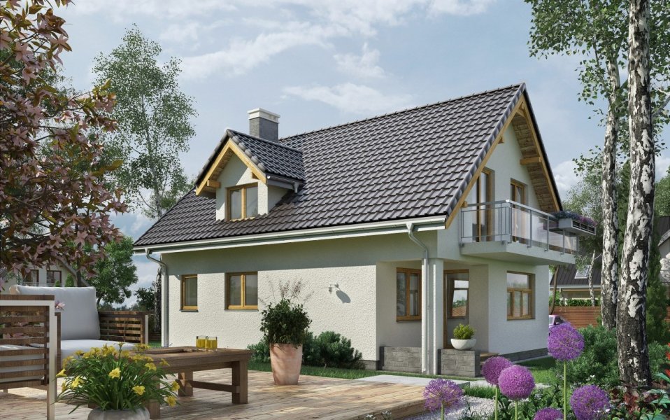 Na parterze zaprojektowano centralnie zlokalizowany hol dostępny z sieni. Z holu dostępny jest pokój dzienny otwarty przestrzennie na jadalnię, kuchnia, w.c. i kotłownia. Pod schodami prowadzącymi na poddasze mieści się niewielki schowek. Na poddaszu zaprojektowano 3 pokoje sypialne, garderobę i dużą łazienkę. Bryłę budynku stanowi prostopadłościan rozbudowany przez wysunięcie pokoju dziennego i podcień wejściowy. Całość nakryta została dachem dwuspadowym o kącie nachylenia połaci 45°. Budynek posiada podcień wyjścia na taras. Prosta bryła domu wzbogacona została balkonem i dwoma lukarnami.