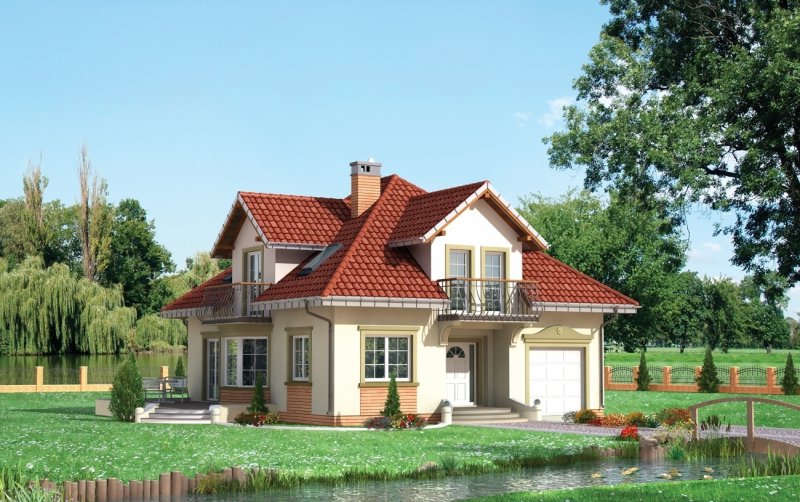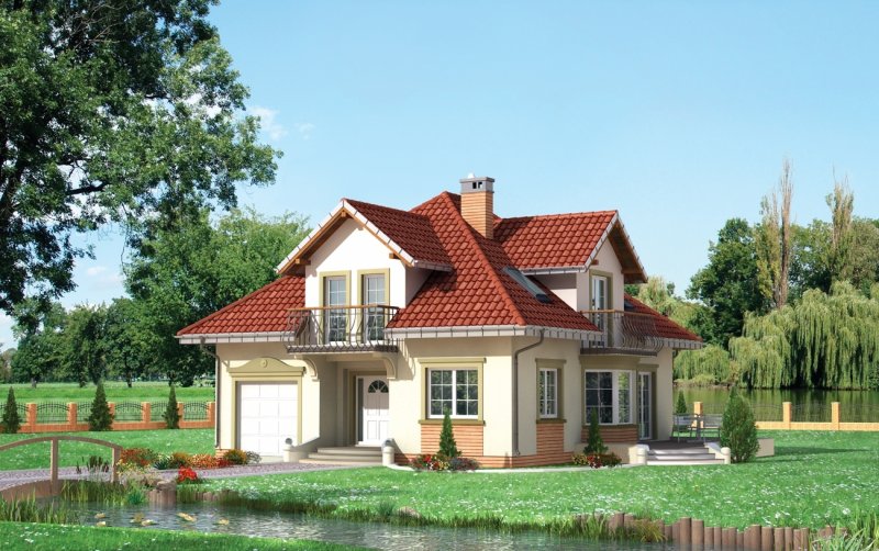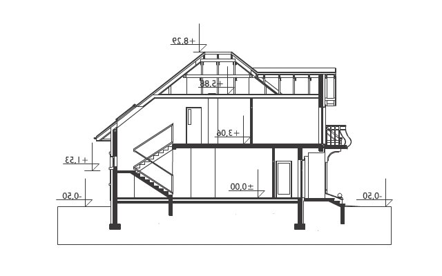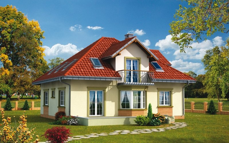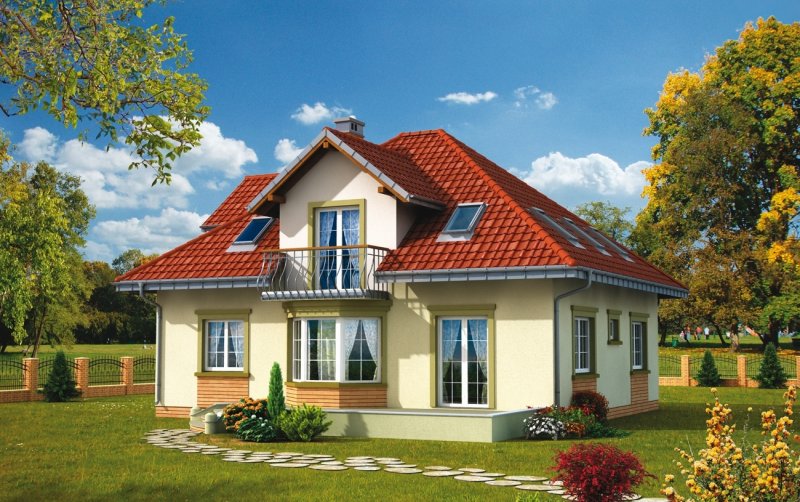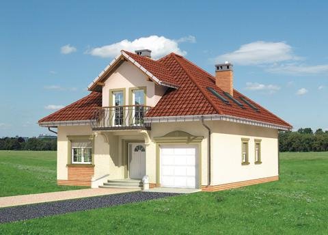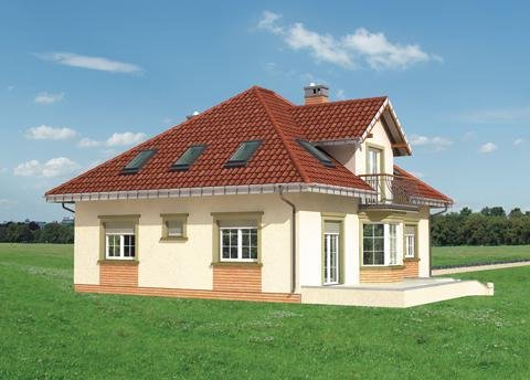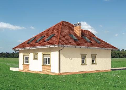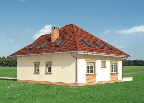 Wśród parterowych domów z użytkową przestrzenią pod czterospadowym dachem, o powierzchni 135-150m2, z wbudowanym garażem i dodatkowym pokojem na parterze, projekt domu Prymus Lux wyróżnia zbliżony do kwadratu rzut. Plan skierowany jest do wjazdu krótszą elewacją z wejściową wnęką ulokowaną na jej środku, pod głębokim okapem. Prowadzi ona na parterze do kuchni ze spiżarnią i wyjątkowo dużego salonu. Pokój dzienny otwarty jest na hol z obszernymi szafami oraz na przejście do dodatkowego pokoju z łazienką. Garaż z kotłownią tworzą osobny trakt konstrukcyjny, dostępny z sieni. Strefa dzienna rozciąga się od elewacji frontowej do ogrodu, inaczej niż w poprzecznie skomponowanym wnętrzu podobnego sylwetką projektu domu Gloria. Wygodna klatka schodowa prowadzi na poddasze do czterech pokoi z dużą łazienką (połączoną z pralnią) oraz z garderobą przy głównej sypialni. Straty powierzchni użytkowej na skosach równoważą tu duże lukarny, akcentujące front budynku i ryzalit z jadalnią w elewacji bocznej. Rozbudowany dach nad zwartym rzutem i dekoracyjne detale w projekcie domu Prymus Lux to połączenie energooszczędności z malarskimi wątkami stylistycznymi.