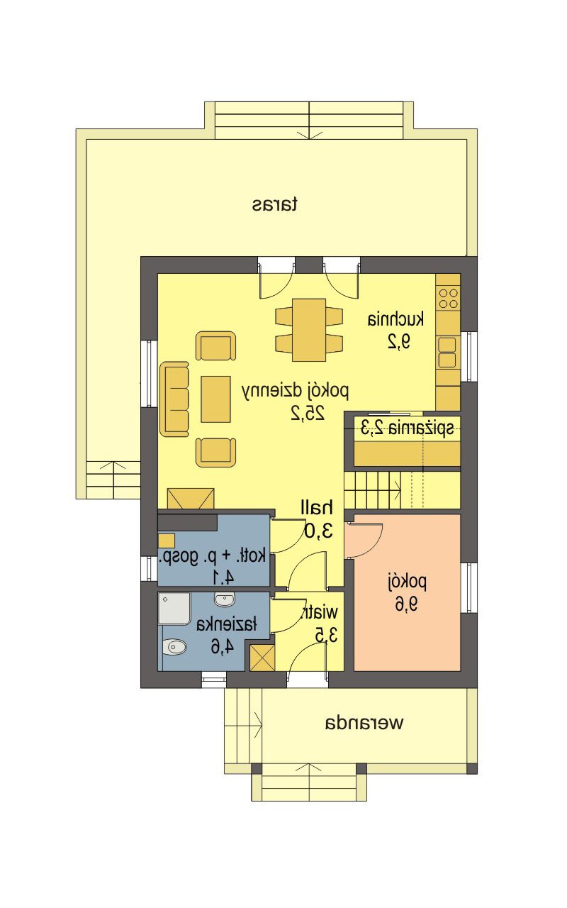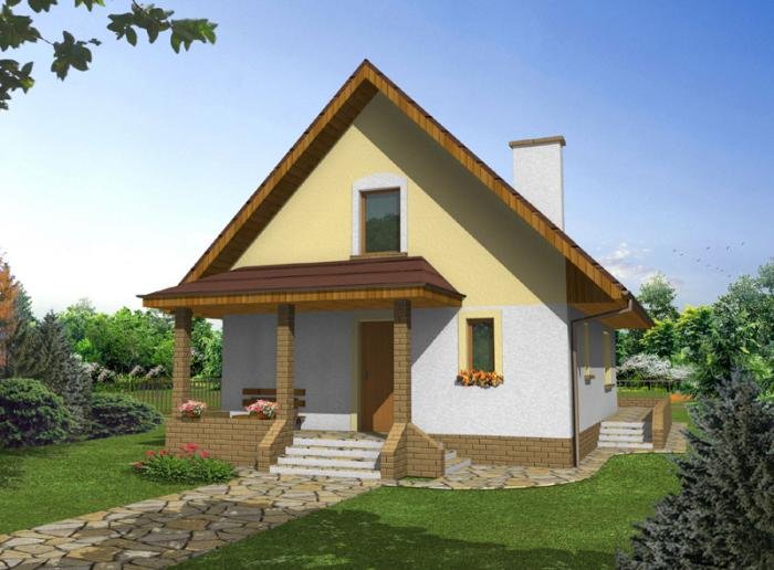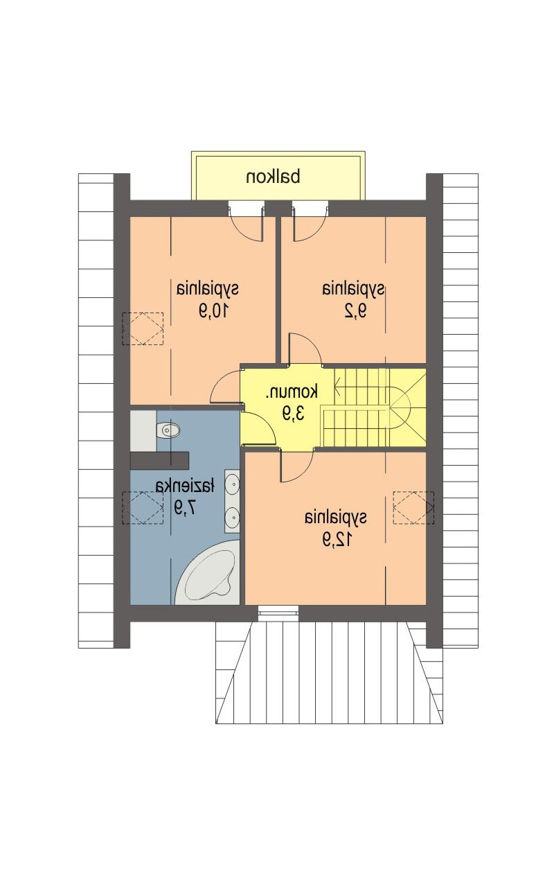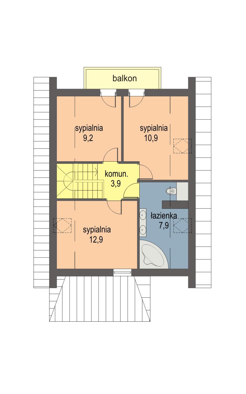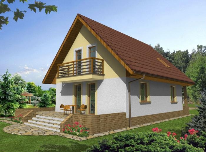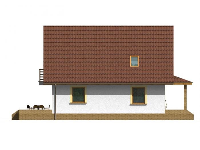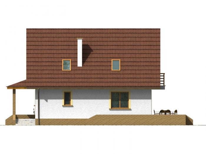 Przemek jest niewielkim, ale wygodnym, parterowym domem z użytkowym poddaszem, przeznaczonym dla 4-5 osobowej rodziny. Od frontu zlokalizowano urokliwą werandę, osłaniającą strefę wejściową domu i umożliwiającą mieszkańcom odpoczynek również od strony wejściowej domu. Część dzienna na parterze składa się z wiatrołapu, hallu, wygodnej kuchni ze spiżarnią, pokoju dziennego wychodzącego na taras ogrodowy, łazienki i kotłowni z pom. gospodarczym oraz pokoju gościnnego. Część nocną na poddaszu tworzą: trzy wygodne sypialnie w tym dwie z balkonem od ogrodu, hall i duża łazienka. Dom jest bardzo funkcjonalny - układ pomieszczeń pozwala na wygodne użytkowanie wszystkich pomieszczeń przez domowników. Istnieje możliwość zagospodarowania werandy na pomieszczenie użytkowe.