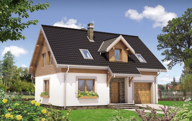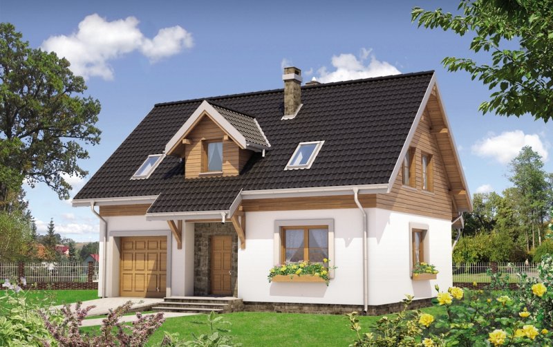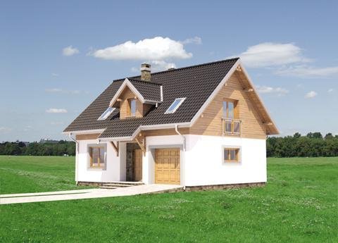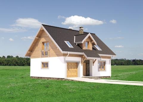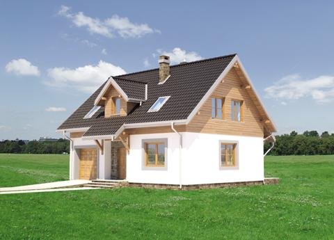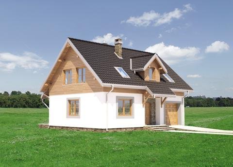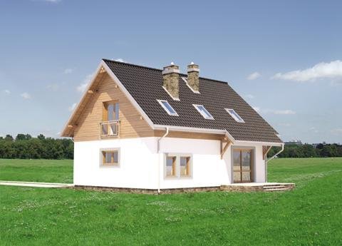 Projekt domu Ptyś należy do rozwiązań parterowych z użytkowym poddaszem i wbudowanym garażem o zdyscyplinowanym, prostokątnym zarysie i dwuspadowym dachu o kalenicy równoległej do drogi dojazdowej. Wśród takich prostych, ekonomicznych rozwiązań z przedziału wielkości 90-100 m2 p.u. Ptysia wyróżnia wejście osłonięte daszkiem z niewielką lukarną. Zastosowano w nim nieskomplikowany, czytelny konstrukcyjnie podział rzutu ścianami nośnymi na trzy strefy funkcjonalne. Wejściowa część z holem i schodami na poddasze rozdziela szerszy trakt gospodarczy i najprzestronniejszy - pokój dzienny. Tak jak w zbliżonych projektach domów Tomir Lux i Tola Mini salon i kuchnia tworzą jedną, swobodną i obszerną, dobrze oświetloną przestrzeń życia rodzinnego. Miejsce pod schodami wykorzystano na przejście do kotłowni z wc, znajdującej się za garażem. Pomieszczenia drugiej kondygnacji to trzy wygodne sypialnie dla 5 osób, w tym główna z własną garderobą i duża, jasna łazienka. Oszczędne rozwiązania architektoniczne w projekcie domu Ptyś podkreśla brak balkonów balkonami w ścianach szczytowych.
