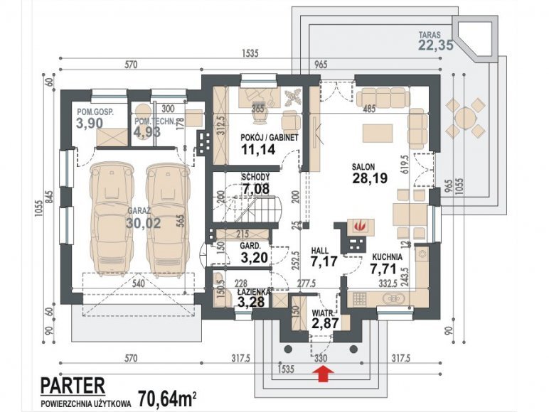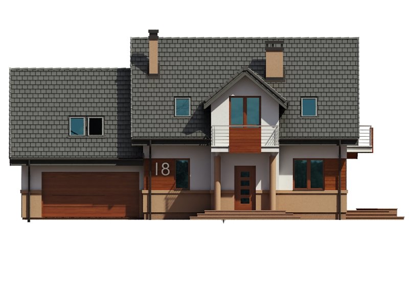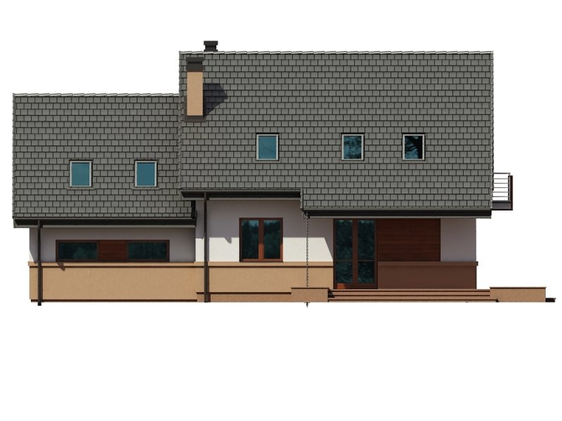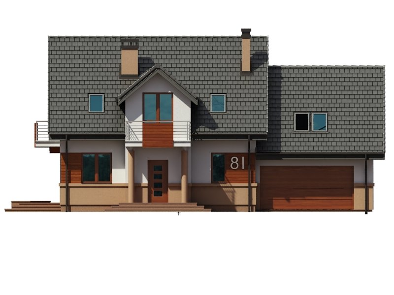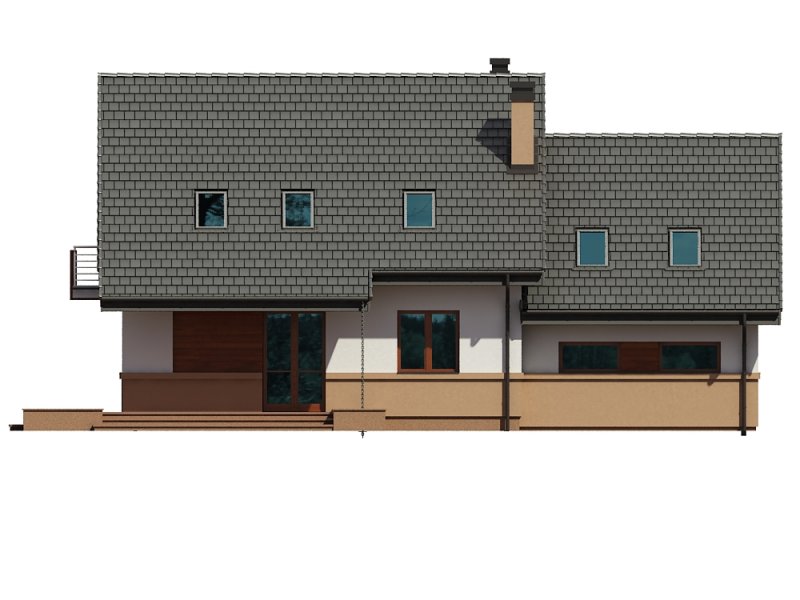 W parterowej części frontowej domu znajduje się kuchnia z aneksem jadalnym połączona z salonem, który usytuowano tak aby zapewnić dobrą ekspozycję zarówno w elewacji bocznej jak i tylnej. Program użytkowy parteru uzupełniają: pokój (gabinet -który można połączyć z salonem), łazienka z prysznicem i garderoba, a ponadto dwustanowiskowy garaż, kotłownia na olej lub gaz lub paliwo stałe (np. ekogroszek, pelety) i pomieszczenie gospodarcze. Strefę nocną sytuowaną na poddaszu tworzą trzy pokoje przeznaczone dla dzieci ,garderoba i łazienka oraz oddzielna, przestronna część dla rodziców składająca się z dużej sypialni, garderoby i łazienki.