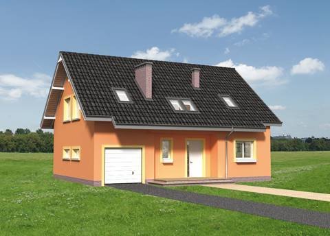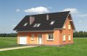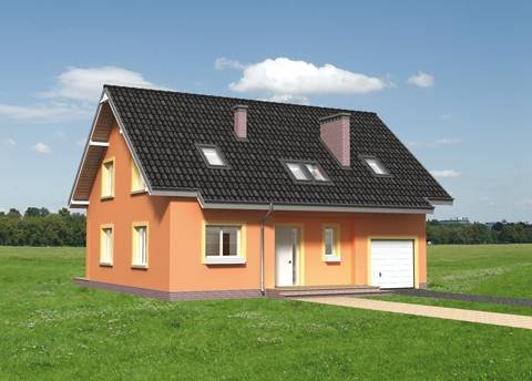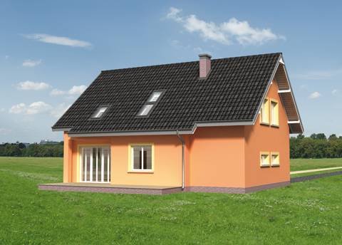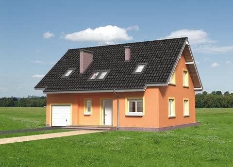 Na parterze znajdują się: kuchnia z jadalnią, pokój dzienny, kotłownia dostępna z sieni oraz w.c. -dostępne z holu, a także garaż z pomieszczeniem gospodarczym. Na poddaszu zlokalizowano 4 sypialnie i 2 łazienki. Dom o rzucie zbliżonym do prostokąta, przykryty dachem o kącie nachylenia 40°. Główne wejście i wyjście do ogrodu zaakcentowane podcieniami.