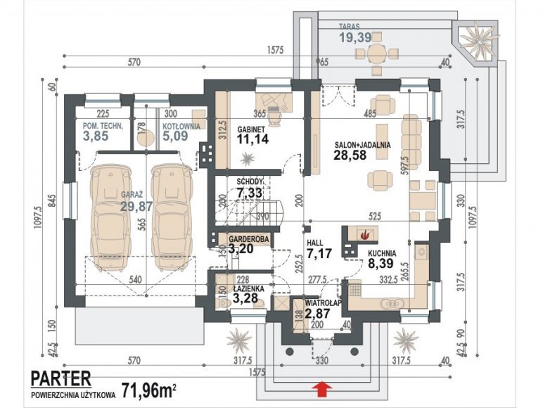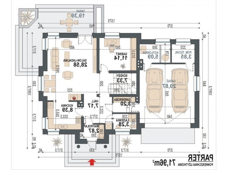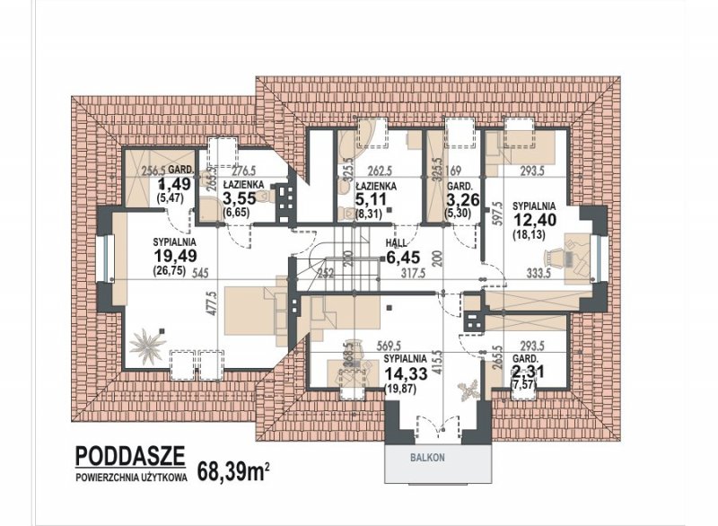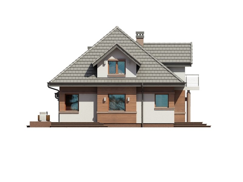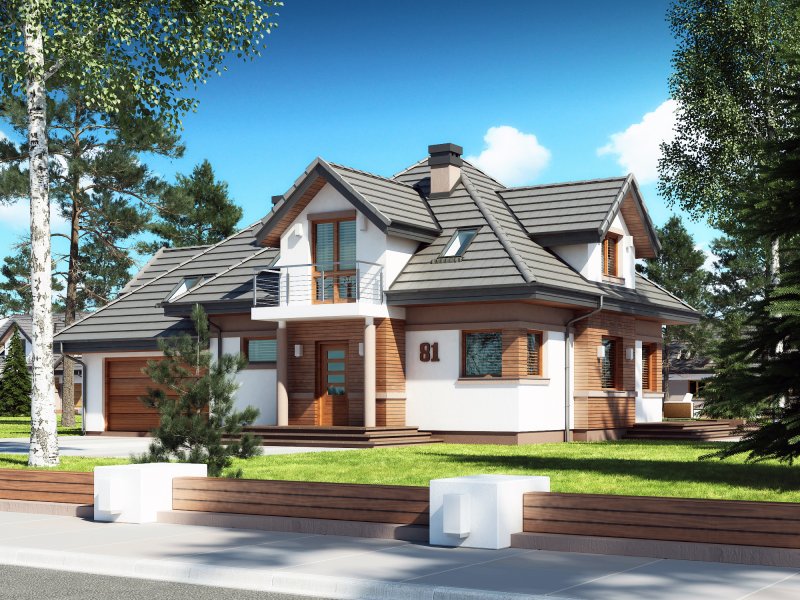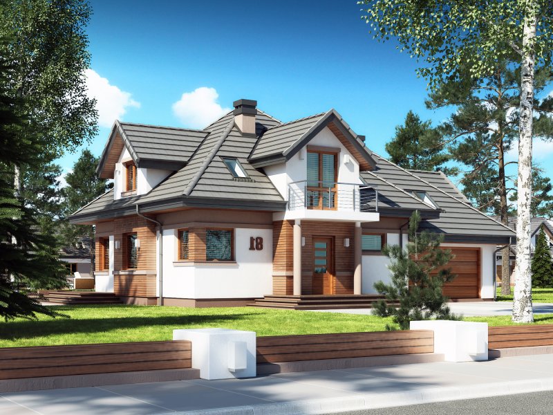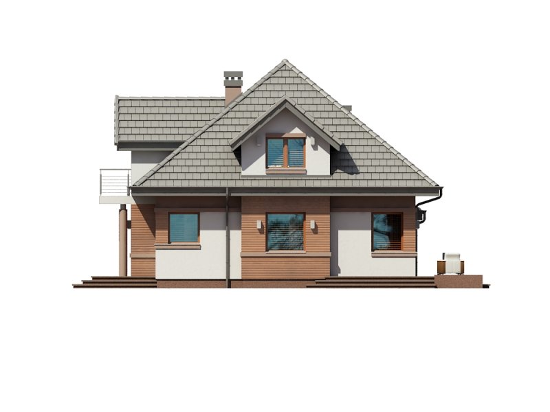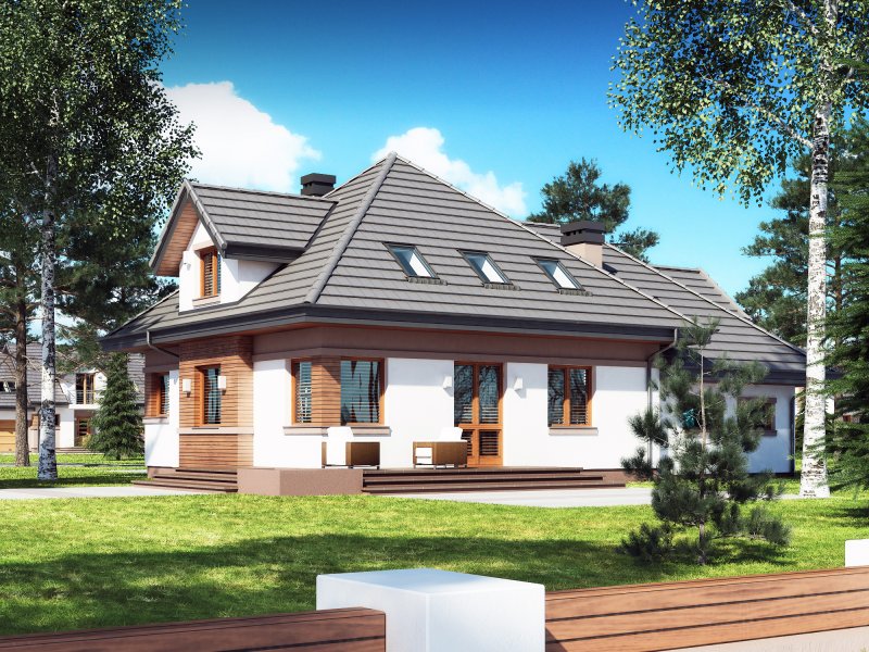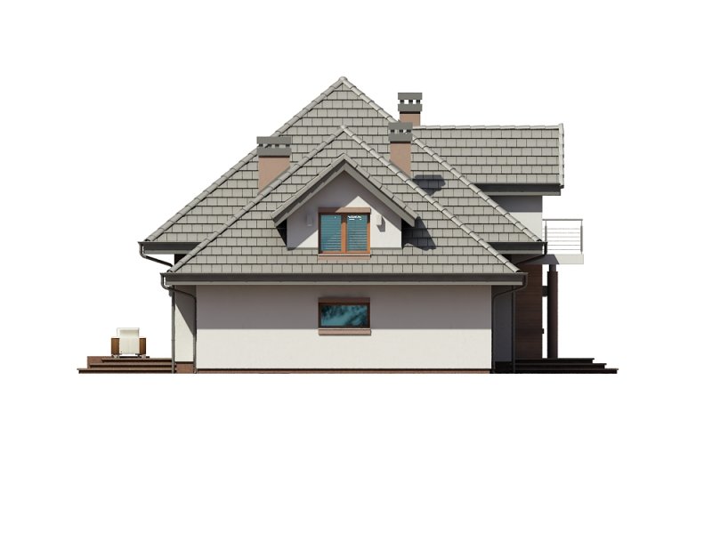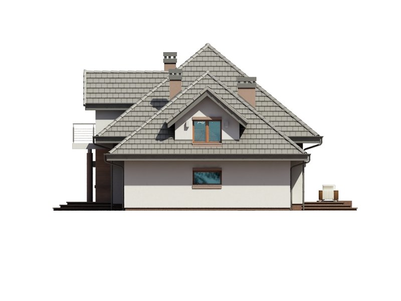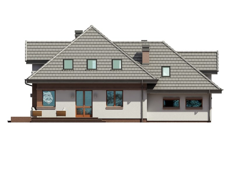 Jest to wersja stylowego, klasycznego domu Rumcajs N z podwójnym garażem. Zastosowanie większego garażu korzystnie wpłynęło na powierzchnię użytkową i funkcjonalność pokoju nad garażem – ma on teraz o 6,5 m? większą powierzchnię użytkową i dwa dodatkowe pomieszczenia: garderobę i przestronną łazienkę. Taki układ pokoju powoduje, że jest to idealne miejsce na sypialnię rodziców. Pozostałe pokoje na poddaszu są bardzo przestronne, dzięki czemu można w różny sposób aranżować ich wystrój, co w małych przestrzeniach jest mocno ograniczone. Dwie garderoby – w tym jedna ogólnodostępna – również podnoszą komfort użytkowania. Rozplanowanie wszystkich pomieszczeń – zarówno na parterze jak i na poddaszu – jest tak zaprojektowane, by zmninimalizować przestrzenie komunikacyjne na rzecz powierzchni użytkowych. Niewątpliwą zaletą parteru jest dodatkowy pokój w tylnej części domu idealnie pasujący na gabinet lub jako dodatkowa sypialnia dla domowników lub gości.