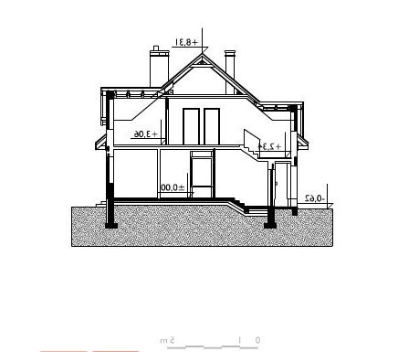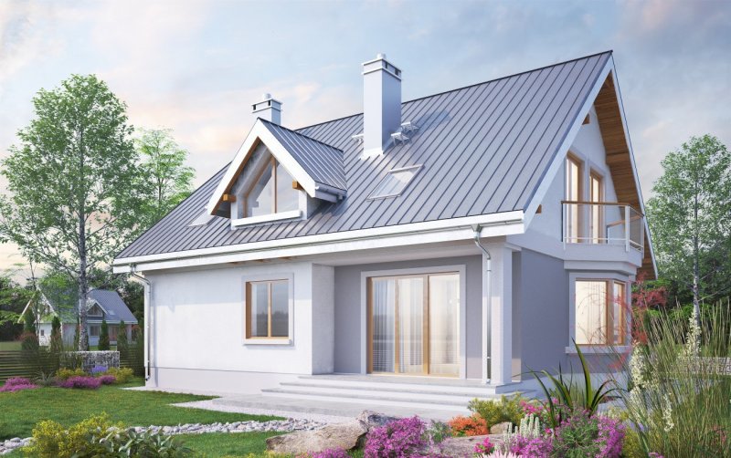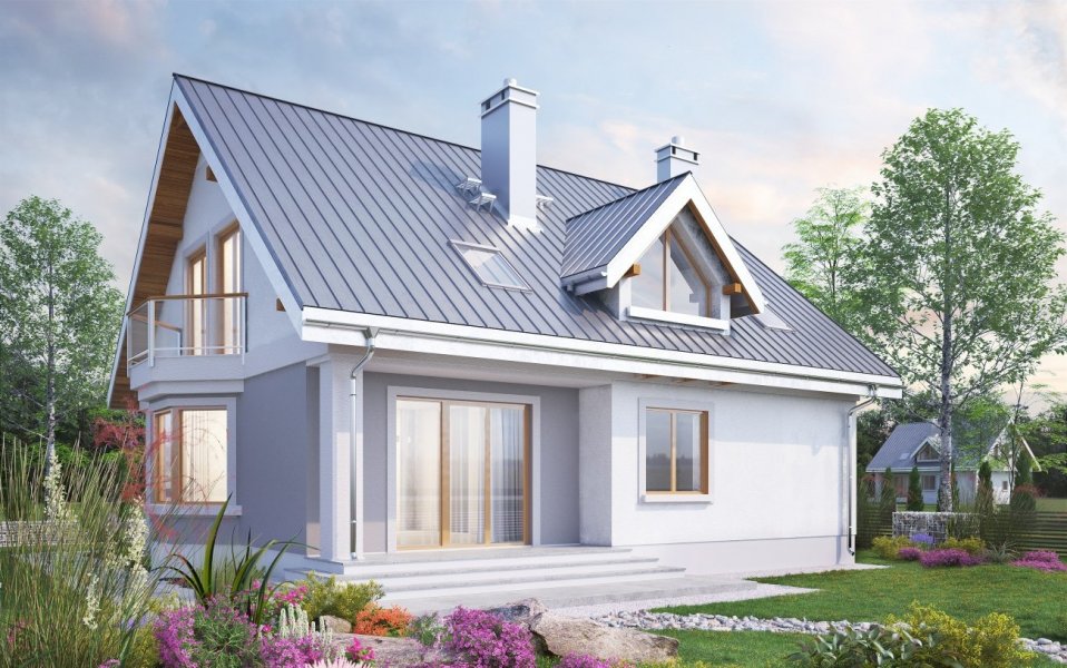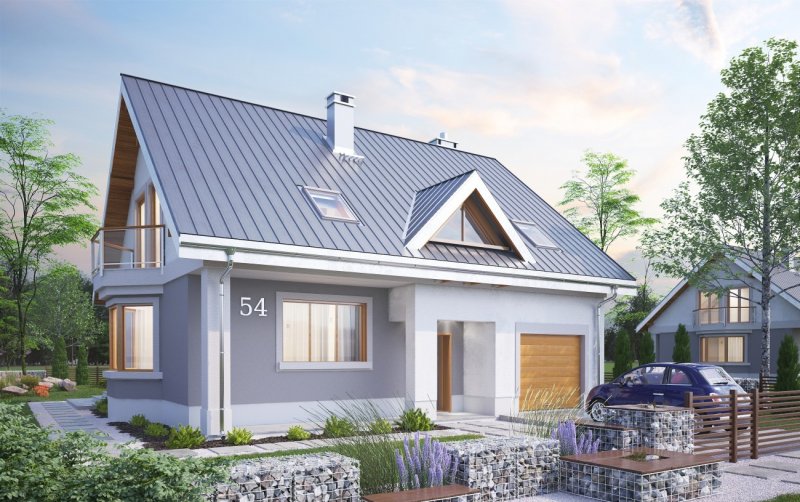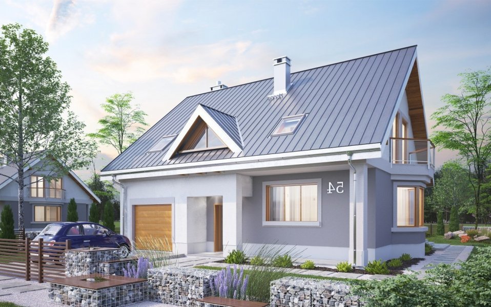 Skromniejszy wielkością niż Saba, projekt domu Saba Mała proponuje pojedynczy garaż w bryle i o 20m2 szczuplejszą powierzchnię. Poza tym sylwetka budynku i program użytkowy w obu rozwiązaniach są bardzo zbliżone. Płytkie, narożne wnęki ze słupami osłaniają wejście frontowe z dużym oknem kuchennym, a z tyłu - otwarcie jednoprzestrzennego pokoju dziennego na ogród. Razem z ryzalitem jadalni w ścianie bocznej tworzy to dość zróżnicowany obrys parteru, który wyróżniając się w tej grupie wielkości (ok.125m2) domów z dwuspadowym dachem, ma jednocześnie w jedne z najbardziej zbliżonych do kwadratu wymiarów. Konkuruje w tym względzie z Oberkiem ale Sabę wybiorą te osoby, które chciałyby mieć ponadto dodatkowy pokój na parterze lub planowały powiększyć jego kosztem kotłownię (czy zamienić ją np. na warsztat przy garażu), bo to właśnie umożliwia układ ścian nośnych w projekcie domu Saba. Dwie symetryczne względem kalenicy, niewielkie lukarny doświetlają wygodne schody oraz łazienkę po drugiej stronie strefy komunikacji poddasza. Cztery sypialnie są niewiele mniejsze iż w Sabie, a zamiast loggii nad garażem przewidziano drugi balkon w ścianie szczytowej.