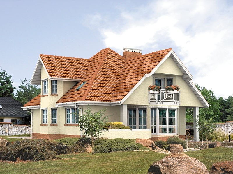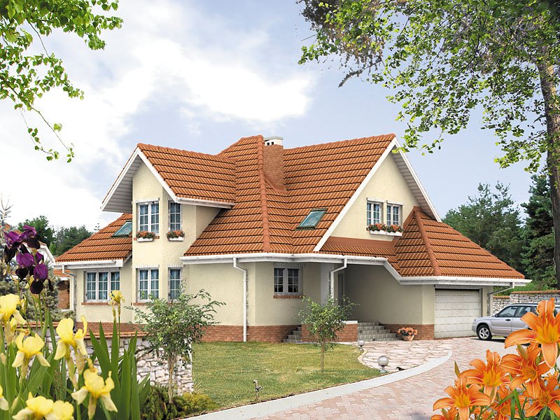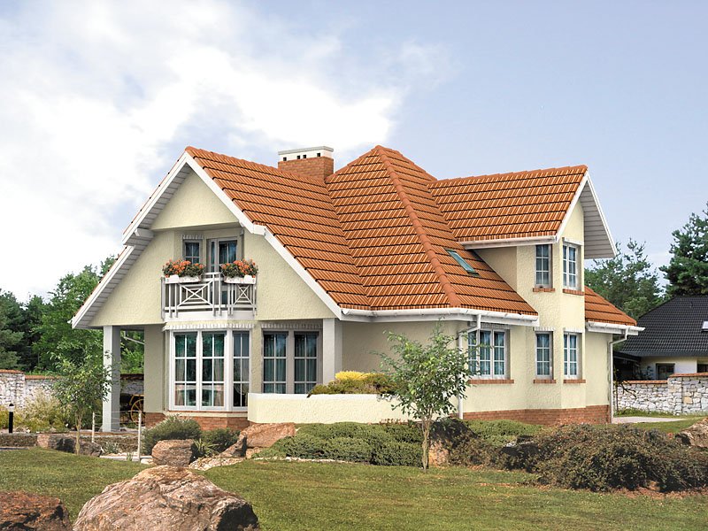 Ściany: 3-warstwowe - pustak ceramiczny, Stropy: żelbetowe, wylewane, Dach: blachodachówka, kąt nachylenia 43°