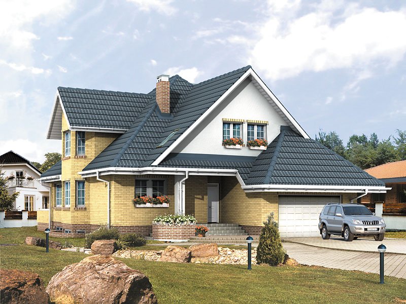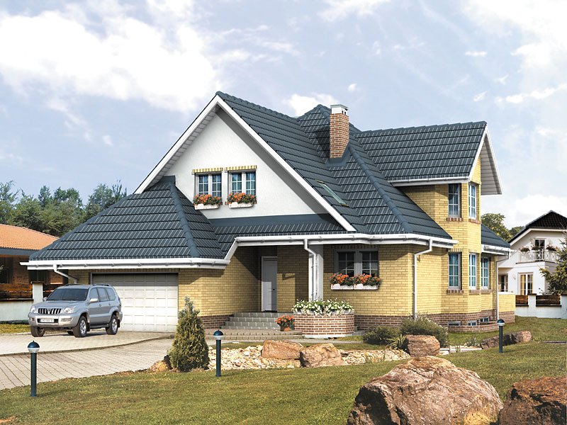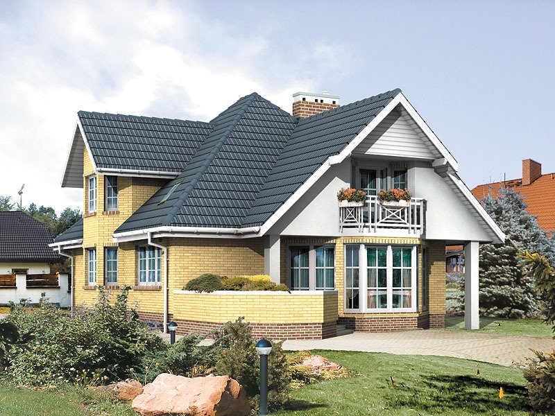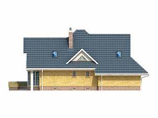 Ściany: 3-warstwowe - pustak ceramiczny, Stropy: żelbetowe, wylewane, Dach: blachodachówka, kąt nachylenia 43°