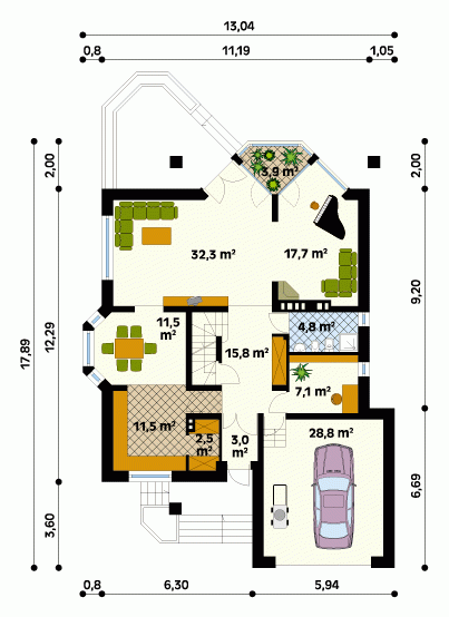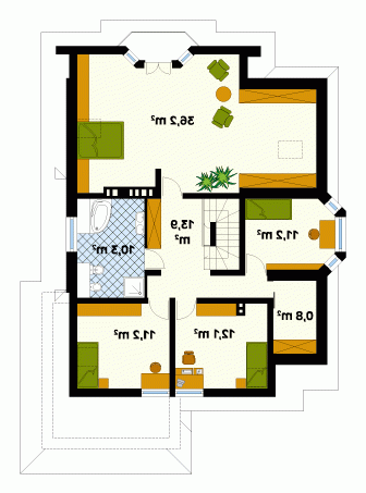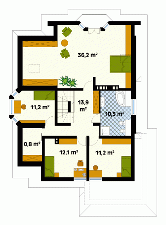 Dom jednorodzinny, wolno stojący, parterowy z użytkowym poddaszem i podpiwniczeniem. Rozbudowana część dzienna i wygodne sypialnie na poddaszu.