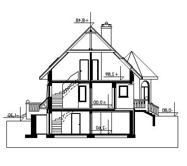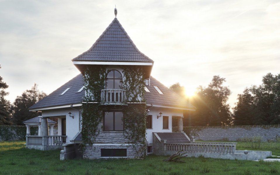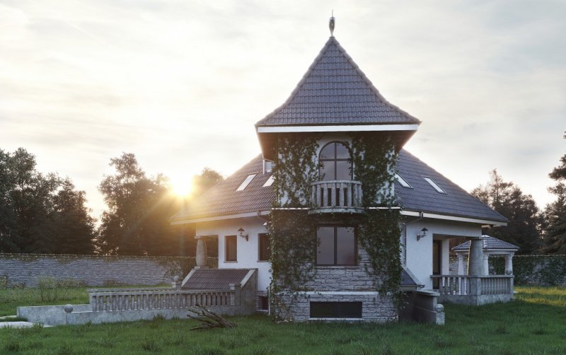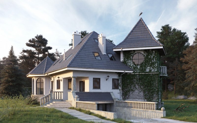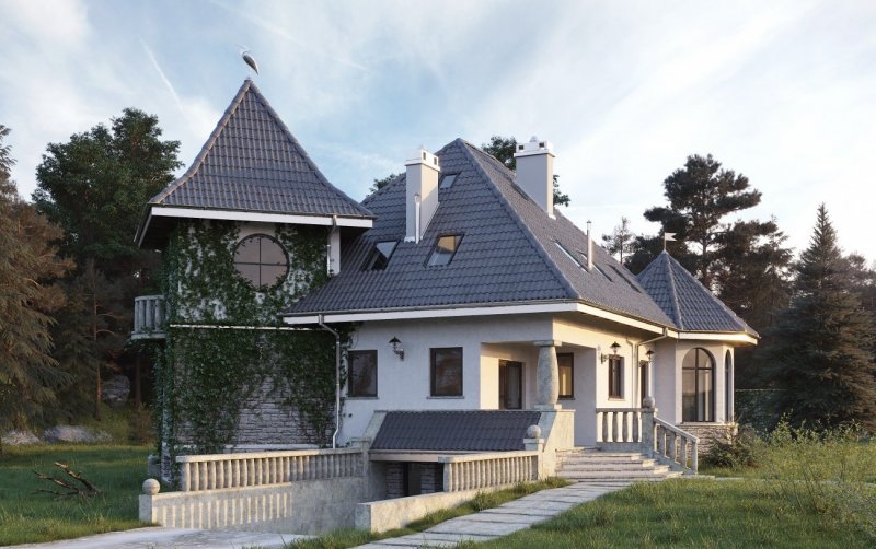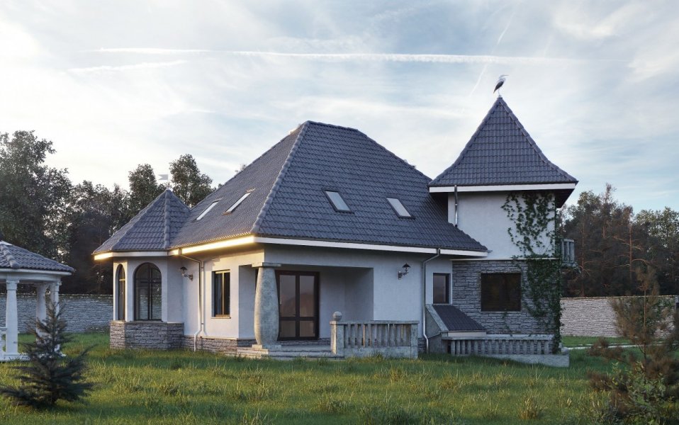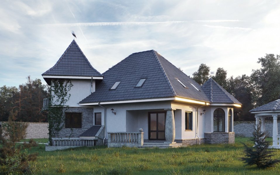 Wejście do budynku z podcienia. Na parterze zlokalizowano: pokój dzienny, kuchnię, pokój, łazienkę oraz hol, wymkniętą klatkę schodową do piwnicy, sień oraz otwarte schody na poddasze. Na poddaszu są 3 pokoje, łazienka, garderoba i przedpokój. Budynek posiada podpiwniczenie, w którym umieszczono pom. hobby, spiżarkę, pom. gospodarcze z w.c., korytarz oraz garaż. Malowniczy dom o zróżnicowanym dachu, z podcieniem wejściowym i ogrodowym. Oryginalności dodają mu wieża i alkierz oraz charakterystyczne grube kamienne kolumny.