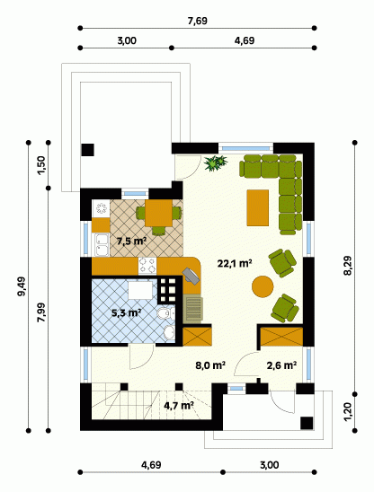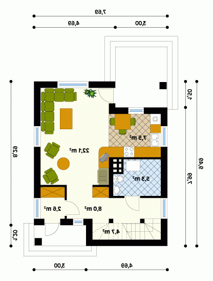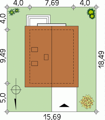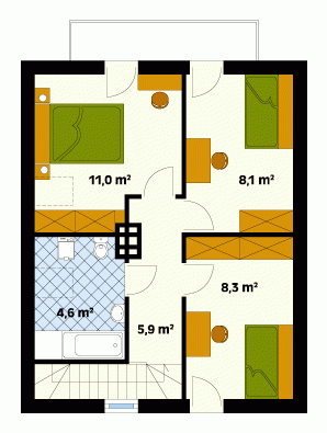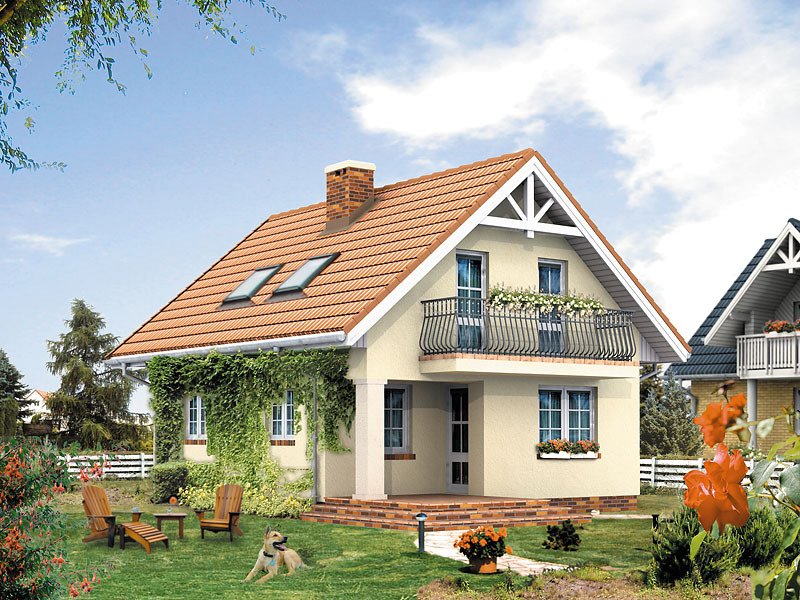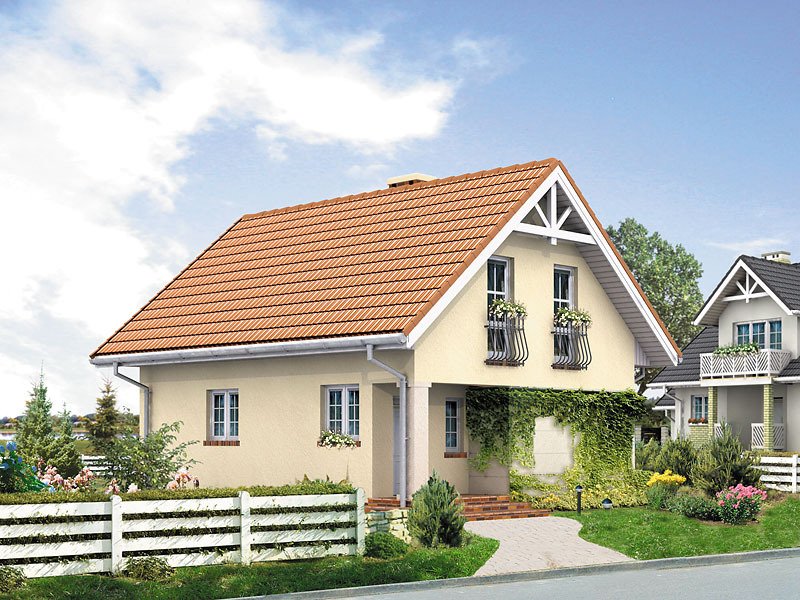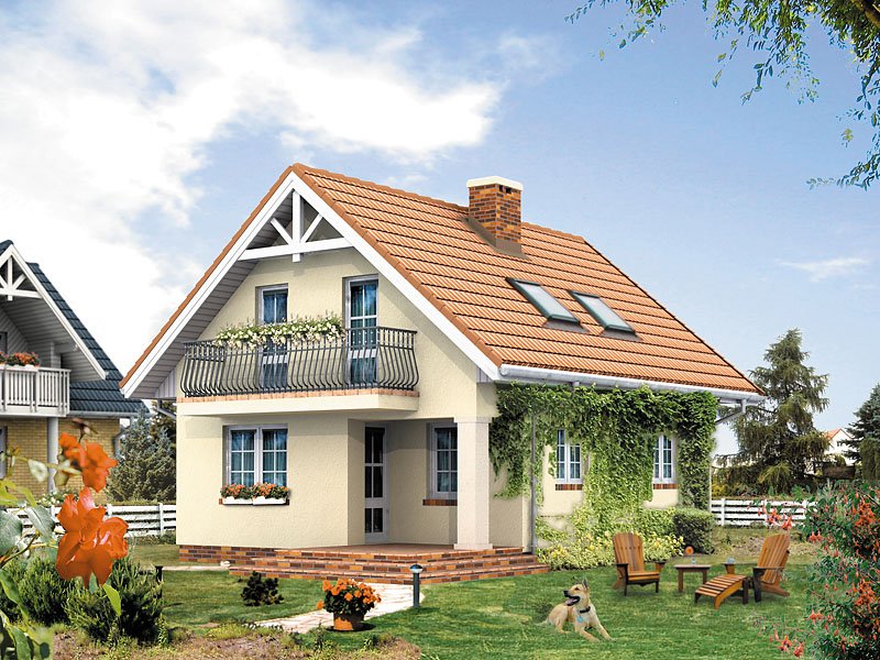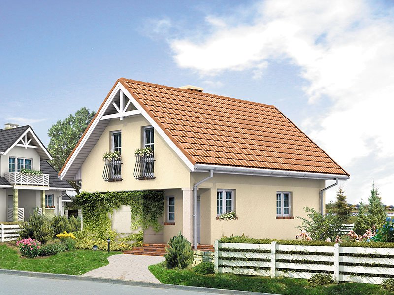 Mały dom jednorodzinny z użytkowym poddaszem o prostej i tradycyjnej bryle. Wyraźny podział funkcjonalny na część dzienną (parter) i nocną (poddasze). Na parterze zlokalizowano pokój dzienny, kuchnię z jadalnią i pomieszczenie gospodarcze; na poddaszu znajdują się trzy sypialnie i łazienka.