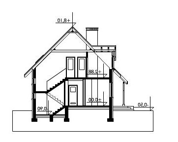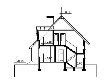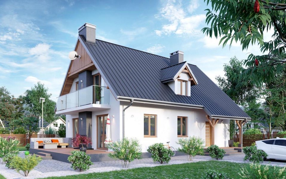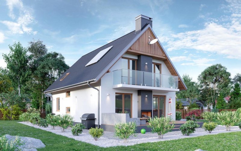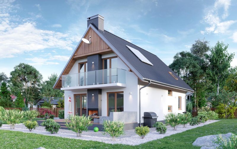Niewielki dom z zaprojektowanym w poziomie parteru obszernym pokojem dziennym z jadalnią, kuchnią, dodatkowym pokojem oraz łazienką. Centralnie zlokalizowany hol łączy poprzez klatkę schodową parter z użytkowym poddaszem. Na poddaszu mieszczą się 4 pokoje sypialne i łazienka. Prostą bryłę budynku stanowi prostopadłościan nakryty dachem dwuspadowym o kącie nachylenia połaci 45°. Bryłę urozmaicają: oparty na słupach podcień wejścia, lukarna oraz zewnętrzny kominek.
