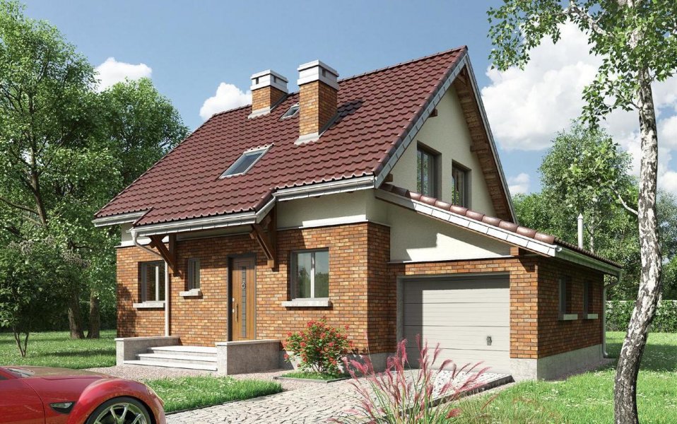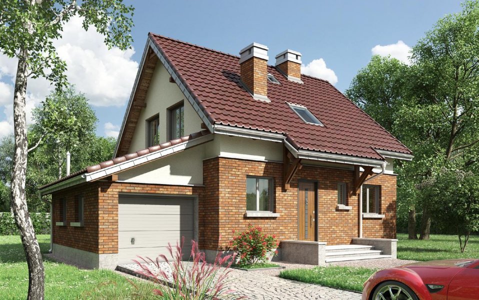 Elewacje: połówkowa cegła klinkierowa + tynk mineralny;