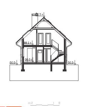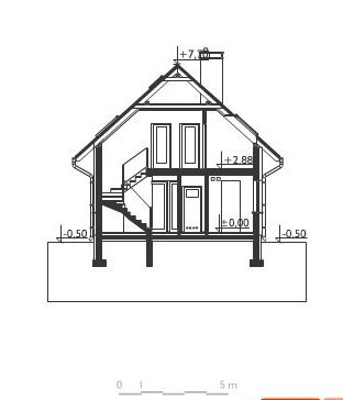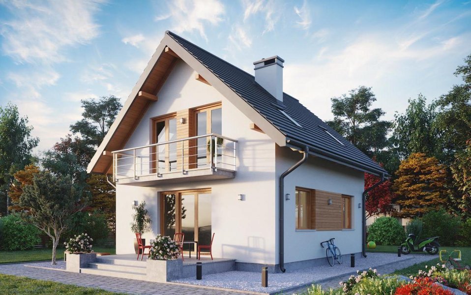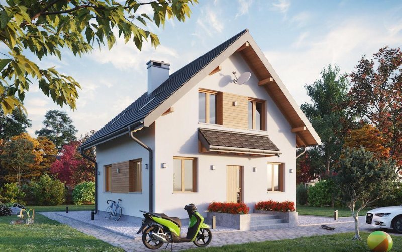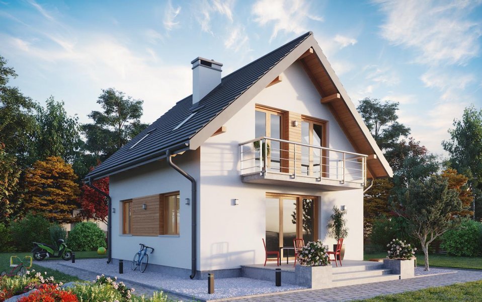 W rodzinie Smyka znalazło się kilka projektów najprostszych i najmniejszych domów parterowych z użytkowym poddaszem. Projekt domu Smyk Solo Twist ma jedną z najskromniejszych powierzchni i, razem z nieco większym Smykiem Neo, nie przewiduje garażu. Zbliżony do kwadratu, zwarty rzut dzieli na dwie części tak, jak we wszystkich wariantach rodziny, ściana nośna. Wyznacza ona po jednej stronie strefę wejścia i komunikacji z kuchnią, wc i kotłownią oraz szeroki salon od ogrodu. Na poddaszu są trzy skromne pokoje i łazienka. Dwuspadowy dach został obrócony w tej wersji o 90º i, odwrotnie niż w innych, ma kalenicę prostopadłą do drogi dojazdowej. Taki układ zaproponowano jeszcze tylko w jednym, większym wariancie - Smyku Twist (tym razem z dostawionym garażem). Oba warianty mają mały pulpitowy daszek nad tarasem wejściowym, a w ścianie szczytowej od ogrodu – balkon otwierany z dwóch sypialni. Podobny rozkład jak w projekcie domu Smyk Twist ale mniejsze bądź większe powierzchnie, inne ustawienie kalenicy, bardziej dekoracyjną bryłę (Smyk Prima z ryzalitem), inne detale znaleźć można wśród pozostałych projektów z Rodziny Smyka.