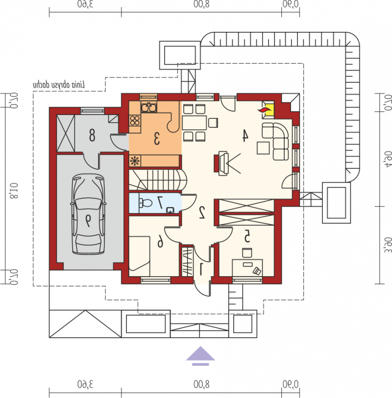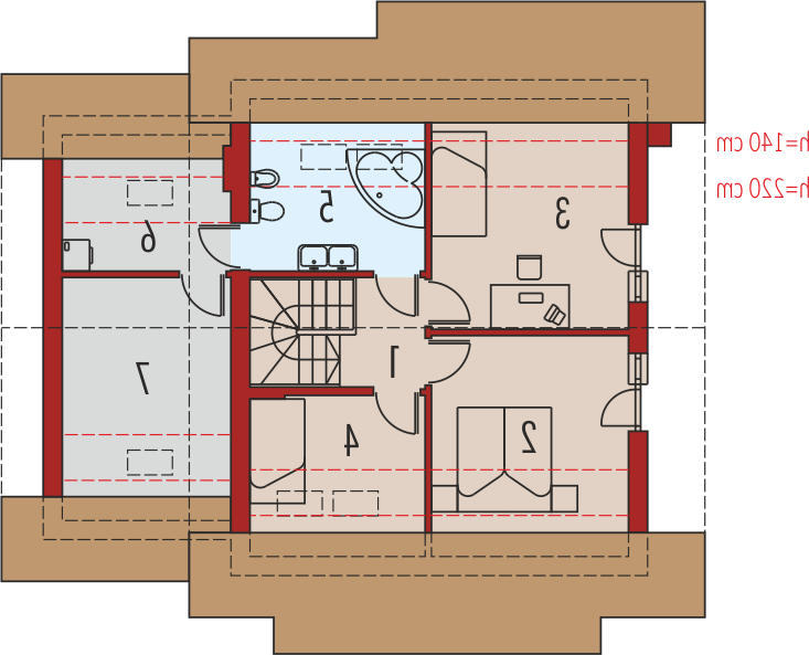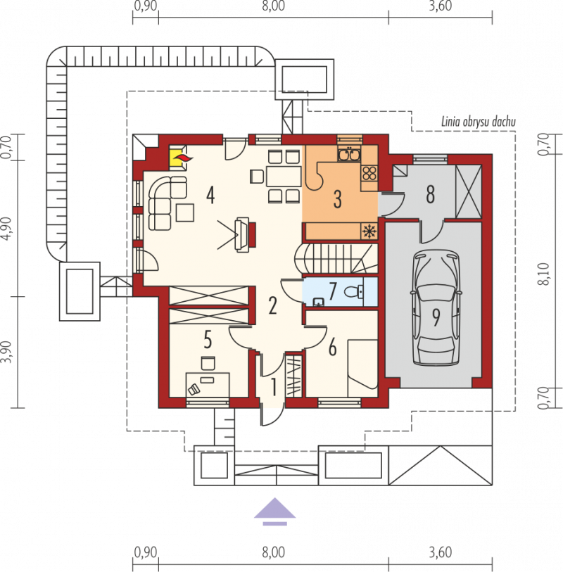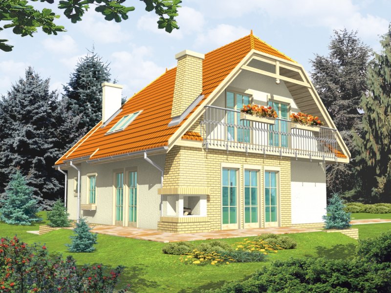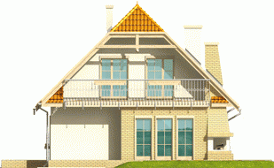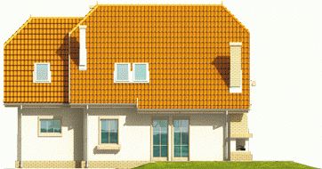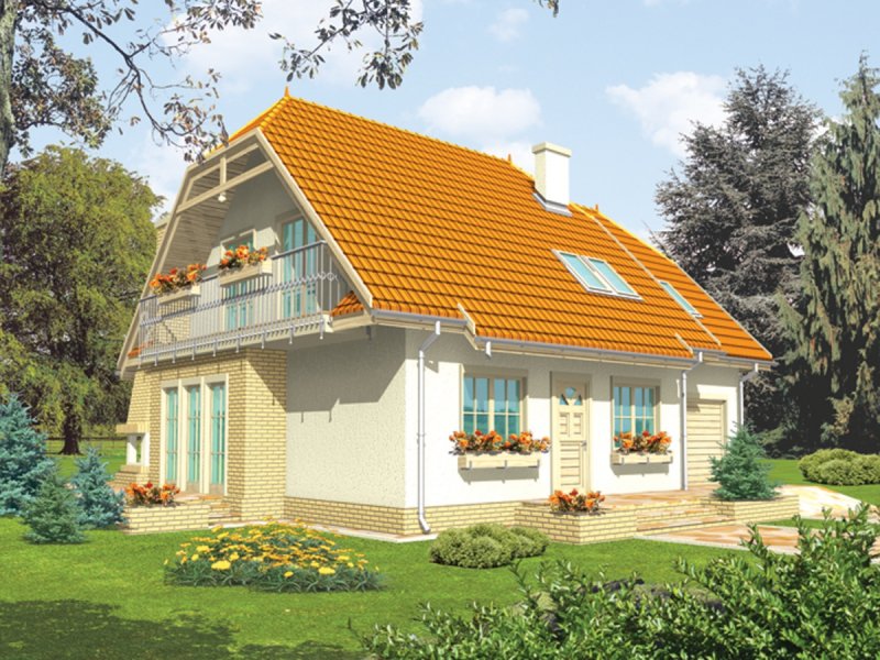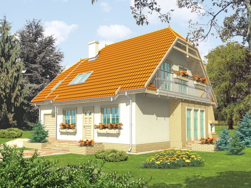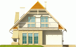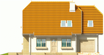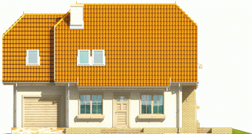 Dom parterowy z użytkowym poddaszem, niepodpiwniczony, z garażem, przeznaczony dla 3-4-osobowej rodziny. Odznacza się prostą konstrukcją i przejrzystym układem funkcjonalnym. Strefa dzienna na parterze to salon połączony z kuchnią, gabinet, pokój i pomieszczenie gospodarcze, na poddaszu znajdują się trzy sypialnie i duża łazienka.