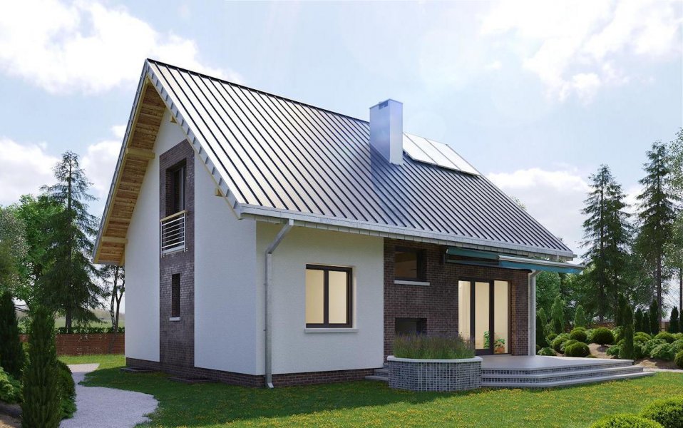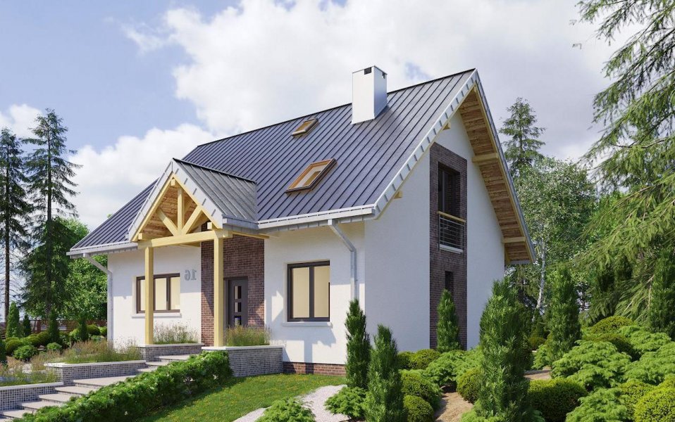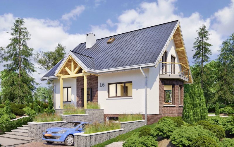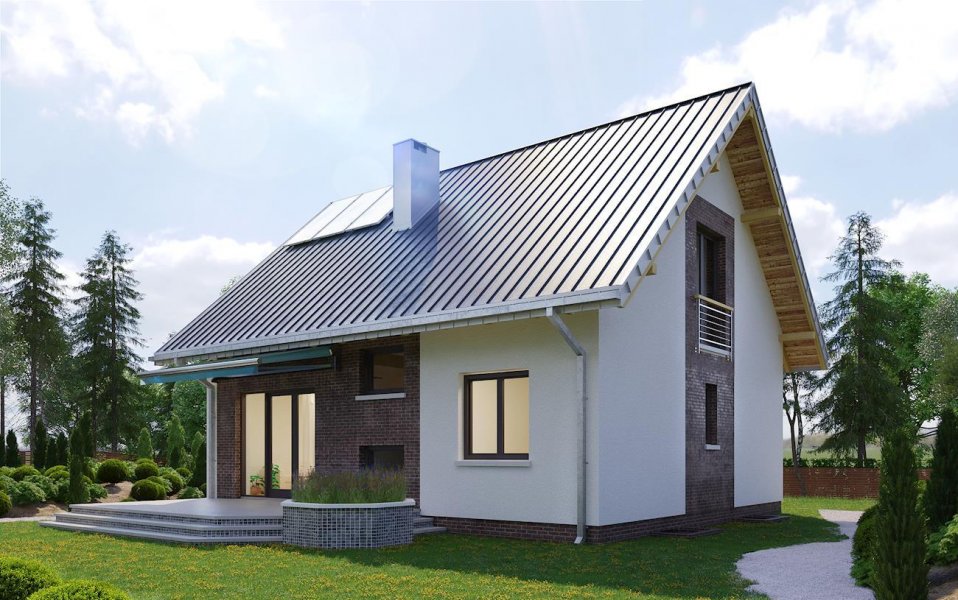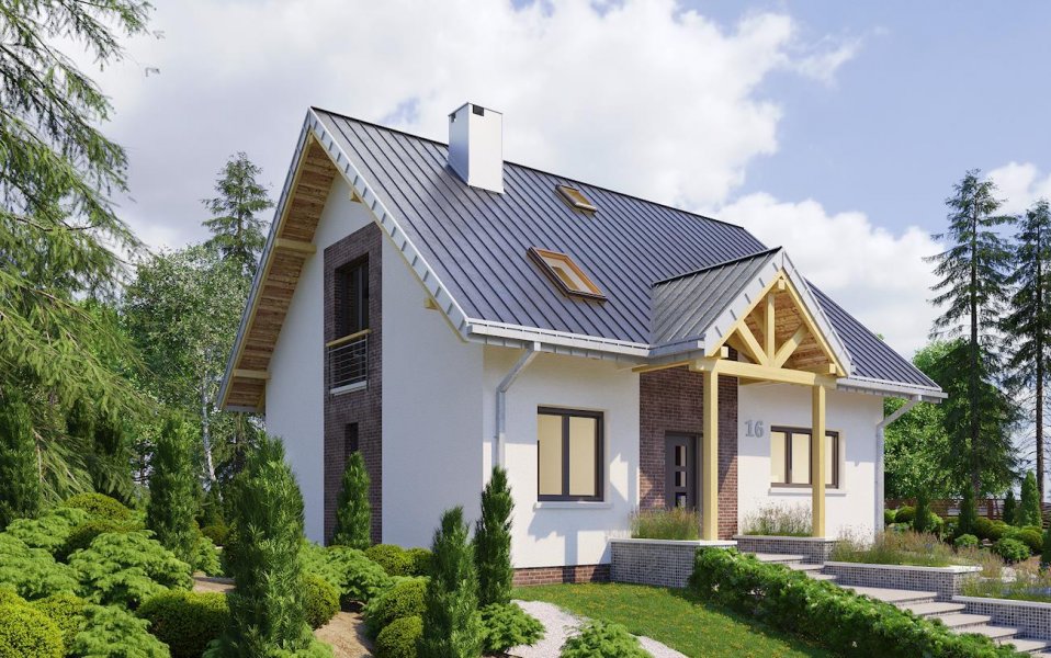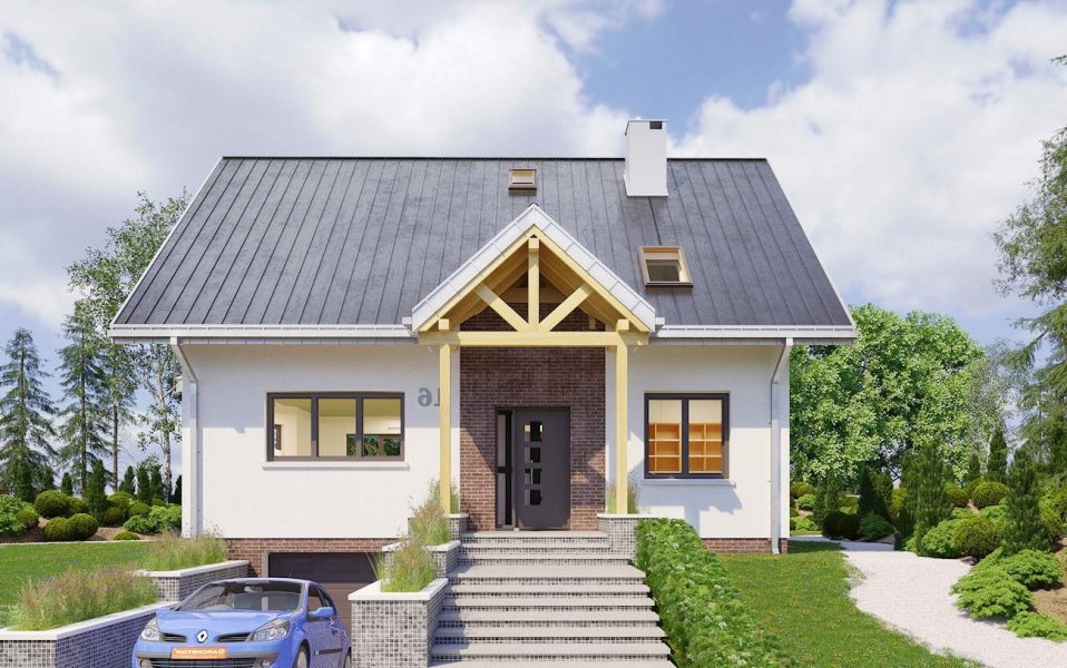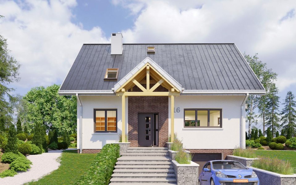 Projekt domu Sonia to projekt - matka i jeden z mniejszych wariantów w Rodzinie Sonii. Należą do niej projekty małych domów parterowych z użytkowym poddaszem i z garażem, powstałe na planie zwartego prostokąta. Szczególną zaletą koncepcji Sonii jest rzadko spotykany układ funkcjonalny parteru. Oprócz całkowicie otwartej kuchni i salonu z kominkiem, przewiduje on dwa dodatkowe, niewielkie pokoje z łazienką. Oddzielono je od strefy dziennej traktem komunikacji. Oszczędną sylwetkę urozmaica, w jednej z elewacji bocznych, ryzalit na planie ośmiokąta. Niesie on jedyny balkon budynku, dostępny z większych sypialni poddasza. Trzecia sypialnia doświetlona jest drzwiami balkonowymi typu porte fenetre. Strefę prywatną zaprojektowano z dużą łazienką i z garderobą. Projekt domu Sonia Mini to kompaktowe rozwiązanie z garażem i z dużą kotłownią w piwnicy. Wymaga węższej działki niż większe rozwiązania, bez podpiwniczenia, z dobudowanym garażem (np. Sonia Lux i Sonia Lux G2). Sonię, oprócz nieco większych rozmiarów, odróżnia od Sonii Mini detal wejścia. Frontowe drzwi osłania tradycyjny daszek wsparty na drewnianych słupkach.