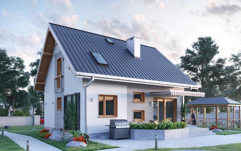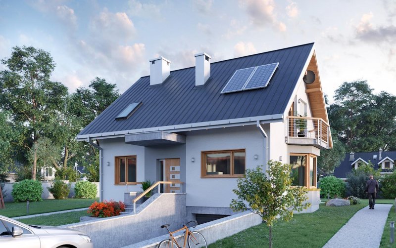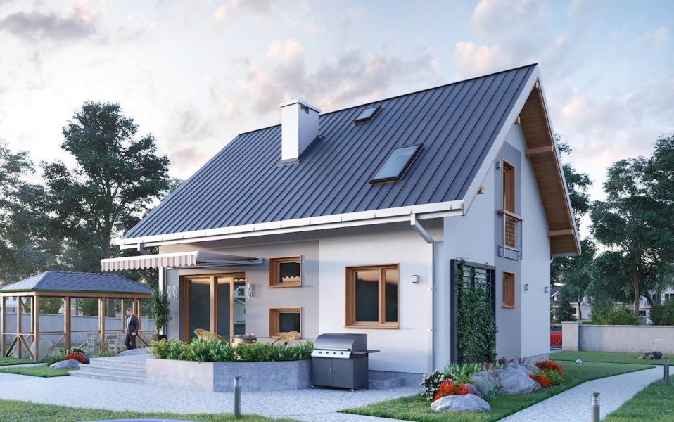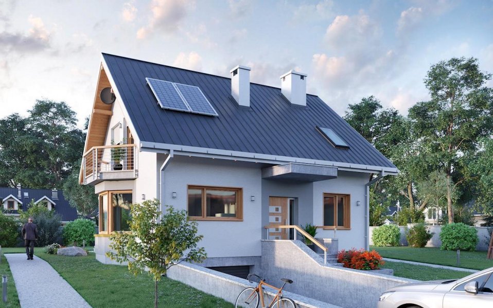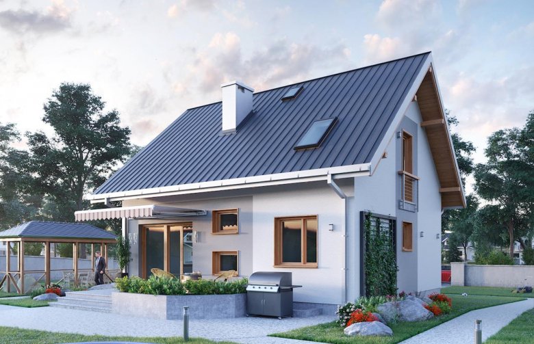 Projekt domu Sonia Mini przedstawia najmniejszy wariant w Rodzinie Sonii. Należą do niej projekty małych domów parterowych z użytkowym poddaszem powstałe na planie zwartego prostokąta. Szczególną zaletą koncepcji Sonii jest rzadko spotykany układ funkcjonalny parteru. Oprócz całkowicie otwartej kuchni i salonu z kominkiem, przewiduje on dwa dodatkowe, niewielkie pokoje z łazienką. Oddzielono je od strefy dziennej traktem komunikacji. Oszczędną sylwetkę urozmaica ryzalit na planie ośmiokąta niosący balkon w elewacji bocznej. Projekt domu Sonia Mini to kompaktowe rozwiązanie z garażem i z dużą kotłownią w piwnicy. Wymaga węższej działki niż większe rozwiązania, bez podpiwniczenia, z dobudowanym garażem (np. Sonia Lux i Sonia Lux G2). Trzy sypialnie z dużą łazienką i z garderobą zajmują użytkowe poddasze. Sonię Mini, oprócz najmniejszych rozmiarów, wyróżnia w rodzinie prostota i dowcip zaproponowanego detalu. W wizualizacji uformowano jednolity kolorystycznie pas, który zaczyna się od ścieżki prowadzącej do domu, wspina po schodach i tarasie wejściowym, dalej po elewacji, żeby na końcu zawisnąć pod okapem w formie płaskiego daszku.