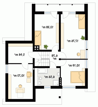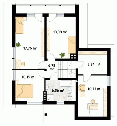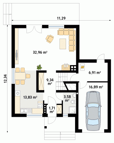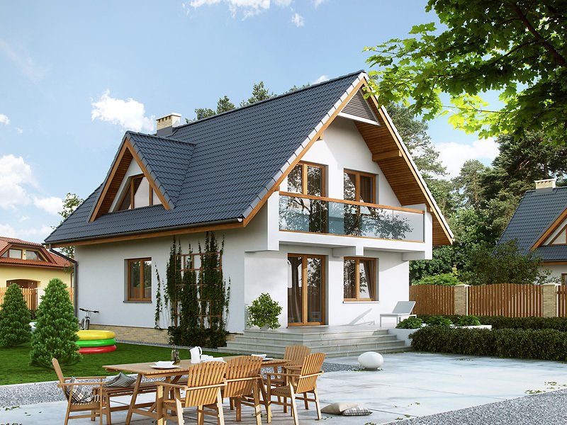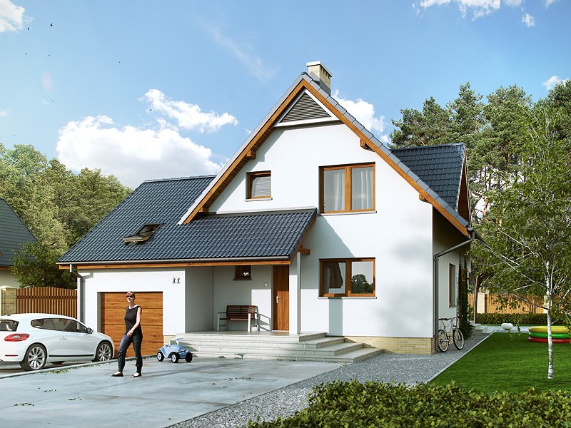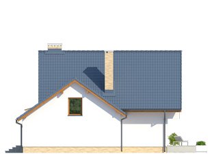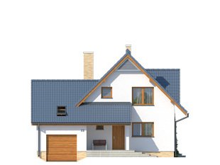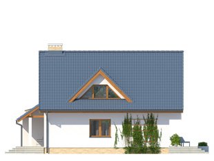Dom jednorodzinny, parterowy z użytkowym poddaszem, niepodpiwniczony. Niewielki dom o zwartej bryle i racjonalnym układzie wewnętrznym. Na parterze kuchnia z jadalnią, pokój dzienny z kominkiem. Na poddaszu wygodna łazienka i sypialnie. Nad garażem strych lub pracownia.