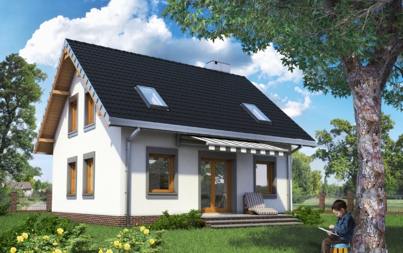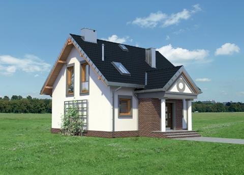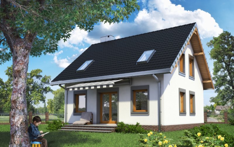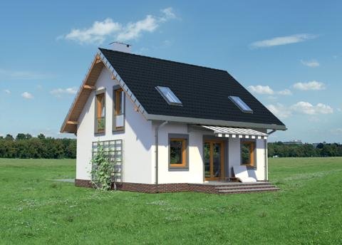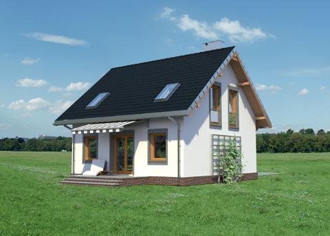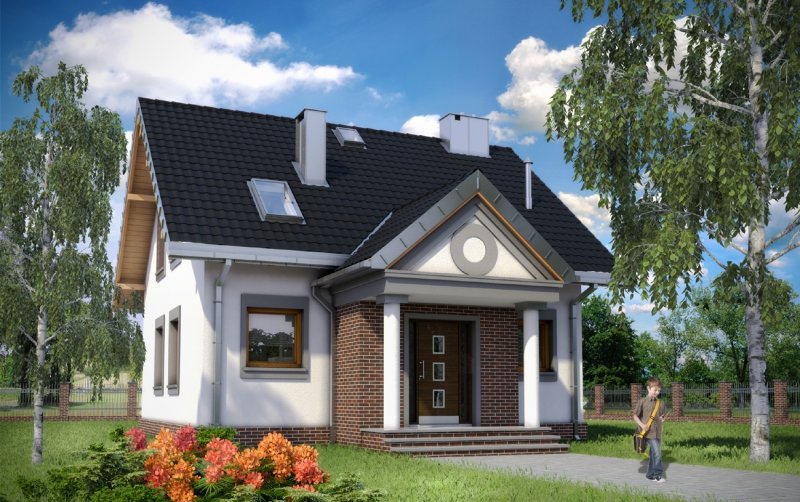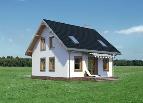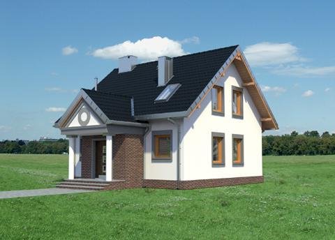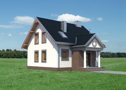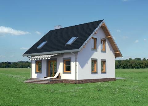 Układ parteru z wyjątkowo dużym (32m2!) pokojem dziennym i z dużą kuchnią to wyjątkowe rozwiązanie dla domu o powierzchni użytkowej poniżej 100m2. Projekt domu Staś ma taką właśnie rozległą przestrzeń życia rodzinnego. Przy otwartym holu, z szafą zabudowaną pod schodami, zlokalizowano jeszcze sporą kotłownię i łazienkę. Można je, w razie potrzeby, łatwo połączyć w jedno przestronne pomieszczenie gospodarczo-sanitarne. Nieskomplikowany, ekonomiczny układ konstrukcyjny parteru przekłada się na logiczny, wygodny rozkład poddasza z trzema sypialniami i piękną łazienką. Projekt domu Staś to jedyna propozycja z tego zakresu wielkości domów bez garażu, w której kwadratowy plan przekryto dwuspadowym dachem z kalenicą równoległą do drogi dojazdowej. Proporcje rzutu decydują o tym, że przeznaczona być może na wąską działkę. Koncepcję wyróżnia ponadto zabudowany, klasyczny fronton z przedsionkiem wypchniętym z elewacji wejściowej. Poza tym detalem, architektura budynku jest prosta, a elewacje skomponowane symetrycznie, co podkreśla zwarty kształt sylwetki.
