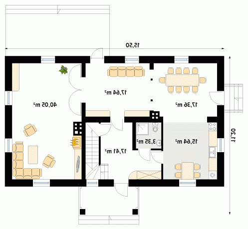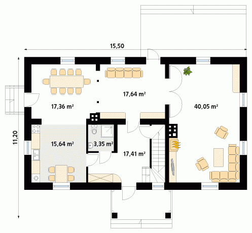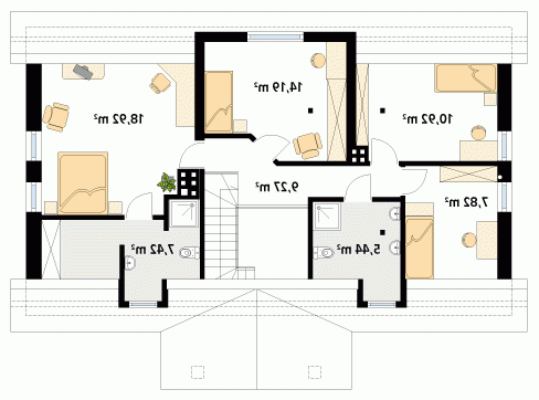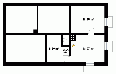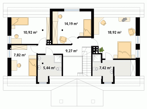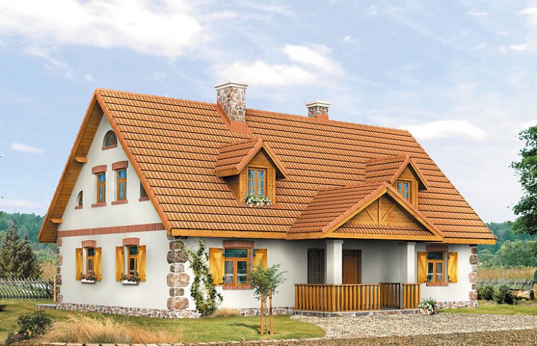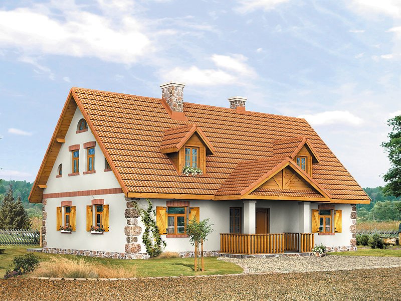 Dom parterowy z poddaszem użytkowym, podpiwniczony, dla 4 – 5-osobowej rodziny. Na parterze zaprojektowano pomieszczenia tzw. strefy dziennej: pokój, dużą jadalnię, kuchnię i łazienkę. Na poddaszu znajdują się pomieszczenia strefy nocnej – cztery sypialnie i dwie łazienki.
