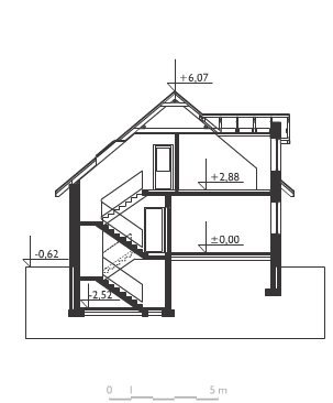 Wejście poprzez sień do holu. Na wprost wejście do pokoju dziennego, na lewo klatka schodowa (zejście do piwnicy i wejście na poddasze) oraz przejście do garażu. Obok wejście do pokoju gościnnego. Na prawo z holu dostępna jest kuchnia i łazienka. W piwnicy znajdują się pomieszczenia gospodarcze i kotłownia. Na poddaszu są 4 pokoje sypialne i łazienka. Dom o ciekawej formie dwóch prostopadłościanów o zróżnicowanej wielkości, zestawionych ze sobą bokami. Dwie malownicze lukarny na poddaszu, "wykusz" jadalni i interesująca forma balkonu nadają budynkowi oryginalny charakter.