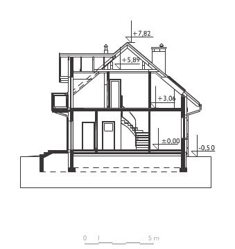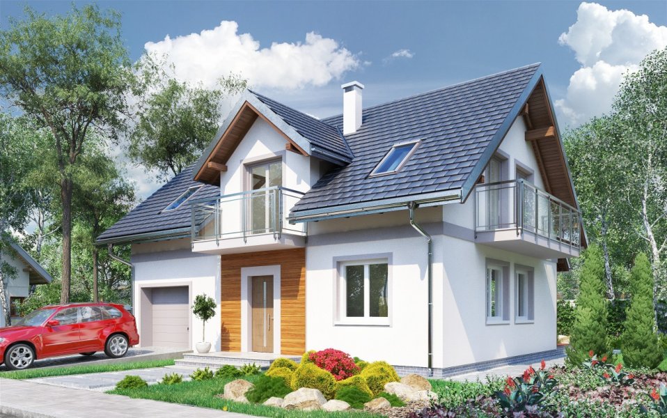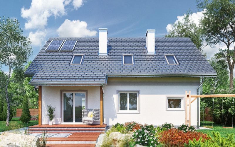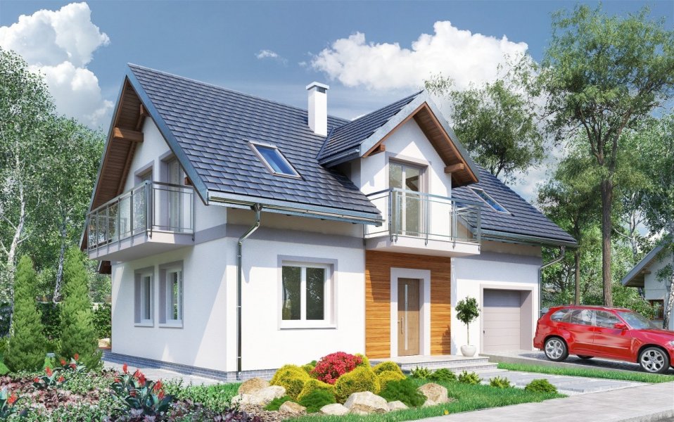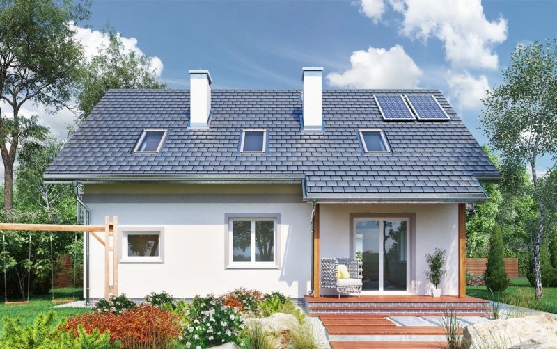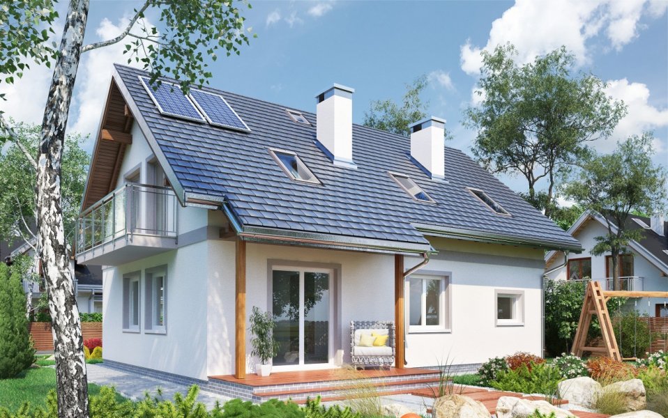 Rodzina Tarota to atrakcyjny wybór prostych, parterowych domów z użytkowym poddaszem z wbudowanym garażem, z przedziału wielkości ok. 100-145 m2 p.u. Wszystkie prezentują konsekwentnie zwarty, prostokątny rzut oraz wspólną, ekonomiczną konstrukcję dwuspadowego dachu nad częścią mieszkalną i garażową. Projekt domu Tarot Mini jest najmniejszym w rodzinie z dodatkowym pokojem przy salonie. Od zbliżonego powierzchnią Sambora Mobil odróżnia go lokalizacja kotłowni (za garażem) oraz mniej otwarty charakter strefy dziennej – kuchnię oddziela częściowo od salonu ścianka działowa. Balkony i akcentowanie frontu lukarną w dachu sprawiają, że projekt domu Tarot Mini stanowi kompromis między najbardziej ascetycznymi plastycznie i energooszczędnymi propozycjami (jak np. Skarbek As) a dekoracyjnymi sylwetkami podobnych wielkością i programem funkcjonalnym wariantów Zofii czy Zojki. Poddasze Tarota ma cztery sypialnie z dużą łazienką. Główną z nich, wyposażoną w garderobę, oddziela od pozostałych różnica poziomów.