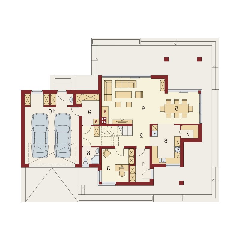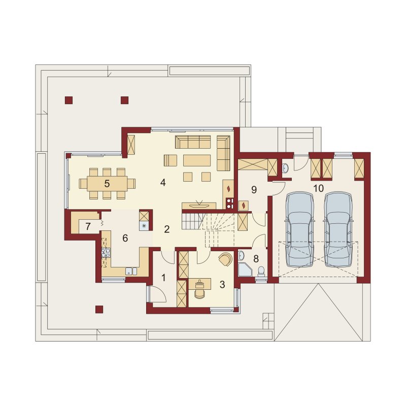 Jednym z głównych atutów Telmuna jest funkcjonalny układ wnętrza. Na parterze znajdziemy przestronny salon z przytulnym kominkiem połączony z ustawną jadalnią i tradycyjną w swoim układzie kuchnią z dużą spiżarnią. Kuchnię w ramach adaptacji można wydzielić zamykając ją ściankami działowymi, można także zmienić jej układ na wyspowy. Dodatkowo na tej kondygnacji znajduje się wygodny gabinet, który z racji pobliskiej ogólnodostępnej łazienki może pełnić funkcję pokoju gościnnego, ustawny wiatrołap z miejscem na dużą szafę wnękową, pomieszczenie gospodarcze pełniące funkcję kotłowni oraz garaż dwustanowiskowy.