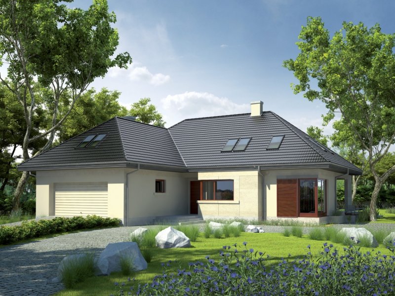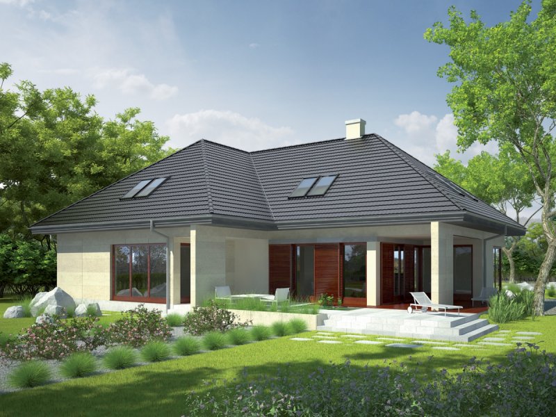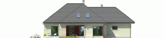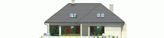 Dom parterowy z poddaszem użytkowym, niepodpiwniczony, przeznaczony dla 4-5-osobowej rodziny, z garażem dwustanowiskowym. Ogromnym atutem domu jest wygodna strefa dzienna - komfortowy salon z kominkiem, jadalnia oraz kuchnia. Na parterze, w odosobnionej części domu przewidziano osobny gabinet, w którym można w skupieniu poświecić się pracy. Dużą zaletą jest obszerna sypialnia z łazienką i garderobą. Na poddaszu zaprojektowano imponujący pokój wypoczynkowy w formie antresoli z widokiem na jadalnię. Strefę nocną tworzy duża sypialnia wraz z garderobą oraz dwa pokoje, w tym jeden z własną, dodatkową garderobą oraz łazienka. Na uwagę zasługuje częściowo zadaszony taras, otwarty z trzech stron na ogród. Zaciszną strefę wypoczynkową docenią wszyscy, którzy uwielbiają spędzać czas na świeżym powietrzu, blisko domu i blisko zieleni zarazem. Istnieją wersje projektu z inną lokalizacją kominka – dostępnym z tarasu oraz salonu - Teo II G2.