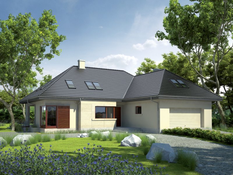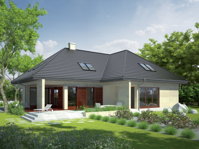 Dom zaprojektowany w technologii murowej ze stropem gęstożebrowym. Schody wewnętrzne drewniane. Dach o konstrukcji drewnianej pokryty dachówką ceramiczną Röben. Elewacje wykończono tynkiem mineralnym oraz okładziną kamienną. Cokół kamienny lub pokryty tynkiem akrylowym. Stolarka okienna drewniana lub PCV.