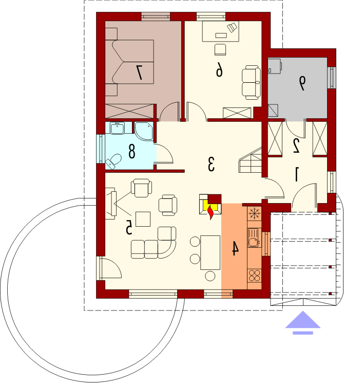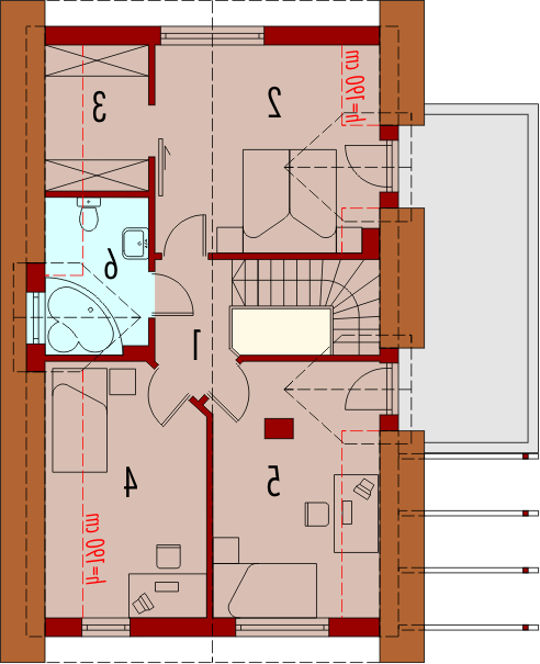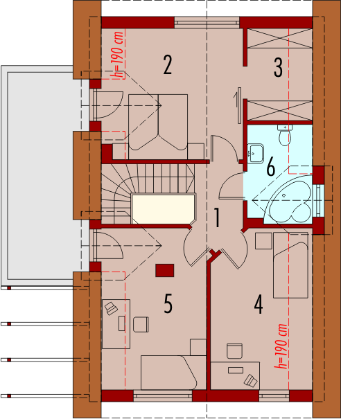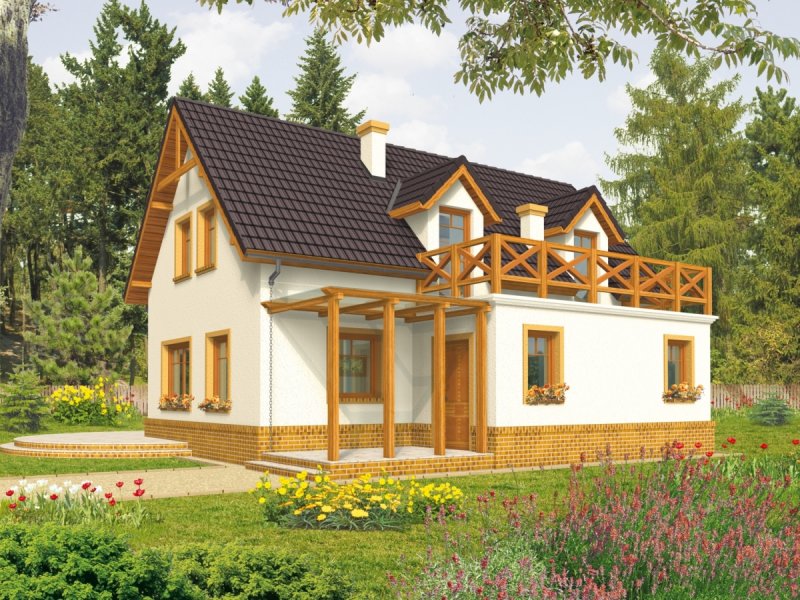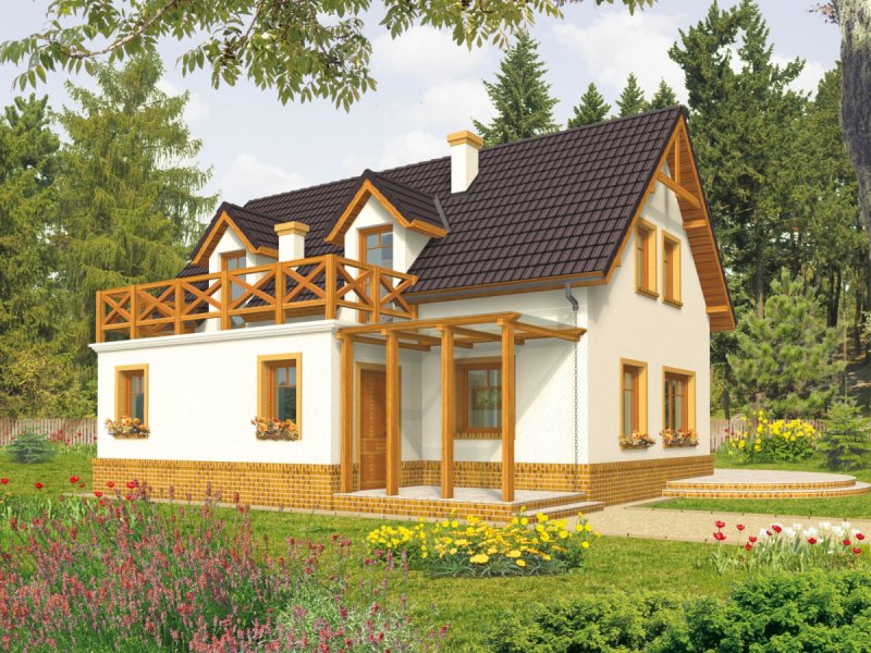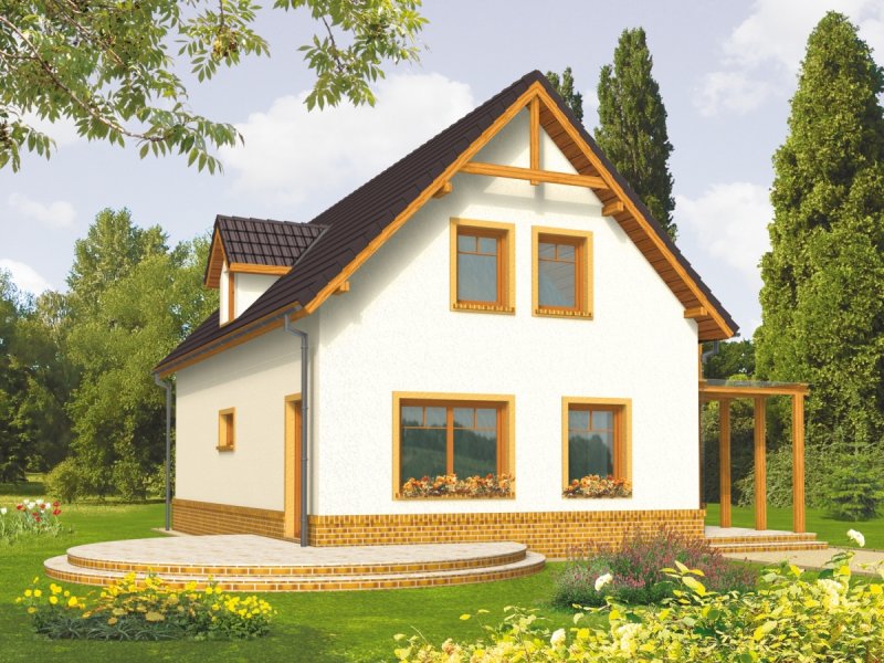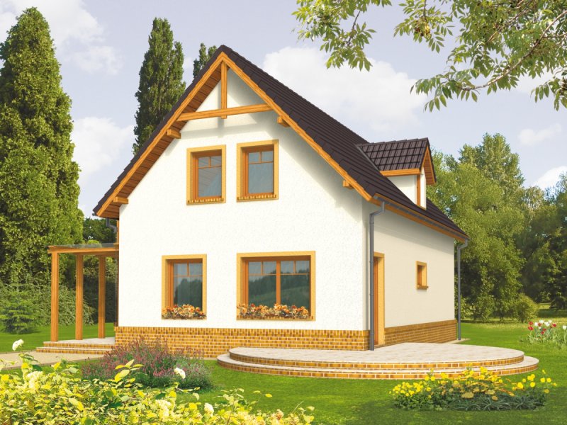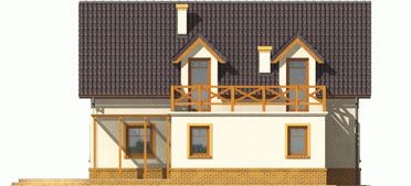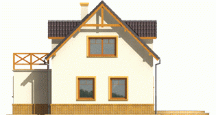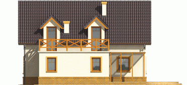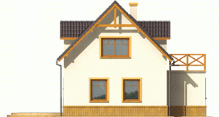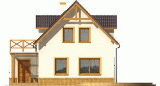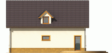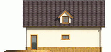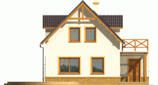 Dom parterowy z poddaszem użytkowym, niepodpiwniczony, bez garażu, przeznaczony dla 4-5-osobowej rodziny. Projekt o prostej konstrukcji, niedrogi w realizacji, przeznaczony jest na wąską działkę, z frontem od strony południowej. Na parterze mieści się pokój dzienny z otwartą kuchnią, gabinet, sypialnia z garderobą oraz mała łazienka. Na poddaszu znajdują się trzy sypialnie (jedna z garderobą) i łazienka. Istnieje wersja domu z wiatą garażową.