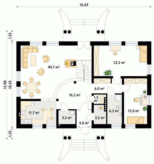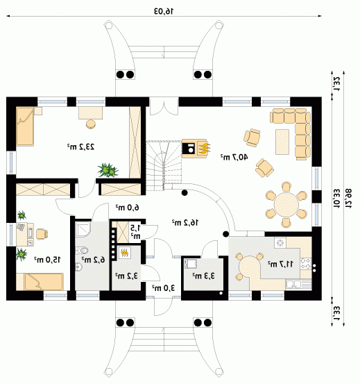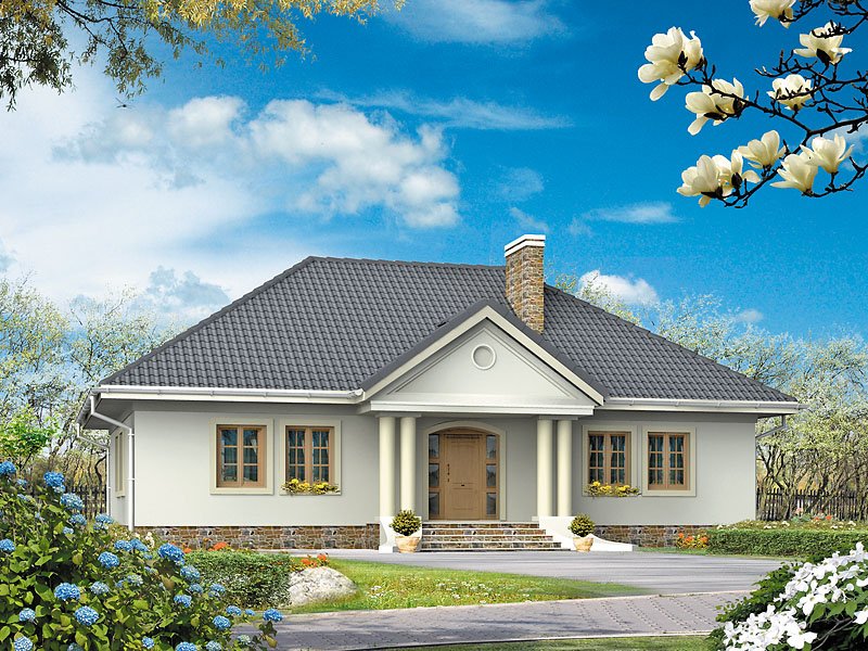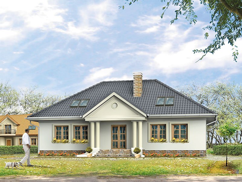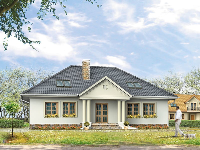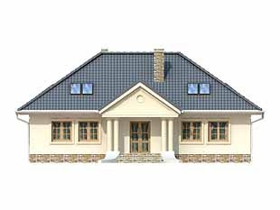 Dom jednorodzinny, wolno stojący, niepodpiwniczony z użytkowym poddaszem. Przeznaczony dla 4 – 5-osobowej rodziny. Zaprojektowany w stylu reprezentacyjnego dworku. Prosty w budowie, ekonomiczny w utrzymaniu. Wyraźny podział na strefę nocną i dzienną. Strefa robocza kuchni pozostaje niewidoczna z salonu.
