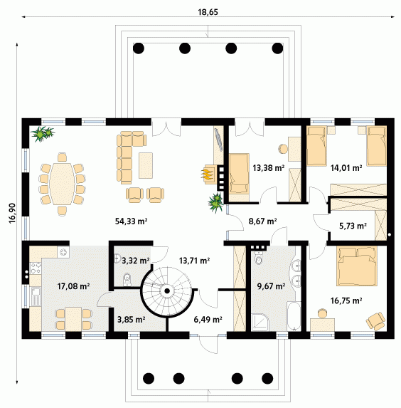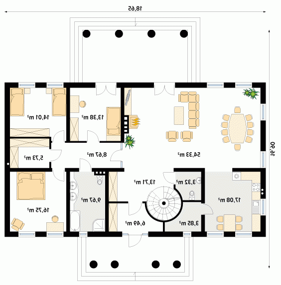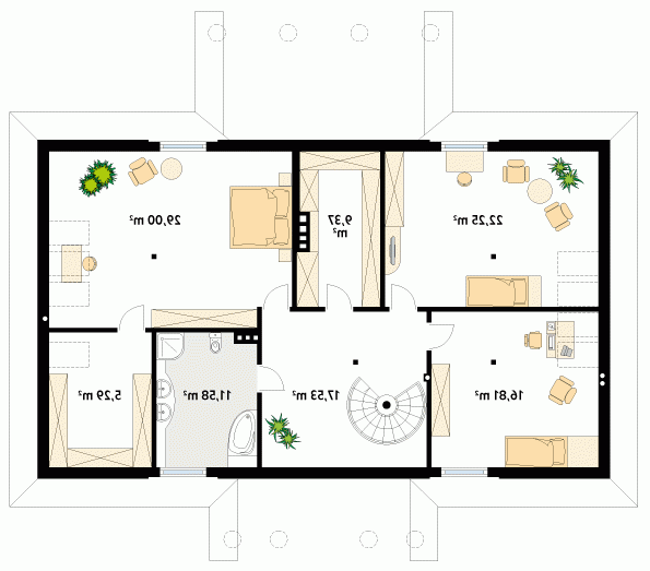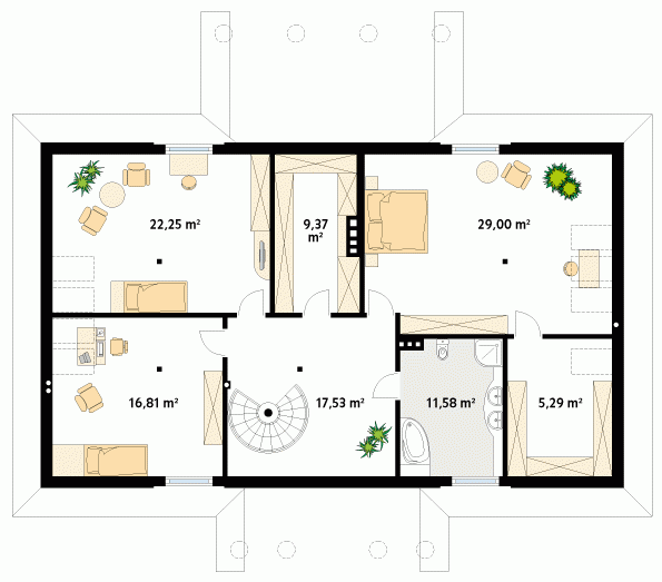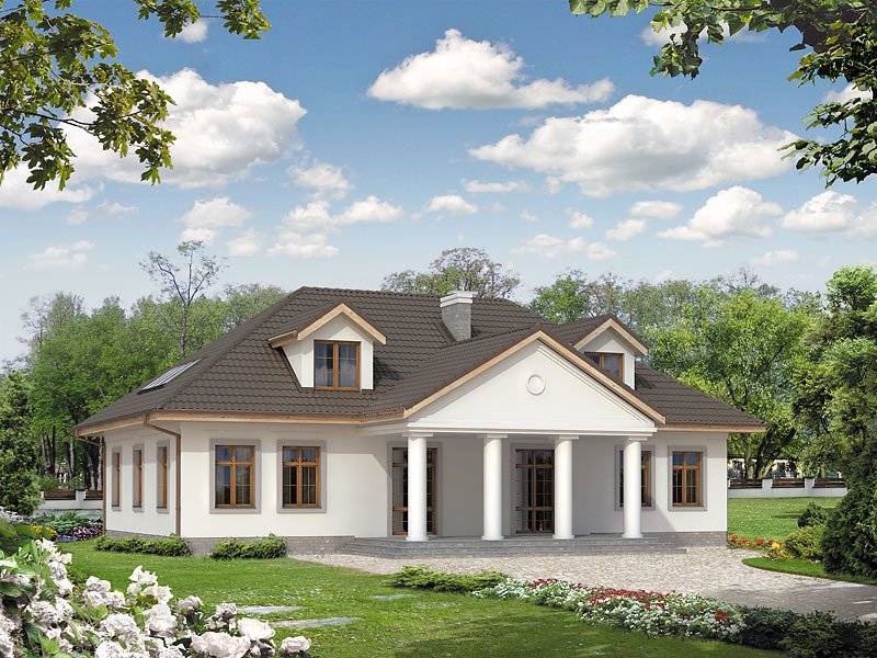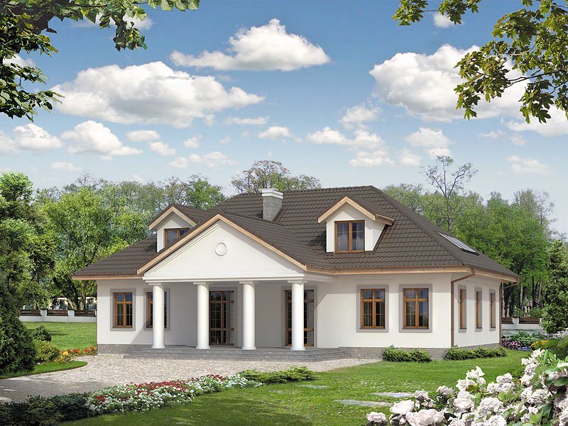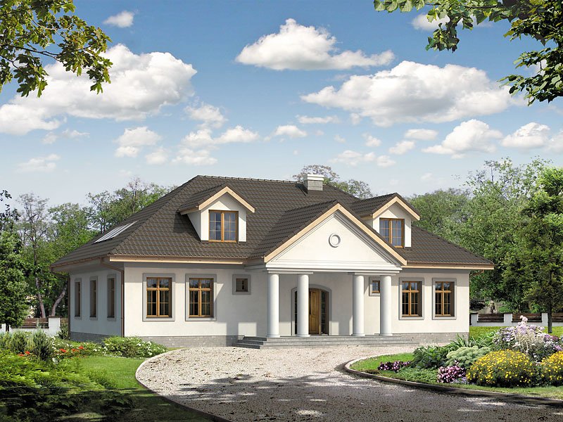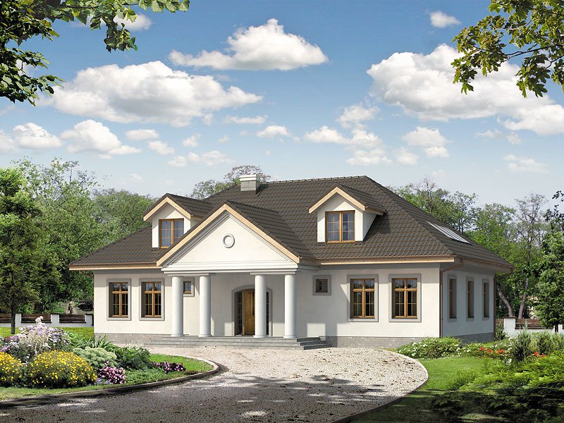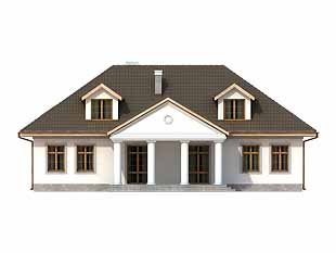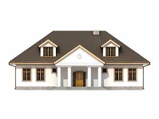 Dom jednorodzinny, wolno stojący, podpiwniczony z poddaszem użytkowym. Wygodny, przestronny dom przeznaczony dla licznej rodziny. Tradycyjna bryła o dworkowym charakterze. Posiada duży zadaszony taras.